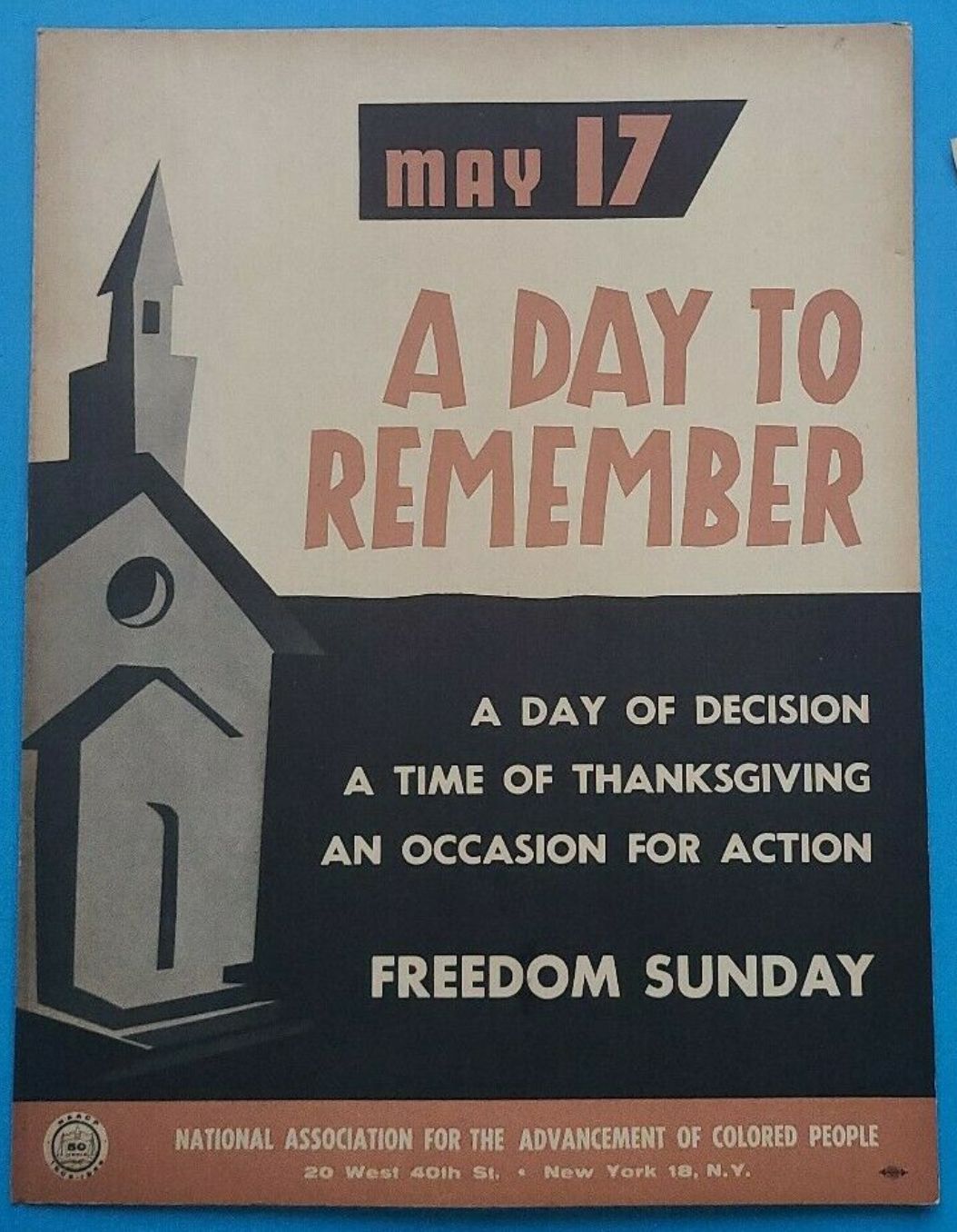 New York: NAACP, 1959. Poster on heavy card stock, 13 x 10 inches. Some foxing to edges, near fine condition overall. Near Fine. In 1959, to commemorate the fifth anniversary of the Brown vs. Board of Education decision, the NAACP coordinated a group of celebrations in churches throughout the country to celebrate Freedom Sunday. The effort, led by Reverend Edward J. Odom, Jr., the NAACP church Secretary, involved over 100 local chapters across the country. The celebrations on May 17th were a part of a larger coordinated campaign by the NAACP to register voters, raise funds, and engage in desegregation projects. Coverage in the mainstream press was scant, with several short articles on the celebrations appearing in a range of states including Michigan, Alabama and Indiana.