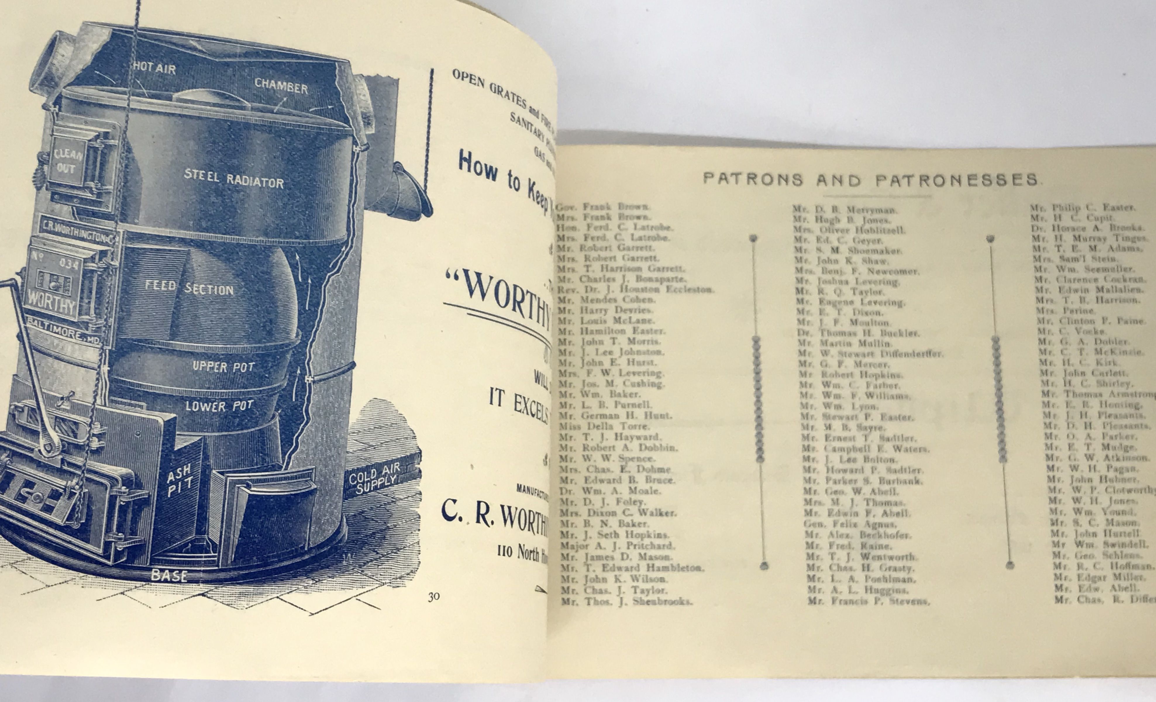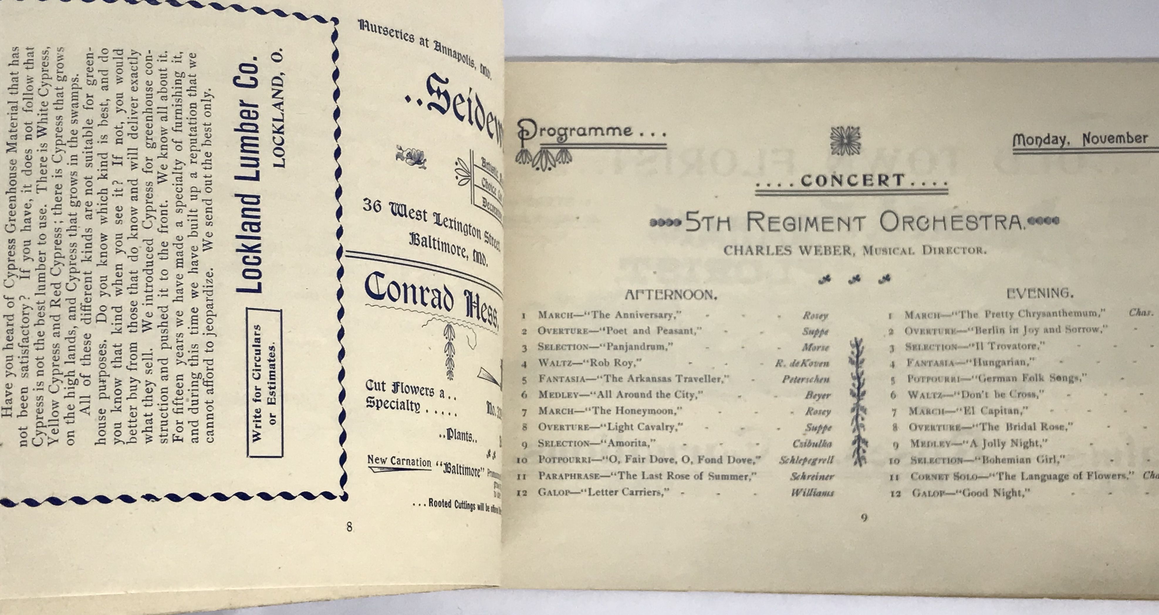 Baltimore: Thos. J Sheubrooks, 1896. Staplebound. Illustrated wraps. Good. 30 pages. 22 x 14 cm. Featuring illustrated local Baltimore advertising throughout. Introduction by Mr. Seidewitz, followed by six days of concerts by the 5th Regiment Orchestra, with Charles Weber - Musical Director. Rules of Governing the competition, award amounts and a full page listing the Patrons and Patronesses of the show. Covers rubbed at edges and lightly toned.