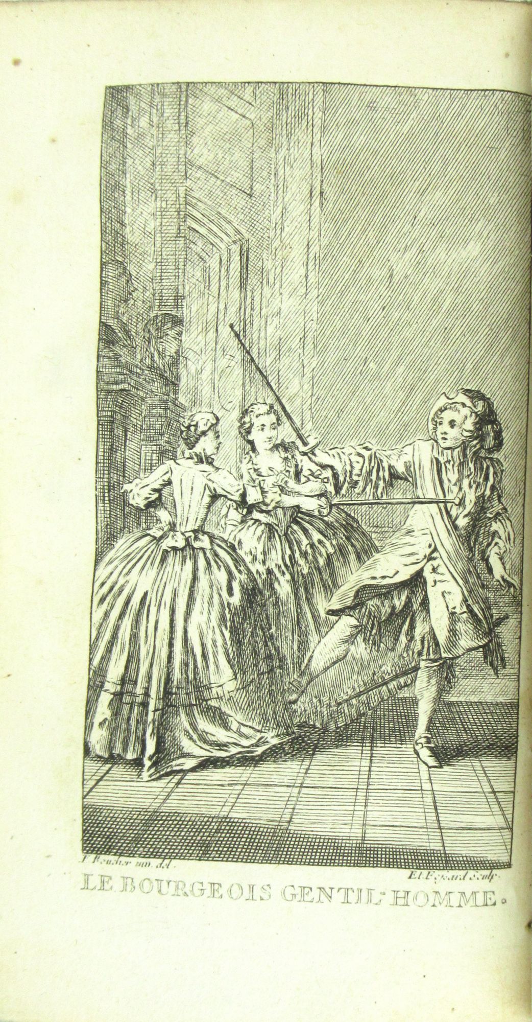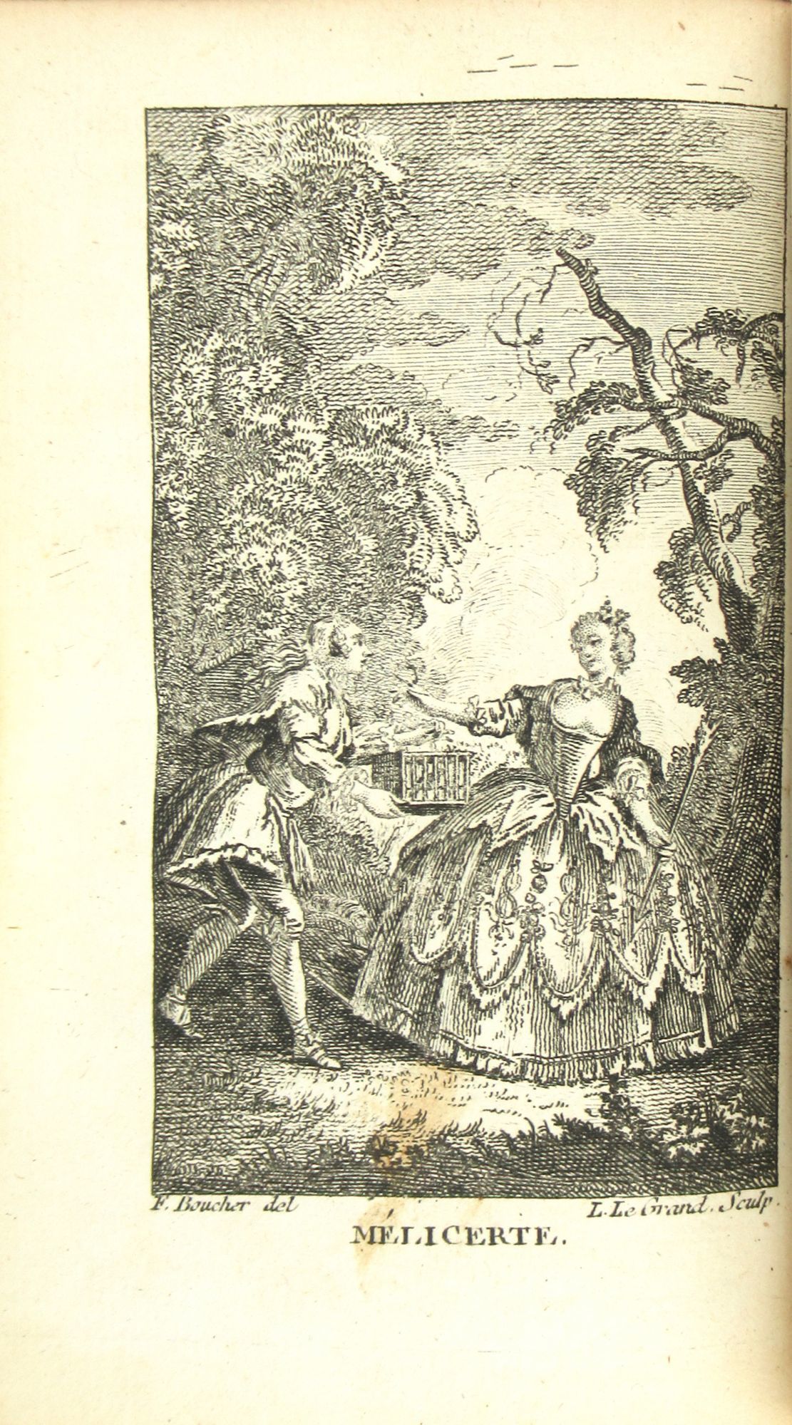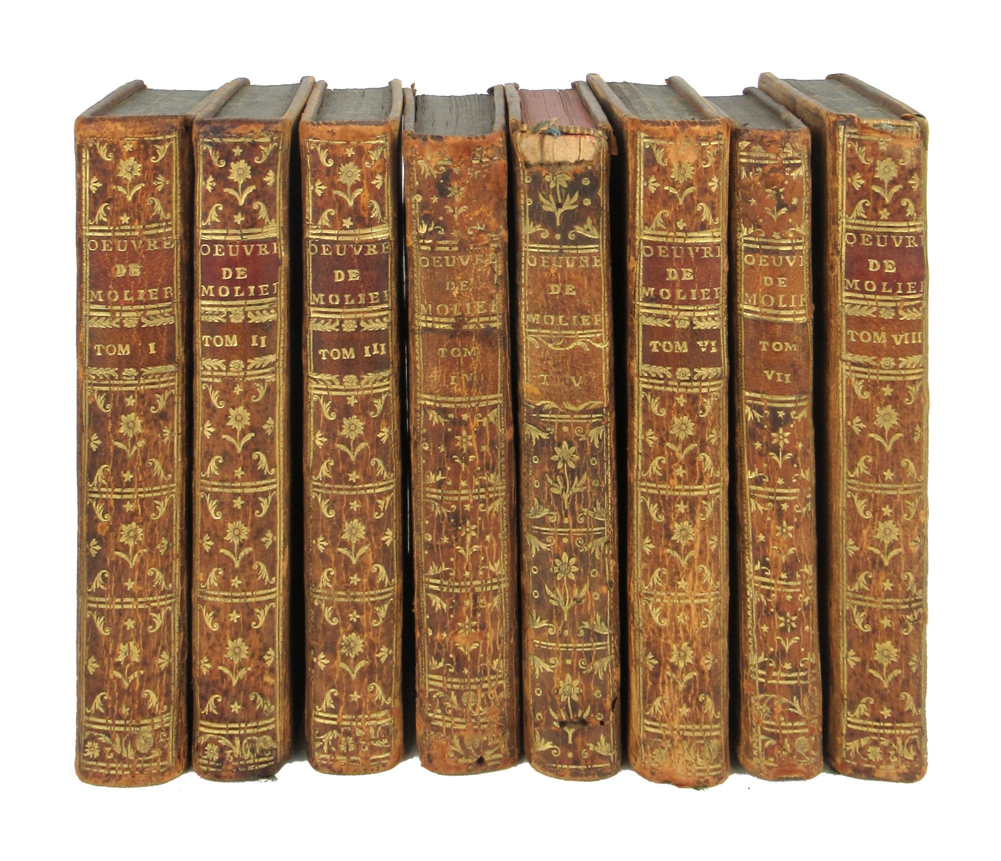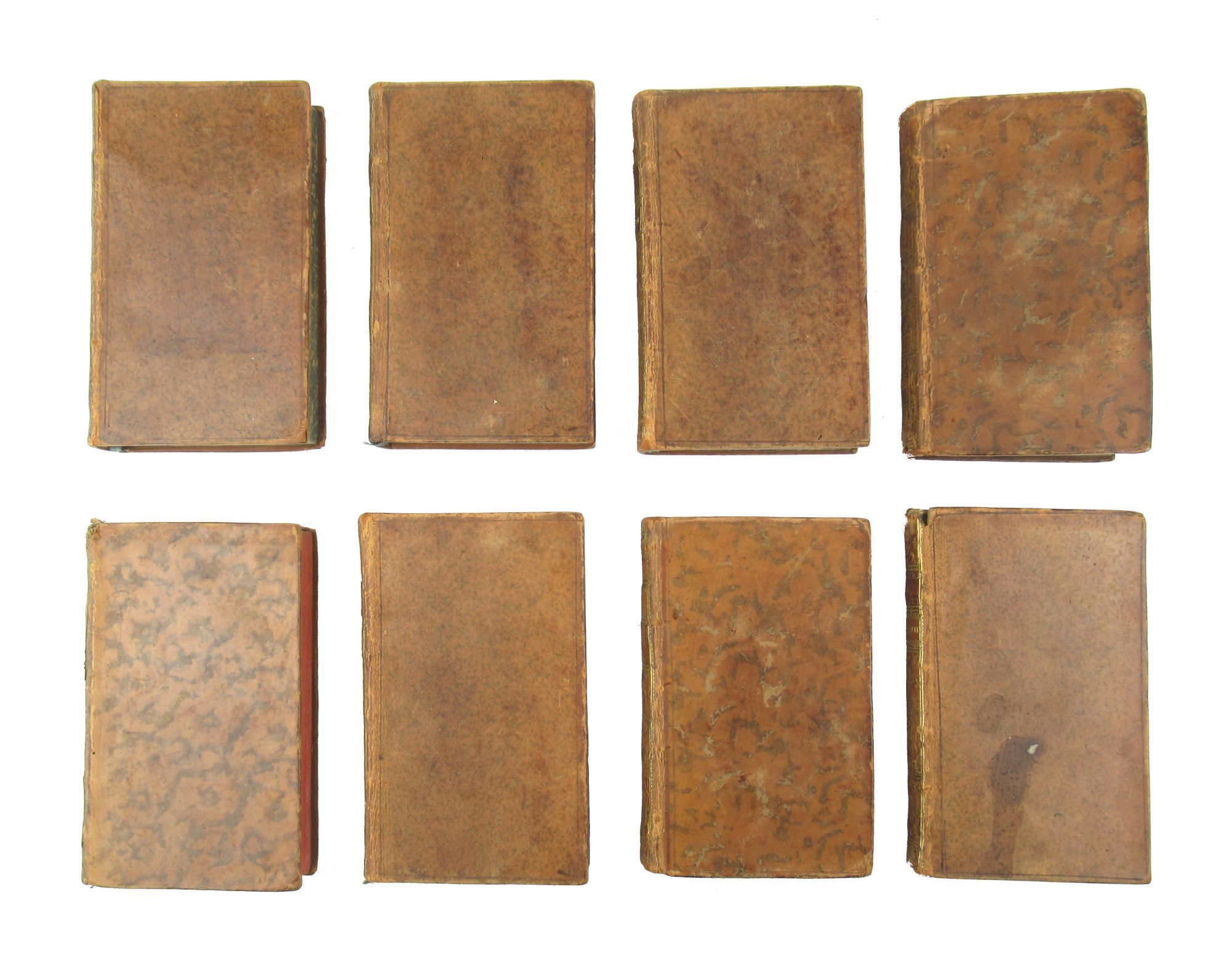 Paris: Grangé / Duchesne / Poirion, 1753. Very Good. Paris: Grangé / Duchesne / Poirion, 1750-1753. Eight volumes; 12mo (14.5cm.); near-uniformly bound in mottled calf, gilt spines with tan or brown gilt-lettered onlays, all edges marbled save those of Vol. V (edges stained red); thirty-one engraved plates signed in image by Rococo painter F. Boucher. Light scuffing to extremities, small loss at spine crown of Vol. V, else Very Good and sound, contents in just about fine condition, each volume collated and complete. Three early volumes with the contemporary ownership inscription of a Madame de Saint Simont, possibly Marie Gabrielle de Durfort, wife of Louis de Rouvroy, duc de Saint-Simon.