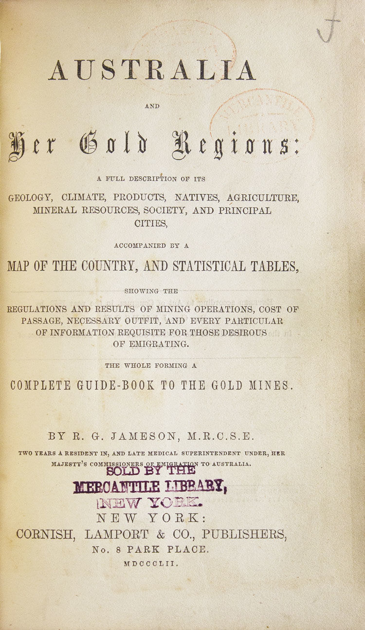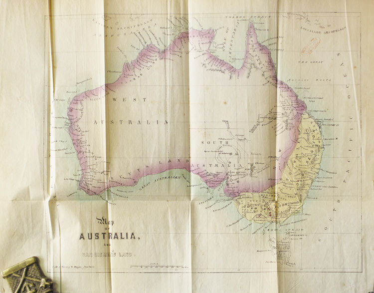 New York: Cornish, Lamport & Co., Publishers, 1852. First edition. Handcoloured folding map at front. iv, [5]-154 (+2 ads) pp. 1 vols. 8vo. Brown blind-stamped cloth. Spine ends chipped, else Fine. Ex-library stamps on map and title page, card pockets removed. First edition. Handcoloured folding map at front. iv, [5]-154 (+2 ads) pp. 1 vols. 8vo. Ferguson: "At this time the author was conducting an 'Australian Emigration Office' at 120 Wall Street, New York." Ferguson 10892 (2 copies P.L., N.S.W.)