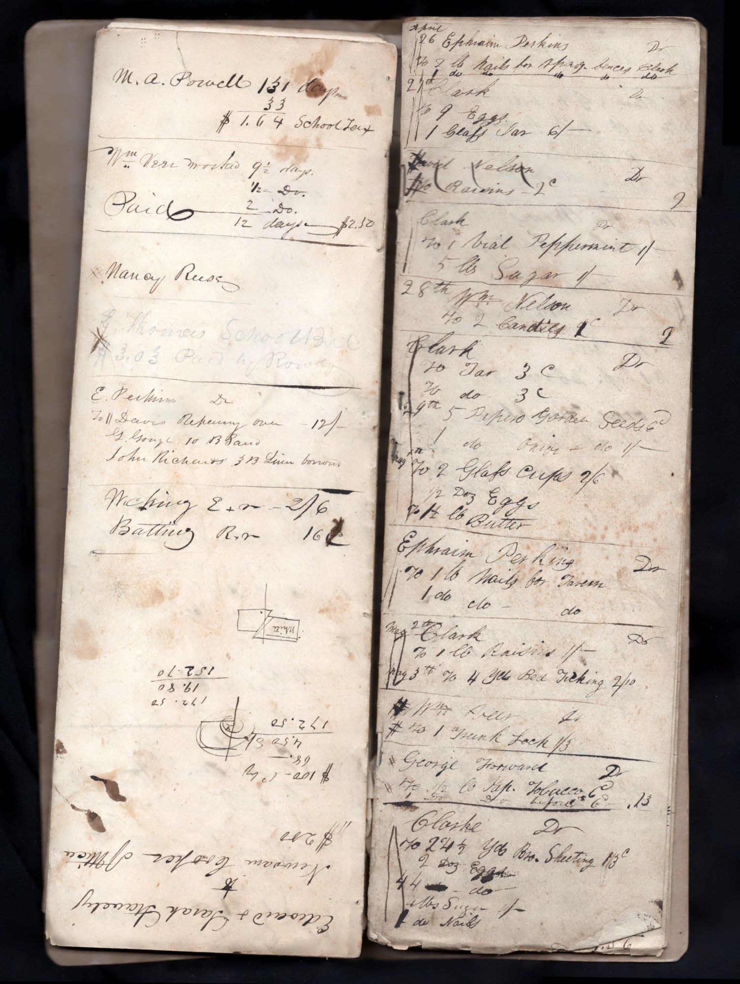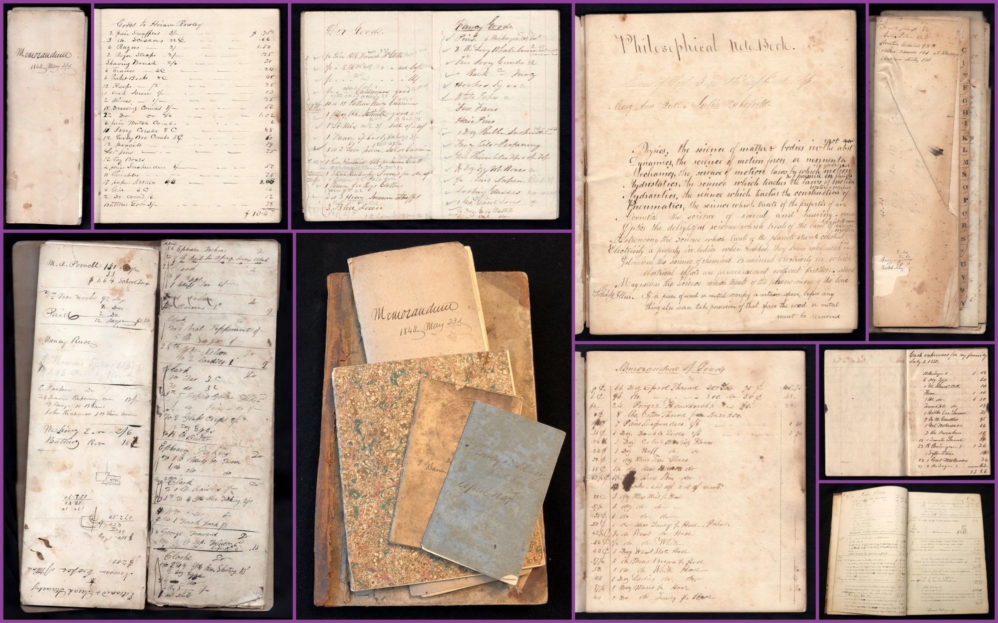 2)The third ledger with marbled stock wraps, begins with a Memorandum of Goods for the business, along with a few individual accounts and dates from 1834-1836. Next there are approximately ten (10) pages devoted to transactions between Warren and his brother, Hiram Rowley (1811-1841), as they trade by barter. The rest of the ledger is blank until the end, when reversed and used as a composition notebook for class. This section is entitled "Philosophical Notebook: Names of Pupils in Philosophical Class: Mary Ann Bull, Julia Wakefield". It is unclear how these two girls are related to Rowley, but most likely one his daughters and her friends used the book for notes. There are nine pages of notes relating to a variety of scientific fields such as Physics and Dynamics. Often times within the notes it states a scientific law, such as the law of motion, and then detailed out a small experiment or real word observation that proves the law. Marble covers. Approximately 1/4 filled. Measures 7 3/4" x 6 1/2". 3) The fourth ledger is entitled "Rowley & D. S. Curry Memorandum , April 1847" and includes inventory of their stock from their store in South Trenton, NY. The items are divided into the following categories: Groceries, Dairys [sic], Hardware, Crockery, Dry Goods, Fancy Goods, Hats & Caps, Shoes, and an untitled paper goods section. After this inventory are several pages of recordings of a variety of cash transactions both to individuals and other businesses. Blue wrappers. Stitched binding. Nearly completely filled. Measures 5 1/5" x 3 1/2".