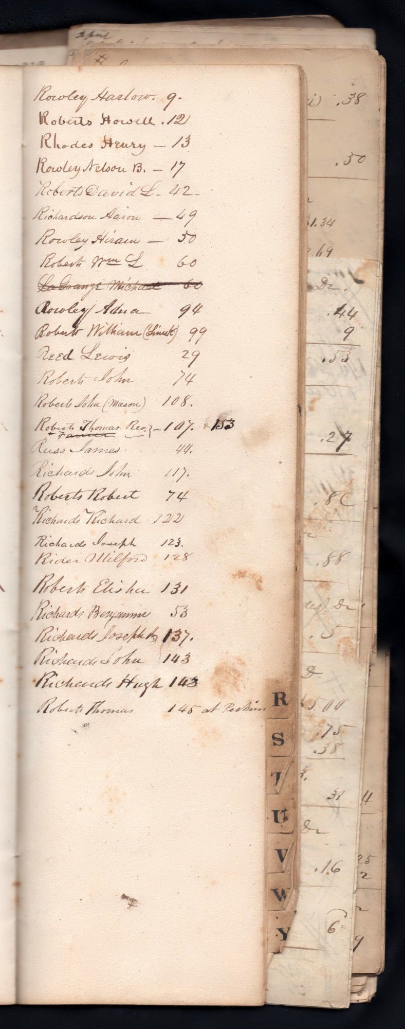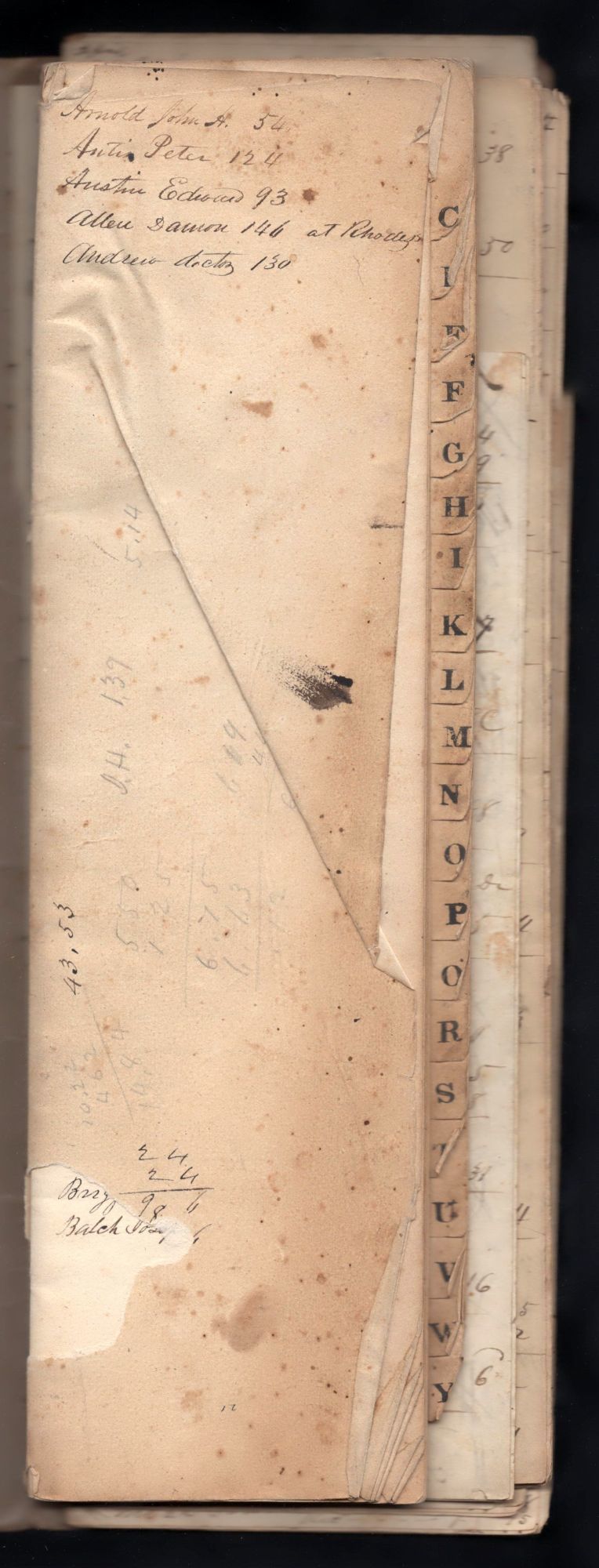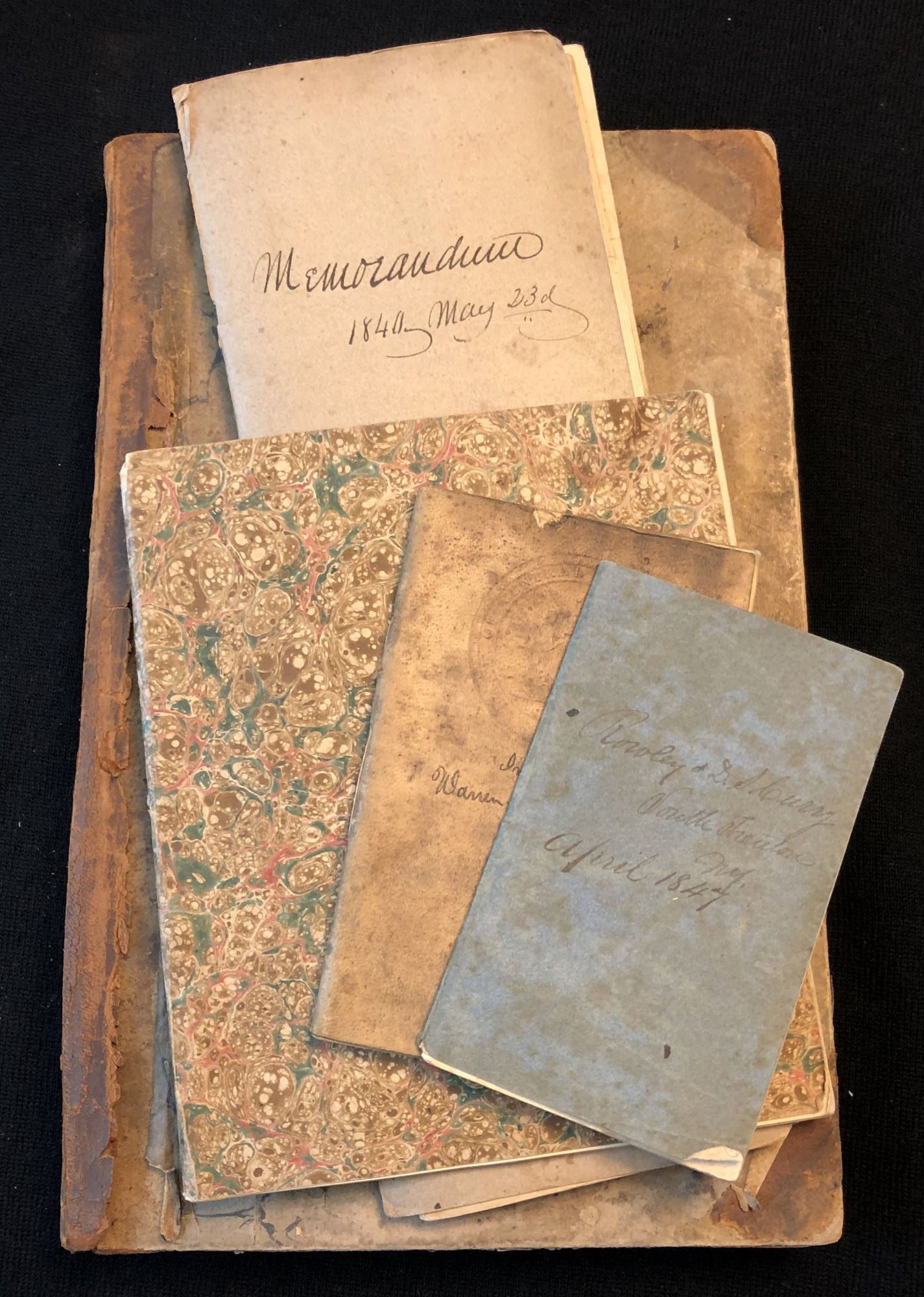 Trenton & Utica, NY, 1850. General wear and toning. Binding is loose with majority of pages detached for ledger with index.. A collection of five (5) ledgers belonging to Warren D. Rowley (1800-1854) Four (4) relate to his mercantile business and one with his personal finances. Rowley conducted business in Trenton and Utica, with his business partner, Daniel S. Curry (1820-1890), who was also his brother-in-law. The ledgers dates from 1834 to 1850. 1) A pair of related ledgers dating 1835 to 1841. The smaller ledger contains alphabetical index tabs listing Rowley & Curry's clients and corresponding page numbers. approx. 80 pgs, 10 are blank, They include the customer name, item purchased and cost. The items listed are for a variety of goods, such as: pocket knife, veal, shovel, oats, shoes, set of china, borax, and candle sticks. Both the index and the majority of the rest of the pages are loose or detached. Plain tan card stock covers. Measures 12 3/4" x 4 1/2". The corresponding ledger lists the accounts for each individual listed in the index. Interesting numbering system, hand numbered by Rowley, every other page, allowing a second page of accounting per customer. Includes 156 accounts and 312 pages with most pages filed. The accounts in this book record only the financial transaction's themselves, rather than the items sold. As such the majority of the entries list the name of the account holder, date of transaction, and a series of monetary numbers that appears to be interest added to the account of a period of time. Notes are made on the account when it is either paid in part or full. Several of both Rowley and Curry's relatives are listed in the ledger. Half bound leather and marbleized covers. Measures 12 1/2" x 8".