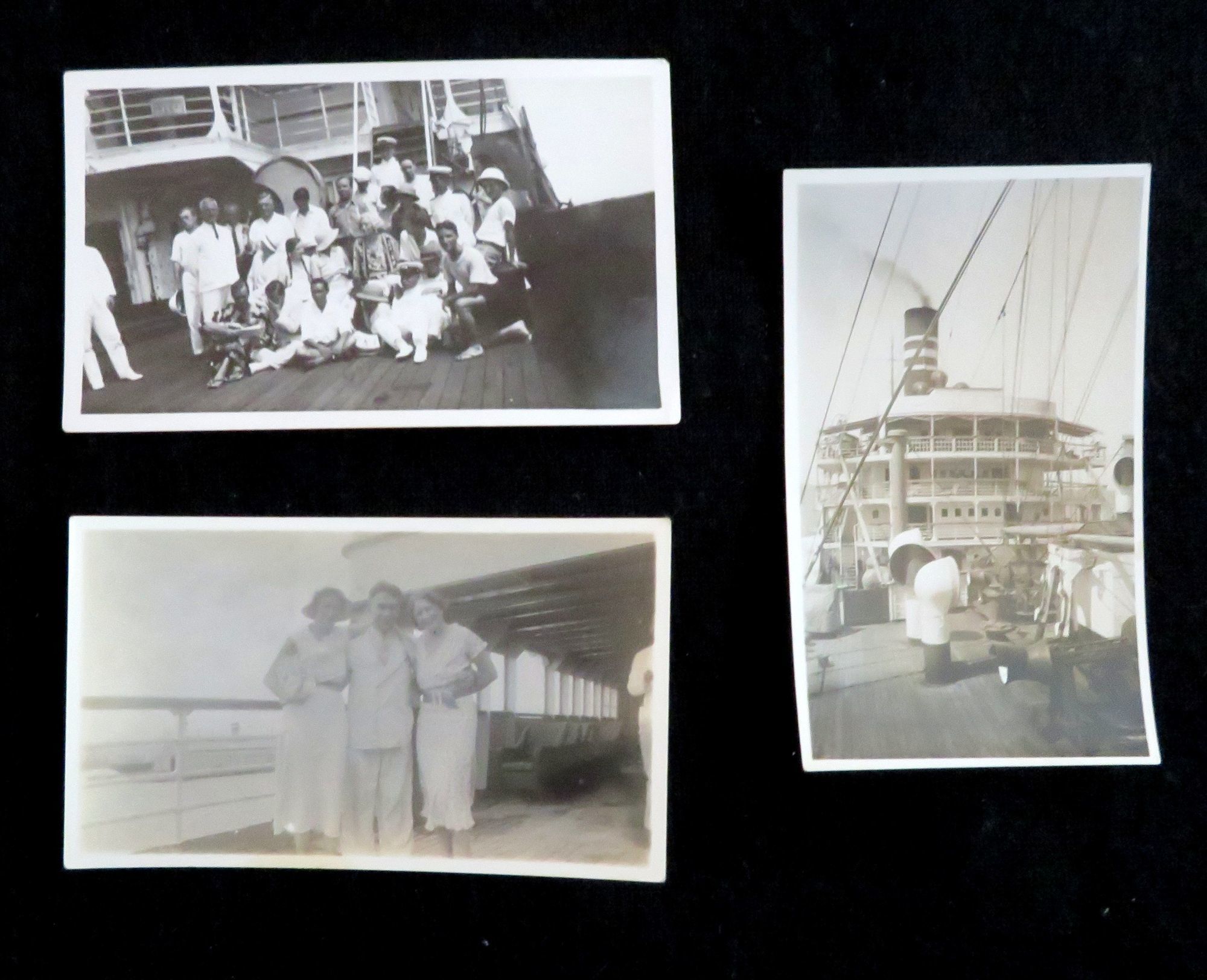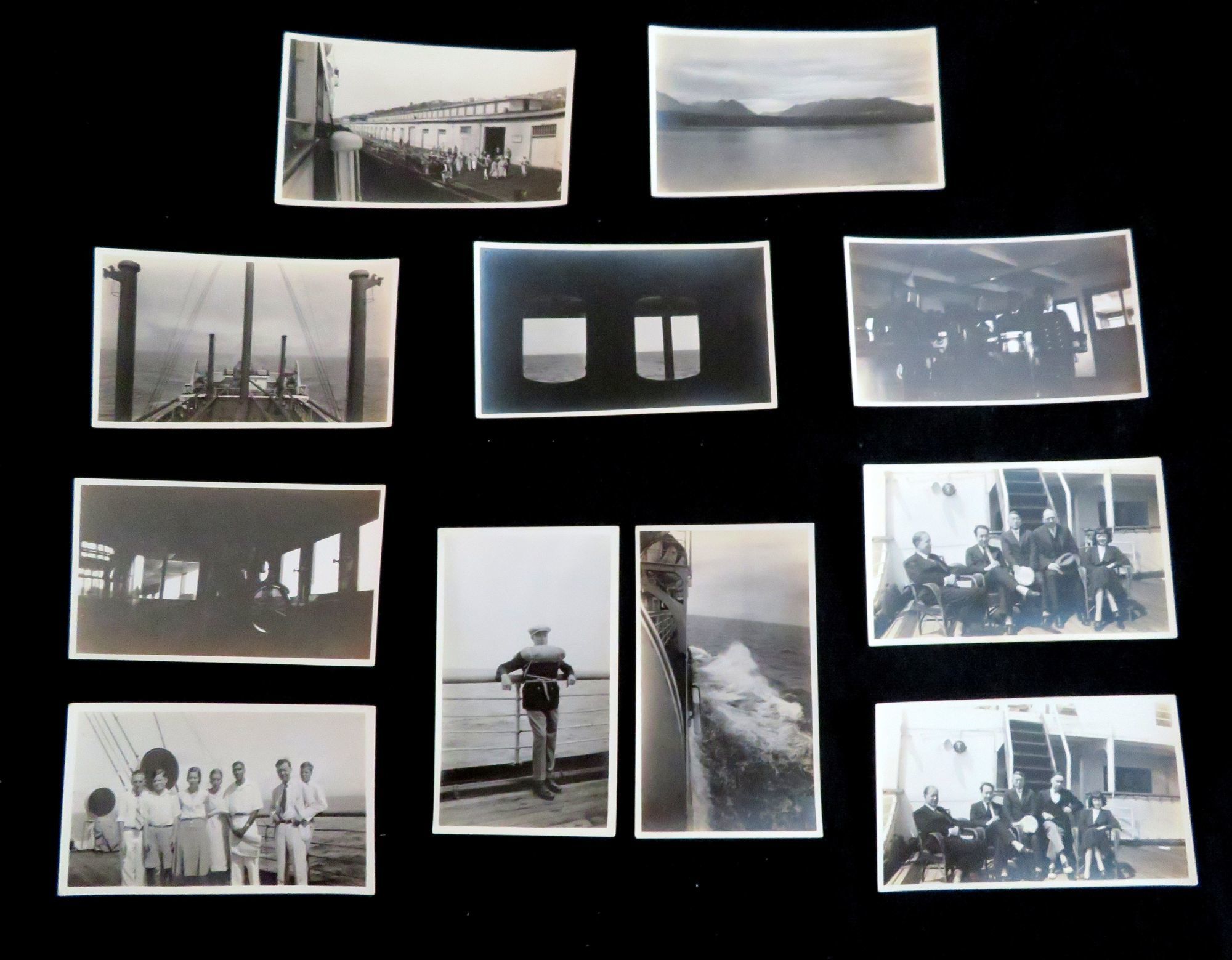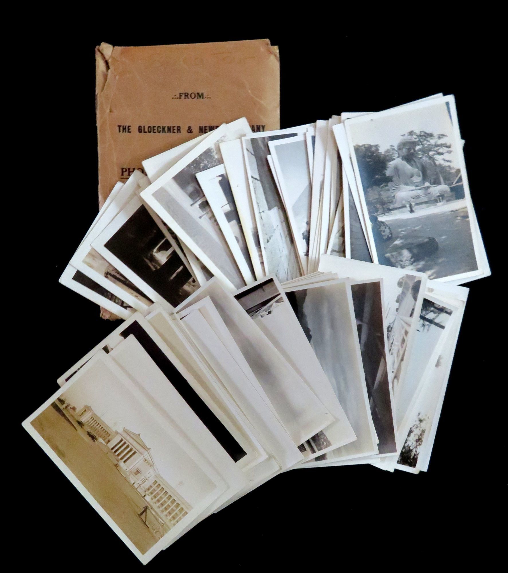 The World: Gloeckner & Newby Company, 1935. General wear. Some photographs are faded or clouded, it is unclear if they were exposed wrong initially or have become so over time. Envelope has minor tears, and edge wear.. A collection of seventy-one (71) black and white photographs of a Grand World Tour that went from America to Asia, the Middle East, Northern African, and Europe. The collection is dated to circa 1934-1935 as there are several pictures of the Sky Ride Towers, a ride at the 1933-1934 Chicago World's Fair, A Century of Progress. As there are little to no crowds in the photographs, they were most likely taken after the fair ended in October 1934 but prior to when the towers were demolished in August of 1935. A young man was traveling, based on captions identified as "myself" in the photographs. Most of the locations and people in the photographs have been identified on the back. The tour appears to have started in Chicago, IL, where a train was then taken Northwest, though Minneapolis to Glacier National Park in Montana, over the Rockies and to Seattle. There are fourteen (14) photographs from this portion of the trip, most from the train ride though the Rockies. From Seattle, he boarded the a ship call Heian Maru and sailed passed Vancouver on his way to Japan. There are eight (8) photographs (including two duplicates) from his time in Japan, of note are: The Great Buddha from Kamakura (where according to the description on the back there was a sign that says "No Photographing", which was obviously ignored), Hachiman Shrine in Kamakura, and the Imperial Palace in Tokyo. It is here that the exact route taken for the rest of the trip becomes unclear. Based on the information on the back of the photographs, he boarded another NYK Ocean Liner named the Hakozaki Manu (launched in 1922 and sunk in 1945 during WWII). There are two (2) photographs of his time on this ship. He toured other parts of Asia, such as China, Hong Kong, Philippines, Vietnam, and Singapore, before heading to the Middle East and Northern Africa. It is unknown if he took the Hakozaki Maru the whole way, or switched to another ship. For example, there is one (1) photograph in the collection of a group of three people on the "Grant", which may or may not be the SS President Grant (originally known as the Pine Tree State, and later renamed the USS Harris during WWII) which was an ocean liner that in the 1930s operated in the 'orient' first for the American Orient Lines and later the American Mail Lines. However the exact routes the ship serviced were unable to be identified. There are nine (9) photographs from his time in Asia, of note are: Hong Kong Harbor, University of Santo Tomas and the Santa Clara Convent in Manila, Saigon Notre Dame Cathedral, and the Singapore Harbor. Side note: There is one unidentified photograph included in this grouping that is most likely of Hong Kong, but that is unverified. As he continued on his journey he stopped in Sri Lanka, and there are two (2) photographs of Colombo, the largest city in Sri Lanka. From there he stopped briefly in Yemen, taking one (1) photograph of the Cisterns of Tawila, otherwise known as the Tawila Tanks in Aden, Yemen. He crossed through the Red Sea to the Mediterranean Sea, mostly likely through the Suez Canal, but the only photograph in the collection from this portion of the trip: it is a single (1) photograph of him on the bow of the ship in the middle of the Red Sea at noon with a young boy. There are five (5) photographs of his time in Egypt with the Great Pyramids and the Sphinx. After Egypt, he most likely sailed across the Mediterranean Sea to Italy, more specially Pompeii, where there are two (2) photographs of him in the ruins of Pompeii. He then passed through the Strait of Gibraltar, proven by two (2) photographs in the collection, one of the Rock of Gibraltar and the other from inside the Spanish section of the town of Gibraltar itself. Next stop was France, where he spent some time in Paris, Marseille, and Rouen. There are six (6) photographs of his time in France, of note: Notre Dame, Place de la Concorde, and the Arc de Triomphe in Paris, and the Gros Horloge and the site of Joan of Arc's execution in Rouen. The last stop on his journey was England, where he went to London and Winchester. There are five (5) photographs from his time in England including Westminster Abbey, Whitehall, and Winchester College and its War Cloister (a war memorial). He traveled home to America on the RMS Berengaria, mostly like to New York City. The Berengaria was an ocean liner built and launched as the Imperator in 1913 by the Hambur-Amerika Line. She was given to England as reparation for the sinking of the Lusitania and sold to the Cunard Line (who merged with the White Star Line in 1934) and renamed the Berengaria. She served as a transatlantic ocean liner sailing between Southampton, England and New York until she caught fire in 1938 and was shortly thereafter scrapped. There are two (2) photographs the collection of the journey on the Berengaria, one of her deck, and the other of a boxing match taking place for entertainment. The photographs themselves come in an official envelope from the developers, Gloeckner & Newby Company in New York, NY. Measures 4 1/2" x 2" (photographs), 6 3/4" x 4 1/2" (envelope).