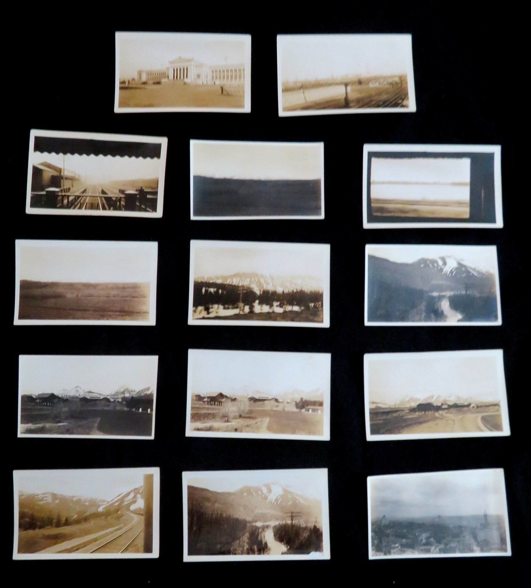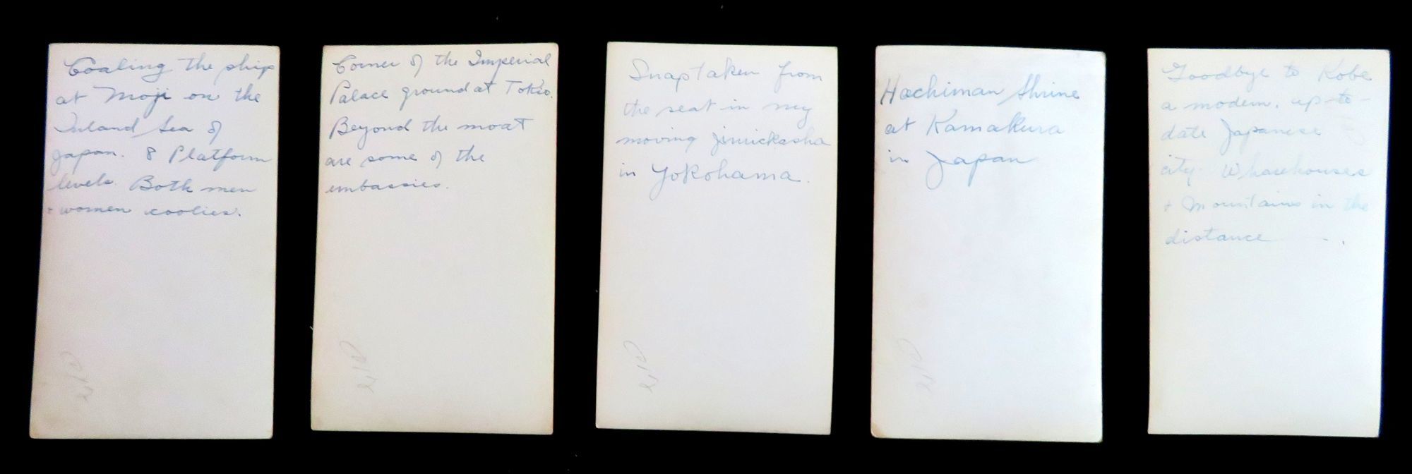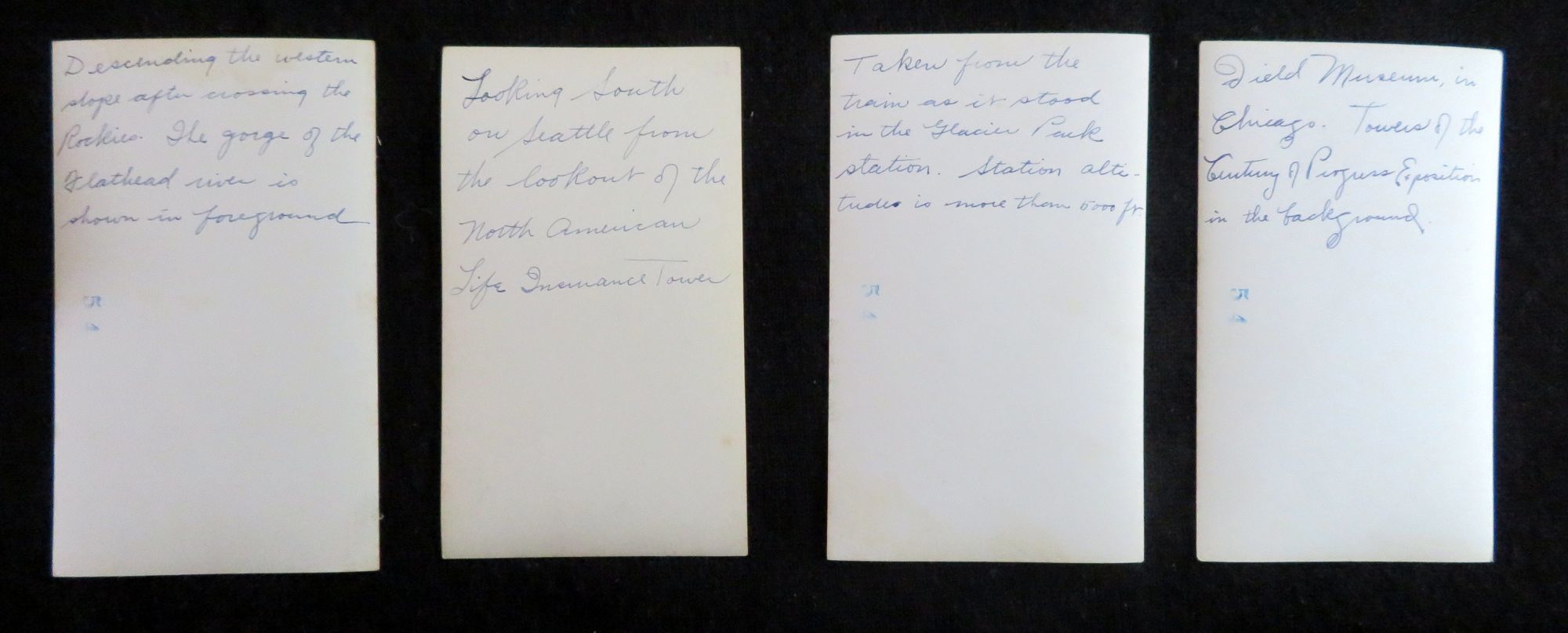 The World: Gloeckner & Newby Company, 1935. General wear. Some photographs are faded or clouded, it is unclear if they were exposed wrong initially or have become so over time. Envelope has minor tears, and edge wear.. A collection of seventy-one (71) black and white photographs of a Grand World Tour that went from America to Asia, the Middle East, Northern African, and Europe. The collection is dated to circa 1934-1935 as there are several pictures of the Sky Ride Towers, a ride at the 1933-1934 Chicago World's Fair, A Century of Progress. As there are little to no crowds in the photographs, they were most likely taken after the fair ended in October 1934 but prior to when the towers were demolished in August of 1935. A young man was traveling, based on captions identified as "myself" in the photographs. Most of the locations and people in the photographs have been identified on the back. The tour appears to have started in Chicago, IL, where a train was then taken Northwest, though Minneapolis to Glacier National Park in Montana, over the Rockies and to Seattle. There are fourteen (14) photographs from this portion of the trip, most from the train ride though the Rockies. From Seattle, he boarded the a ship call Heian Maru and sailed passed Vancouver on his way to Japan. There are eight (8) photographs (including two duplicates) from his time in Japan, of note are: The Great Buddha from Kamakura (where according to the description on the back there was a sign that says "No Photographing", which was obviously ignored), Hachiman Shrine in Kamakura, and the Imperial Palace in Tokyo. It is here that the exact route taken for the rest of the trip becomes unclear. Based on the information on the back of the photographs, he boarded another NYK Ocean Liner named the Hakozaki Manu (launched in 1922 and sunk in 1945 during WWII). There are two (2) photographs of his time on this ship. He toured other parts of Asia, such as China, Hong Kong, Philippines, Vietnam, and Singapore, before heading to the Middle East and Northern Africa. It is unknown if he took the Hakozaki Maru the whole way, or switched to another ship. For example, there is one (1) photograph in the collection of a group of three people on the "Grant", which may or may not be the SS President Grant (originally known as the Pine Tree State, and later renamed the USS Harris during WWII) which was an ocean liner that in the 1930s operated in the 'orient' first for the American Orient Lines and later the American Mail Lines. However the exact routes the ship serviced were unable to be identified. There are nine (9) photographs from his time in Asia, of note are: Hong Kong Harbor, University of Santo Tomas and the Santa Clara Convent in Manila, Saigon Notre Dame Cathedral, and the Singapore Harbor. Side note: There is one unidentified photograph included in this grouping that is most likely of Hong Kong, but that is unverified. As he continued on his journey he stopped in Sri Lanka, and there are two (2) photographs of Colombo, the largest city in Sri Lanka. From there he stopped briefly in Yemen, taking one (1) photograph of the Cisterns of Tawila, otherwise known as the Tawila Tanks in Aden, Yemen. He crossed through the Red Sea to the Mediterranean Sea, mostly likely through the Suez Canal, but the only photograph in the collection from this portion of the trip: it is a single (1) photograph of him on the bow of the ship in the middle of the Red Sea at noon with a young boy. There are five (5) photographs of his time in Egypt with the Great Pyramids and the Sphinx. After Egypt, he most likely sailed across the Mediterranean Sea to Italy, more specially Pompeii, where there are two (2) photographs of him in the ruins of Pompeii. He then passed through the Strait of Gibraltar, proven by two (2) photographs in the collection, one of the Rock of Gibraltar and the other from inside the Spanish section of the town of Gibraltar itself. Next stop was France, where he spent some time in Paris, Marseille, and Rouen. There are six (6) photographs of his time in France, of note: Notre Dame, Place de la Concorde, and the Arc de Triomphe in Paris, and the Gros Horloge and the site of Joan of Arc's execution in Rouen. The last stop on his journey was England, where he went to London and Winchester. There are five (5) photographs from his time in England including Westminster Abbey, Whitehall, and Winchester College and its War Cloister (a war memorial). He traveled home to America on the RMS Berengaria, mostly like to New York City. The Berengaria was an ocean liner built and launched as the Imperator in 1913 by the Hambur-Amerika Line. She was given to England as reparation for the sinking of the Lusitania and sold to the Cunard Line (who merged with the White Star Line in 1934) and renamed the Berengaria. She served as a transatlantic ocean liner sailing between Southampton, England and New York until she caught fire in 1938 and was shortly thereafter scrapped. There are two (2) photographs the collection of the journey on the Berengaria, one of her deck, and the other of a boxing match taking place for entertainment. The photographs themselves come in an official envelope from the developers, Gloeckner & Newby Company in New York, NY. Measures 4 1/2" x 2" (photographs), 6 3/4" x 4 1/2" (envelope).