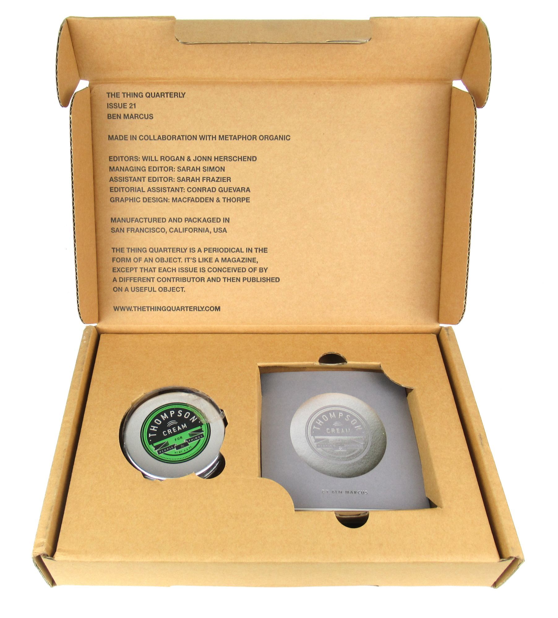 From publisher's website: "Issue 21 is by experimental novelist Ben Marcus. The issue includes a limited-run tin of Thompson Cream - a salve for people and things - as well as an accompanying booklet containing a short story by Marcus. The story traces the disturbing origins of Thompson Cream: 'A child was sick in Kansas. He had fever. His father prodded him awake, dressed him in gear, lead him outside in the dark morning for chores,' read the first few lines.