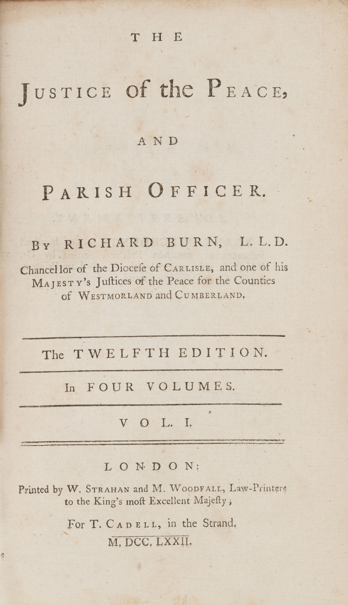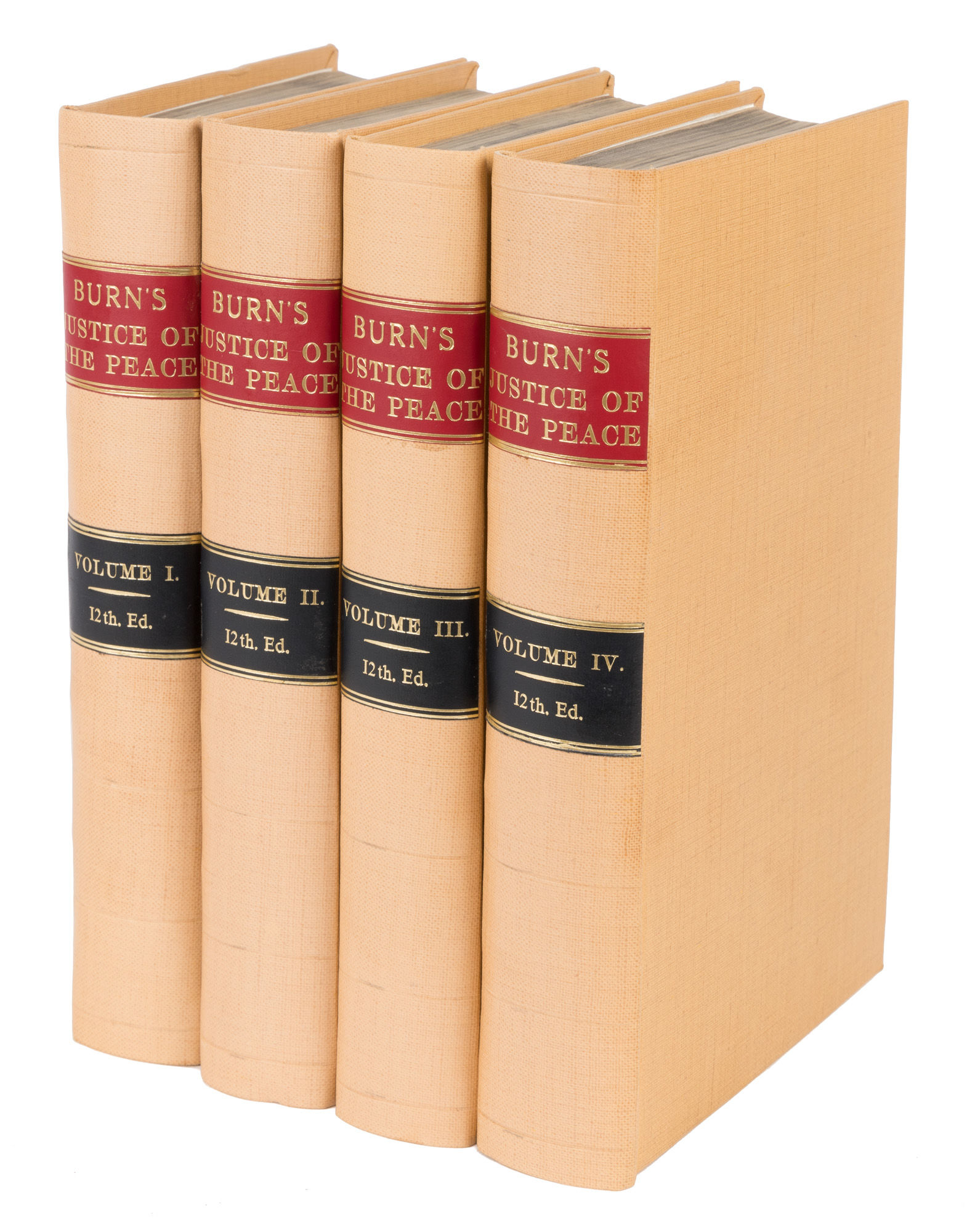 1772. 4 Volumes. London, 1772. 4 Volumes. London, 1772. A Handsome Edition of Burn's Justice Burn, Richard [1709-1785]. The Justice of the Peace, and Parish Officer. London: Printed by W. Strahan and M. Woodfall, 1772. Four volumes. Octavo (8-1/2" x 5-1/2"). Recent cloth, blind fillets and red and black calf lettering pieces to spines, endpapers renewed. Moderate toning, light foxing and soiling in a few places, early owner signatures to front endleaves of Volumes I, III and IV. A handsome set. $500. * Twelfth edition. A remarkably durable work, Burn's Justice went through 30 editions from 1755 to 1869. It covers such topics as Accessory, Alehouses, Aliens, Assault and Battery, Bail (By Writ of habeas Corpus), Bankrupt, Banks for Savings (Rules and Regulations), Burglary, Clergy, Dogs, Evidence, Excise and Customs, Fish and Fisheries, Forfeiture, Forgery, Game, Homicide, Indictment, Jurors, Libel, Oaths, Insolvent Debtors, Polygamy, Poor Law, Promissory Notes, Rape, Riot, Robbery, Taxes, Vagrants and much more. Holdsworth notes that "a perusal of these headings tells us something of the development of the system of local government" during the time of the book's publication. Holdsworth, A History of English Law X:162. English Short-Title Catalogue T140359.