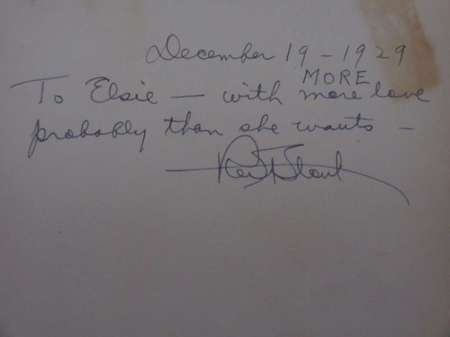 New York: The Vanguard Press, 1929. First Edition. Very Good/Good. Octavo, 313 pages; publisher's purple cloth fading at edges; light wear at spine ends. Pictorial dust jacket, with $2.50 price on front flap. INSCRIBED on ffep thus: "December 19 - 1929 / To Elsie - with more love / probably than she wants - / Rex Stout" - light off-setting to end papers, top edges stained dark green. First printing. Dust jacket is worn, scuffed and chipped.
