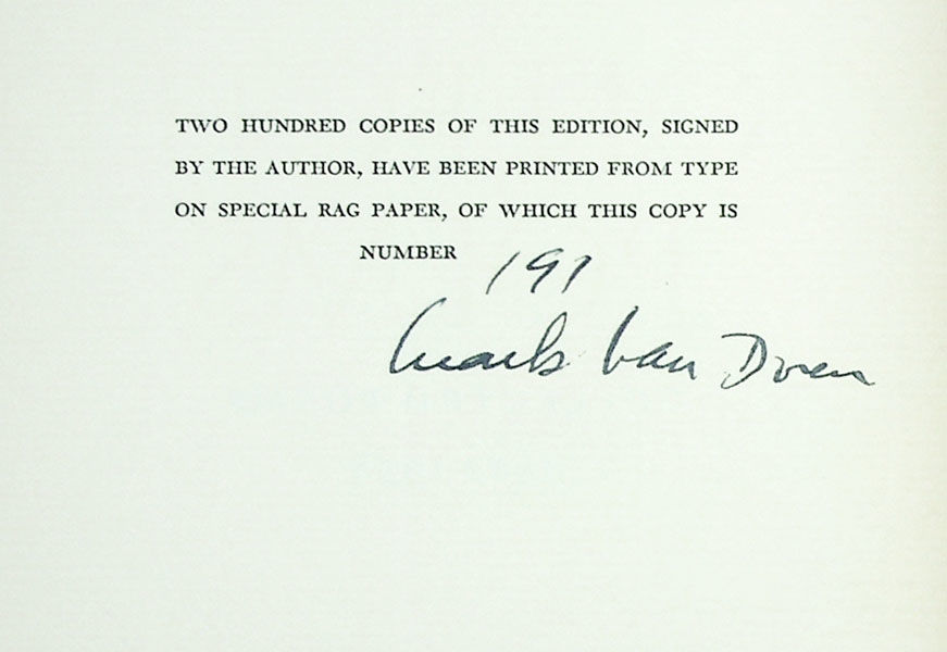 New York: Henry Holt, 1939. First Edition. Limited issue # 191 of 200 copies specially bound and signed by the author. Octavo. (24.5cm); tan buckram; blocked and titled in brown and gilt on spine and front cover; brown topstain; deckle edges; 384pp. Previous owner's embossed stamp on title page; hint of sunning to spine, with a faint scratch to lower edge of textblock. Near Fine, without dustjacket, as issued. Winner of the 1940 Pulitzer Prize for Poetry.