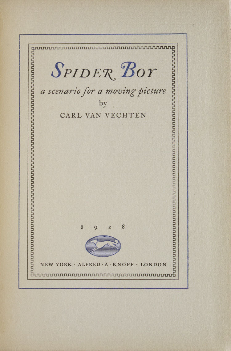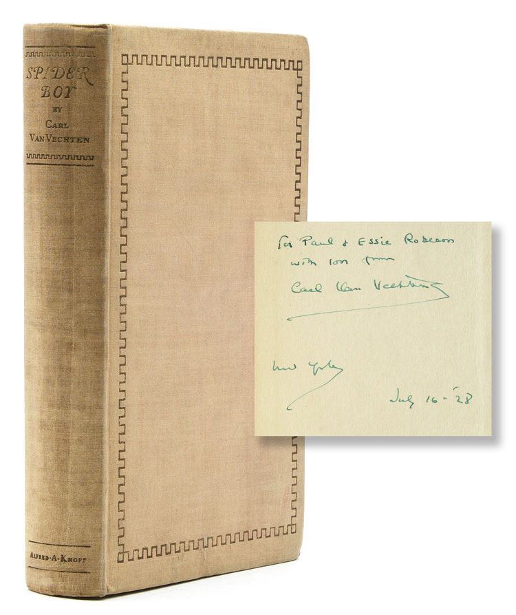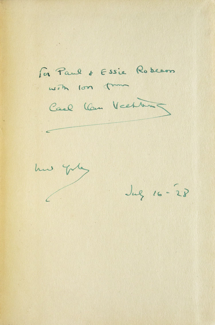 Presentation copy, inscribed on the front free endpaper: " For Paul & Essie Robeson with love from Carl Van Vechten / New York July 16 '28." Van Vechten was astounded by the explosion of artistic creativity in Harlem in the 1920s, and was at the vanguard of promoting Harlem Renaissance figures, including Robeson, Langston Hughes, Ethel Waters, Richard Wright, Zora Neale Hurston, and Wallace Thurman. Van Vechten's photographs of Robeson are among the earliest of the artist, and went far to establish his identity with the public.