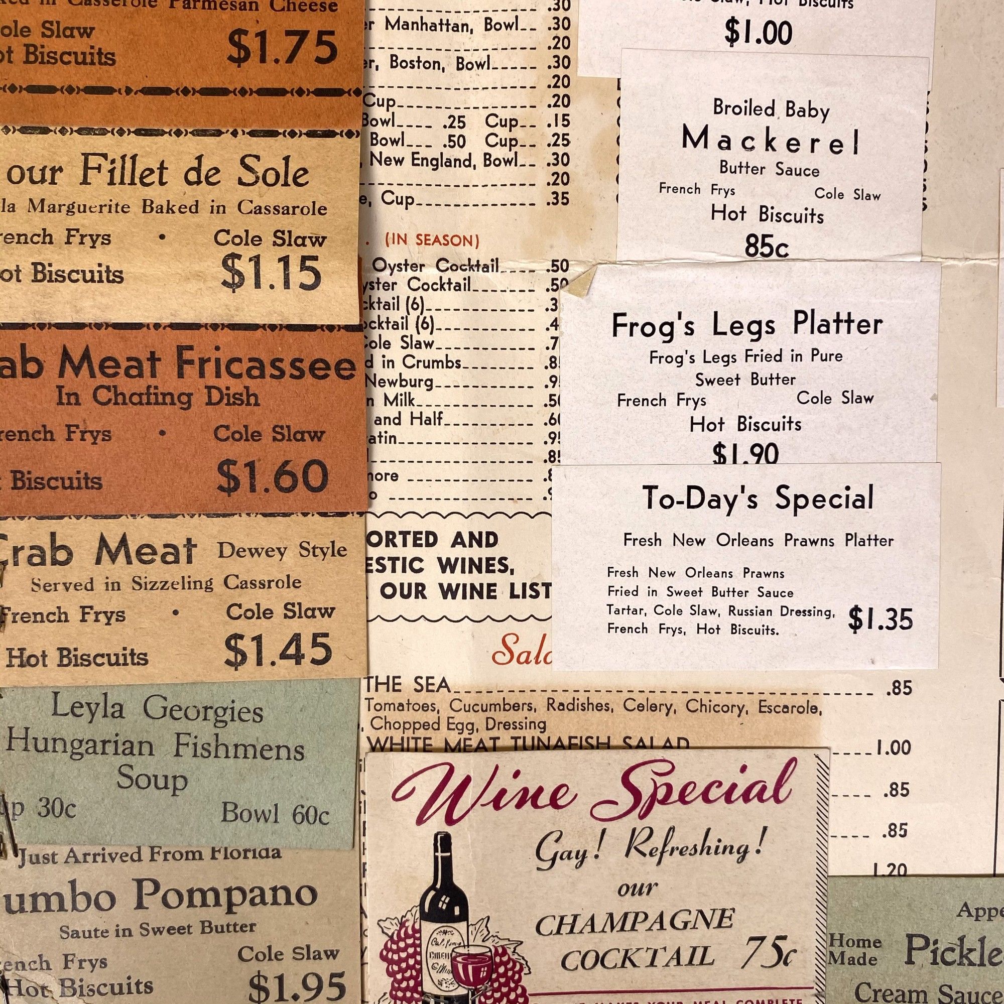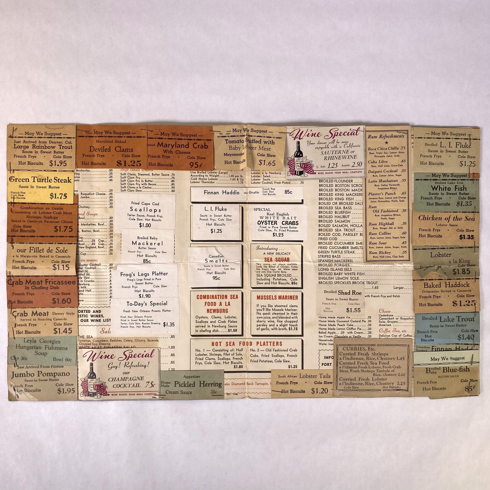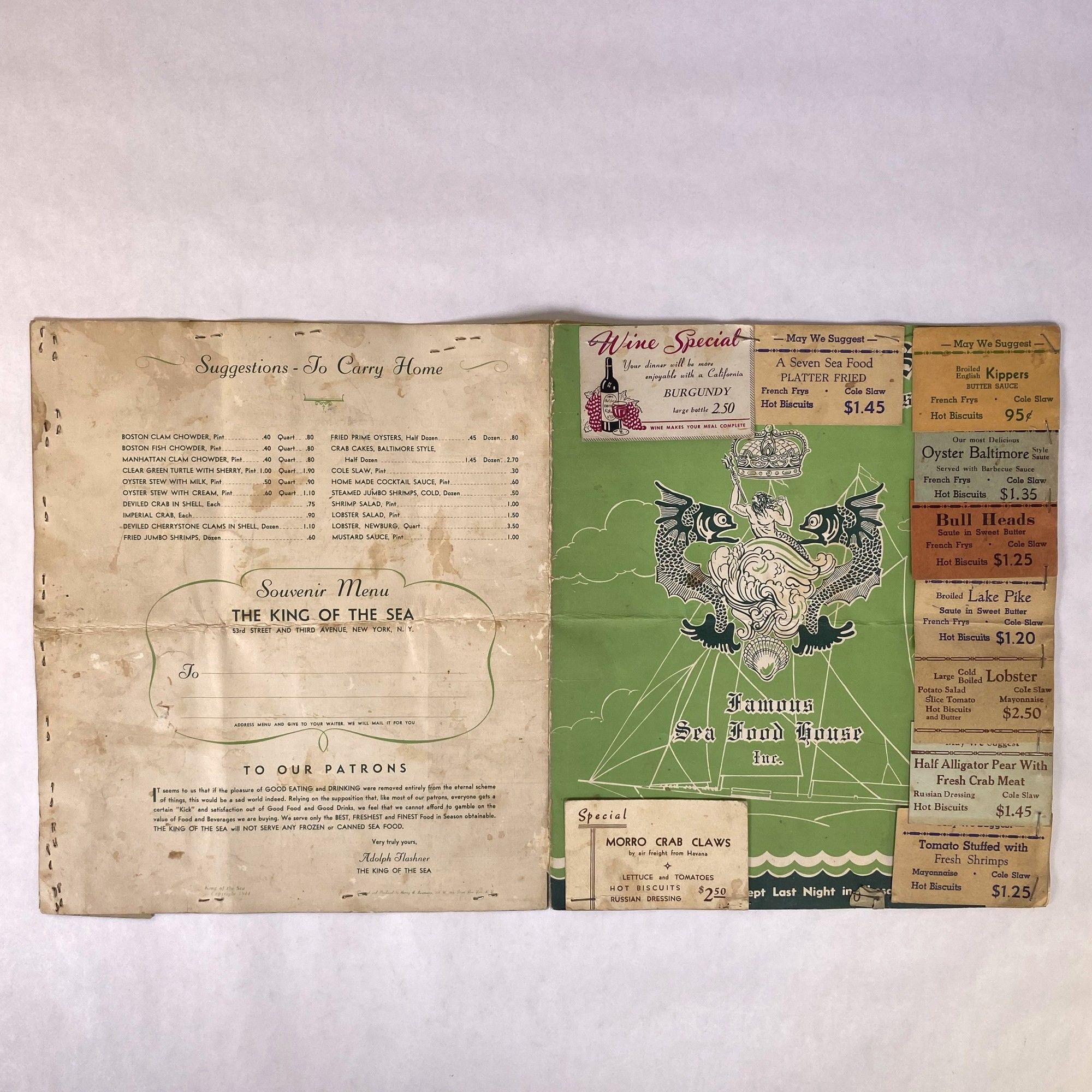 1944. Folded printed leaf, 12" x 10". ~~"The Sea Food you eat today, slept last night in Chesapeake Bay". From the storied Manhattan "King of the Sea Famous Seafood Restaurant", dated 1954. To say that this menu is liberally festooned with the days specials would be an understatement -- there are about 40 specials stapled to the edges. Fantastic relic of New York dining near the end of the Second World War.