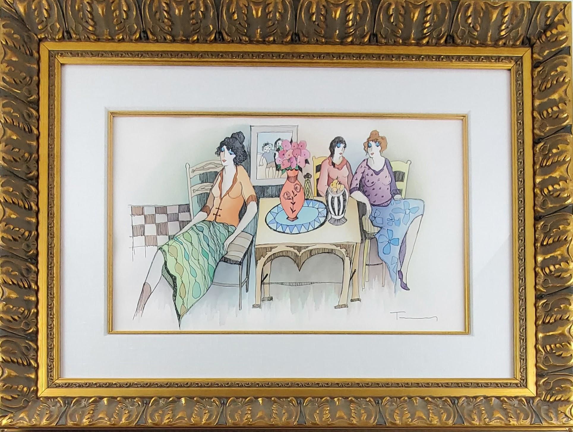 Brush, ink, watercolor on watercolor paper. Signed by artist to lower right corner. Housed in an ornate gold frame. Very Good condition. Sight measurements 22" w x 13 1/4" h, Frame Measurements 35 1/4" w x 26 1/2" h. This item is located at our Dupont store. Itzchak Tarkay (1935 - 2012) was an Israeli painter known for his Post-Impressionist portraits done in watercolor and acrylic. Influenced by the work of both Henri Matisse and Henri de Toulouse-Lautrec, his artworks captured the timeless world of socialites, females, parlors, and cafes. 1340543. Arts & Antiques.