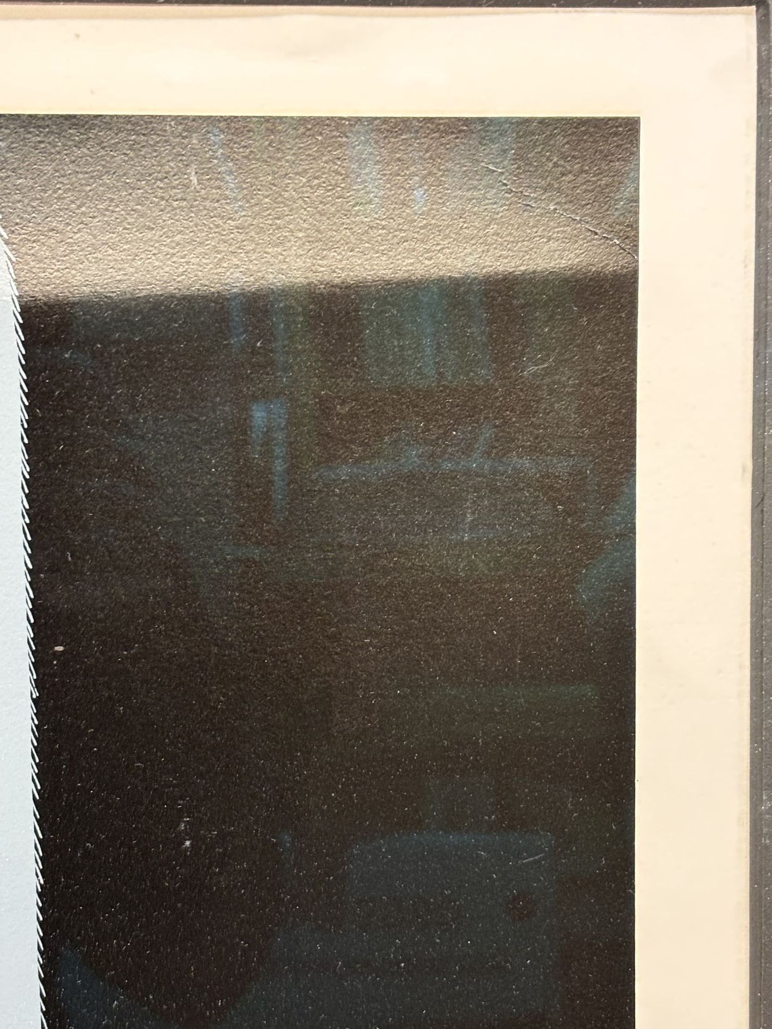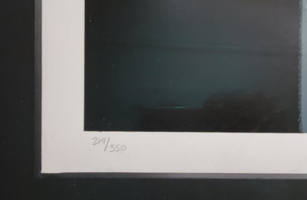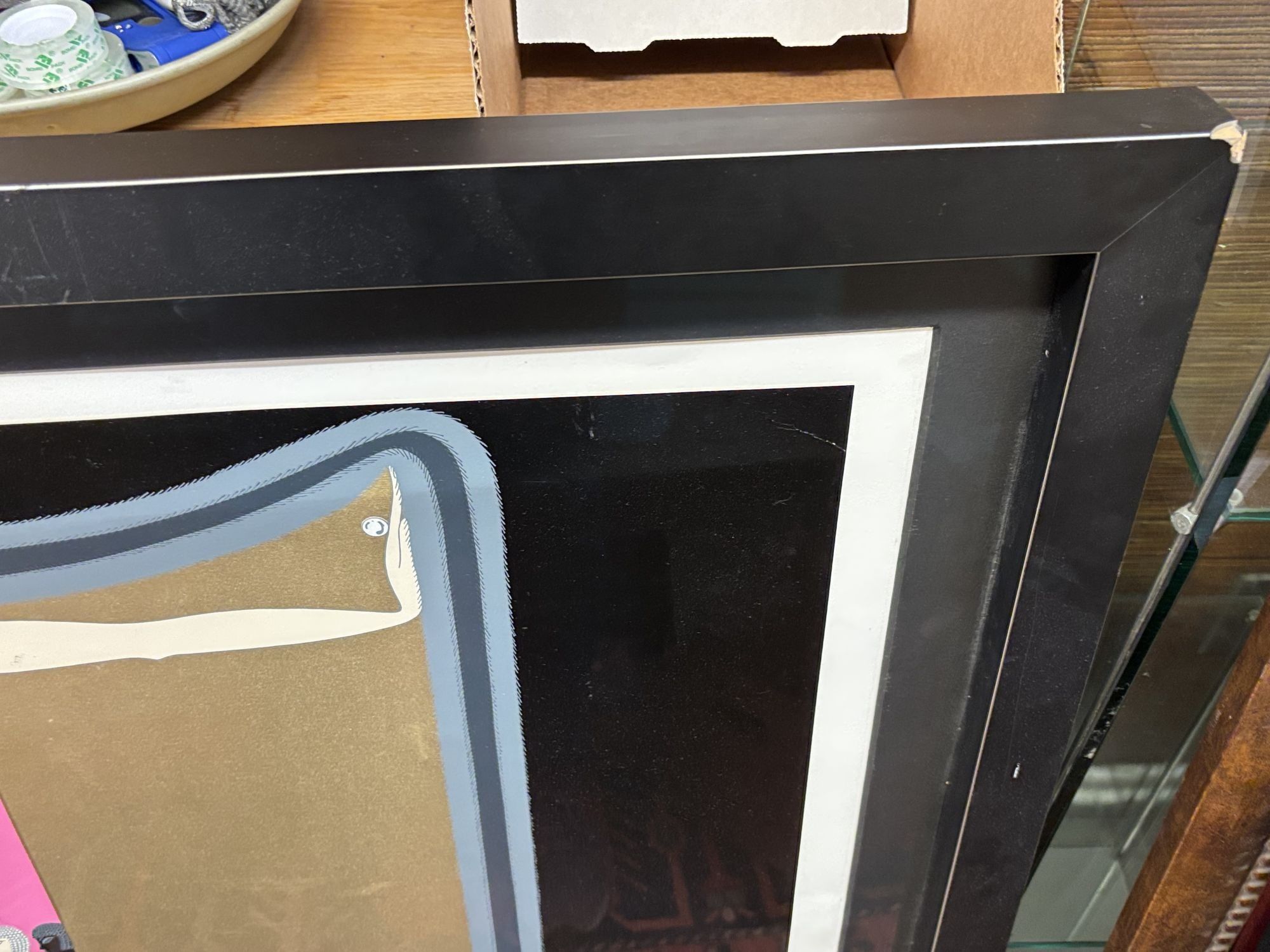 Screenprint in colors. Artist’s signature to bottom right. Limited Edition 219/350. Housed in a metal black frame. Two small (~1 in.) cracks to upper and lower right corners of serigraph. A few light creases to copper-colored middle region. Mild crease to upper right corner of print (to black background). Minor wear to black-painted frame with ship to upper right corner. Sight measurements 49 1/2" w x 35" h, Frame measurements 57 1/2" x 43" h. KW Consignment. This item is located at our Rockville store Room C.