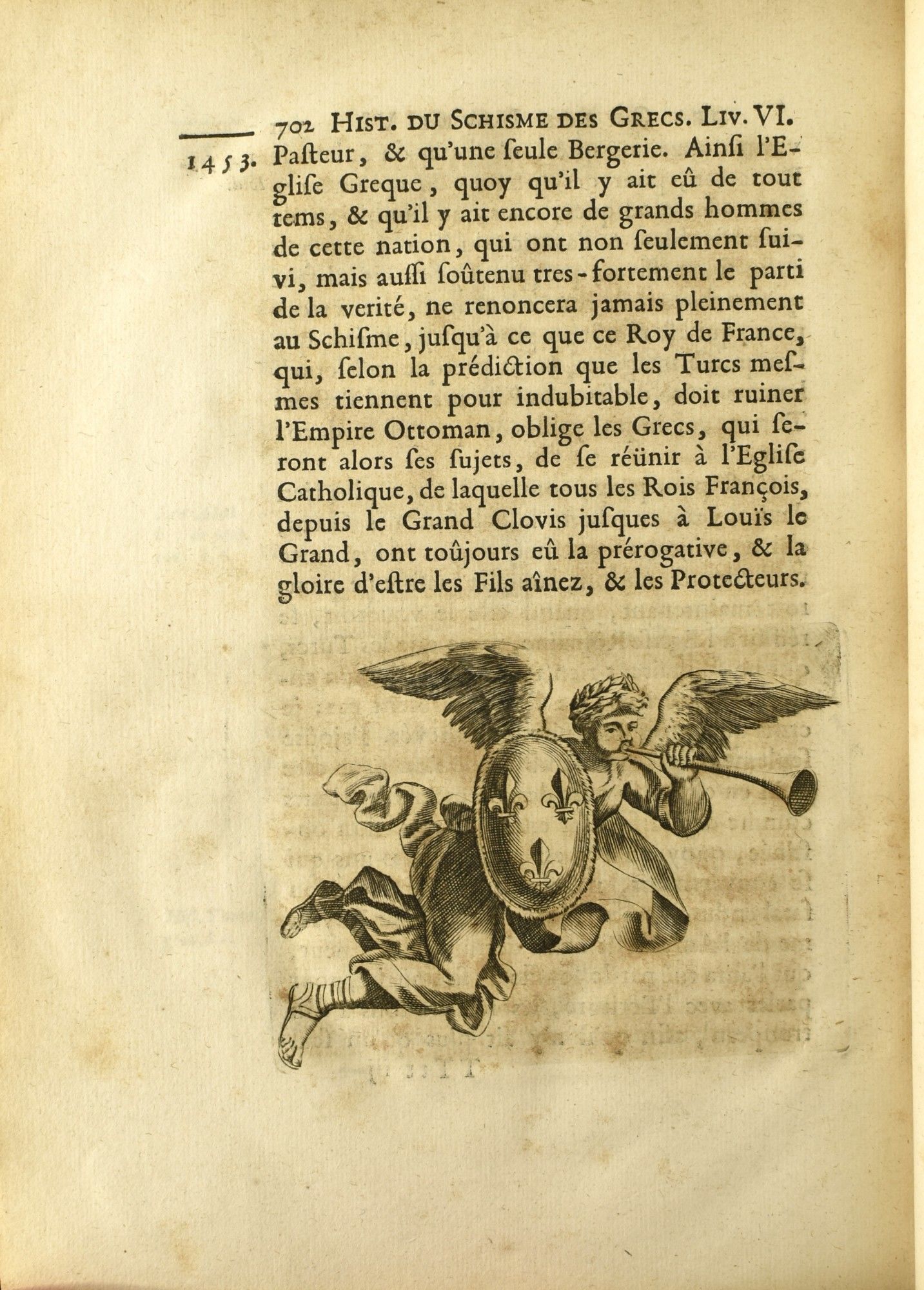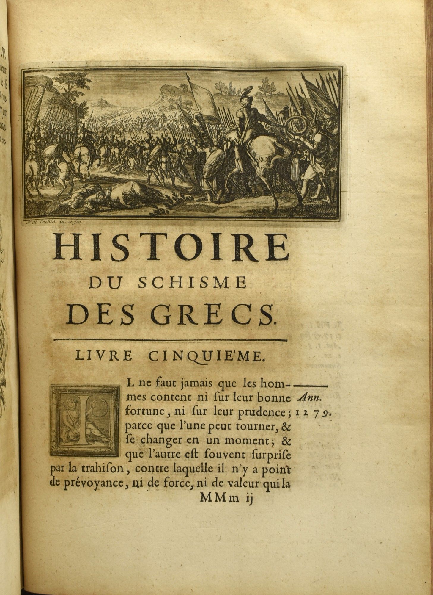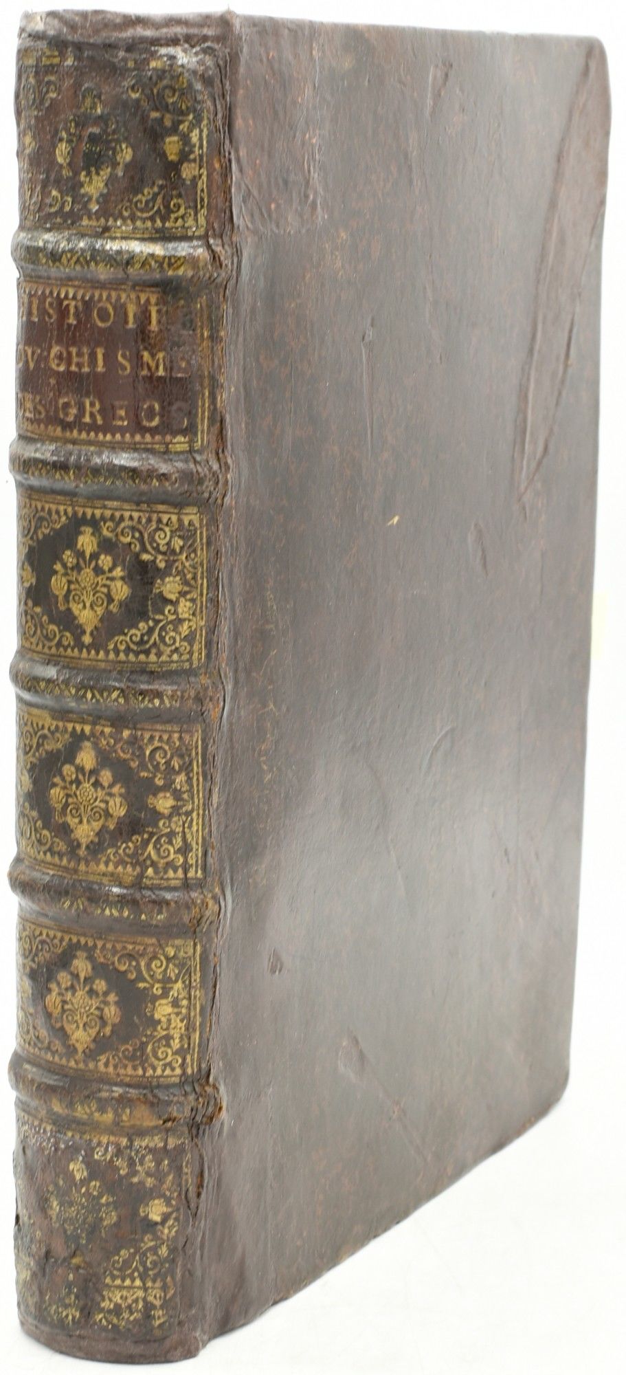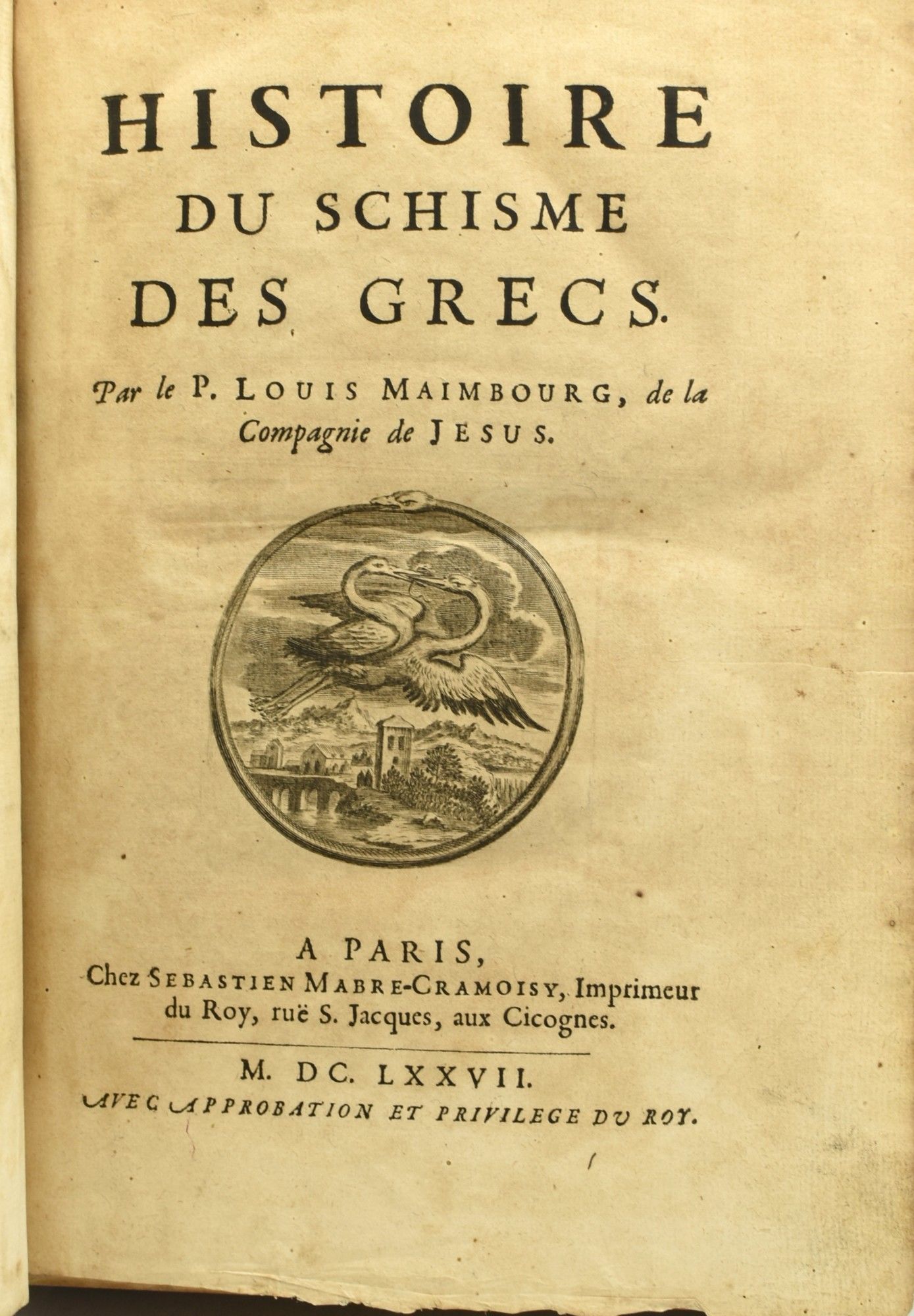 Paris: Sebastien Mabre-Cramoisy, 1677. First Edition. Full Leather. Very Good binding. 4to, in speckled calf with a patch to the upper board; decorations in compartments with morocco label; lacking the engraved title; [26]. 702, [22] with last leaf blank.~~The first printing of the Jesuit historian Louis Maimbourg's account of the Greek schism -- that is the Great Schism of 1054 which broke the Christian church into the Eastern Orthodox and Catholic Churches. ~~The title page has an engraved rondel of two"Cicognes" or storks. Each of the six chapters has a handsome engraved headpiece, and an engraved capital letter, as does the Dedication page "Au Roy". There are tailpieces as well. Altogether, a handsome binding, which presents well. A small gift inscription penned to the top of the endpaper. Very Good binding.