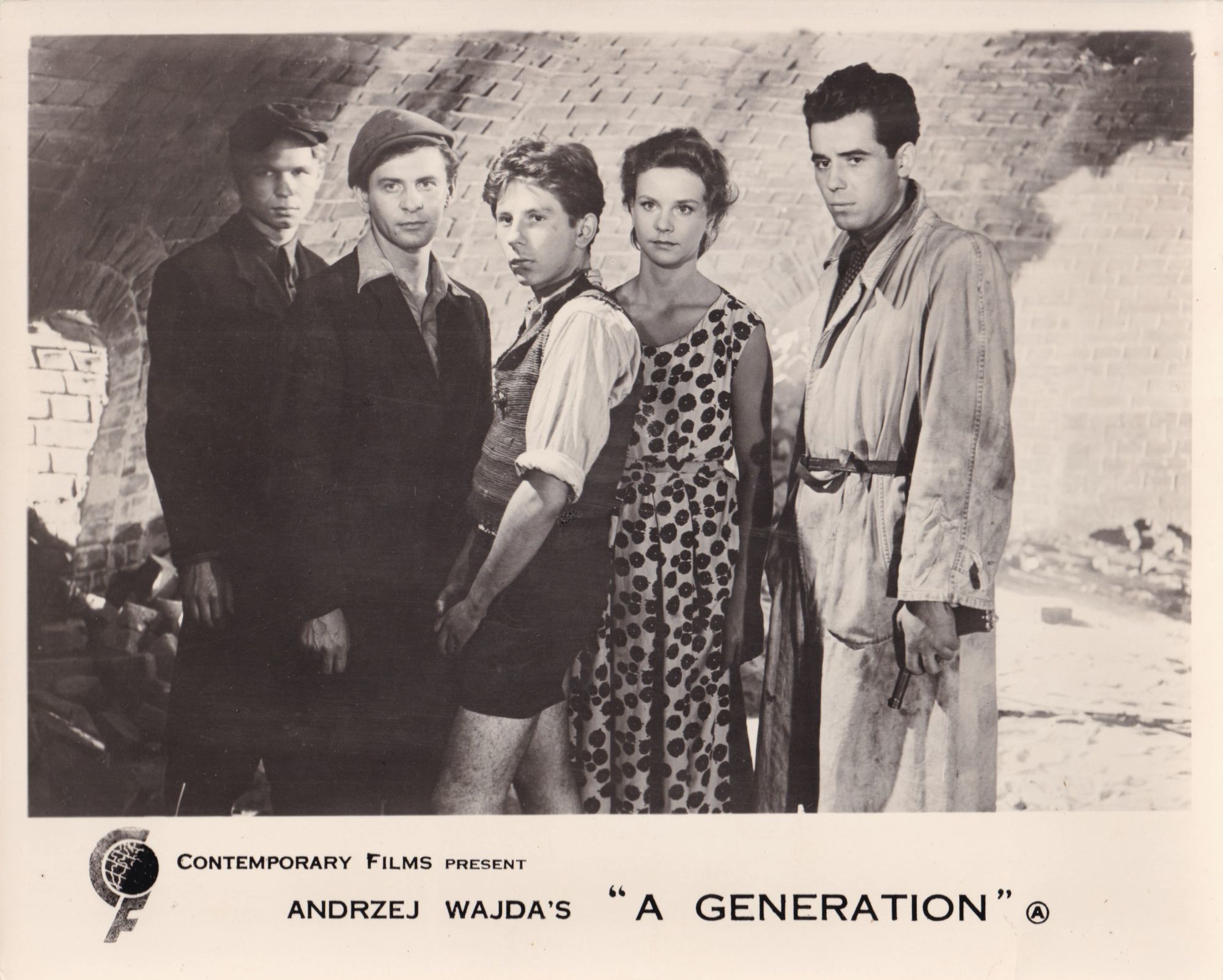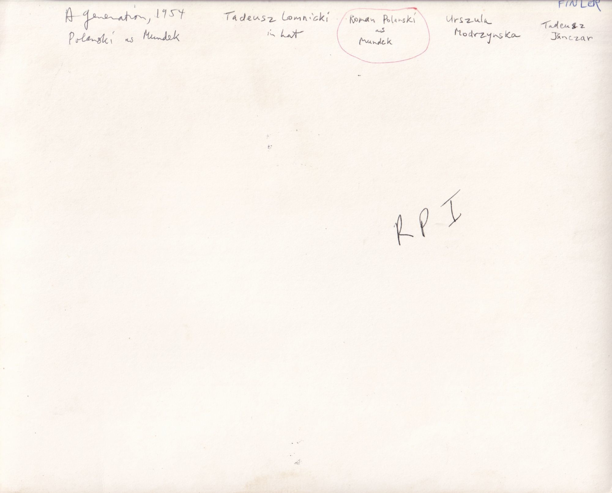 London: Contemporary Films, 1955. Vintage studio still photograph from the UK release of the 1955 Polish film, showing actors Tadeusz Lomnicki, Urszula Modrzynska, Tadeusz Janczar, Ryszard Kotys, and Roman Polanski.