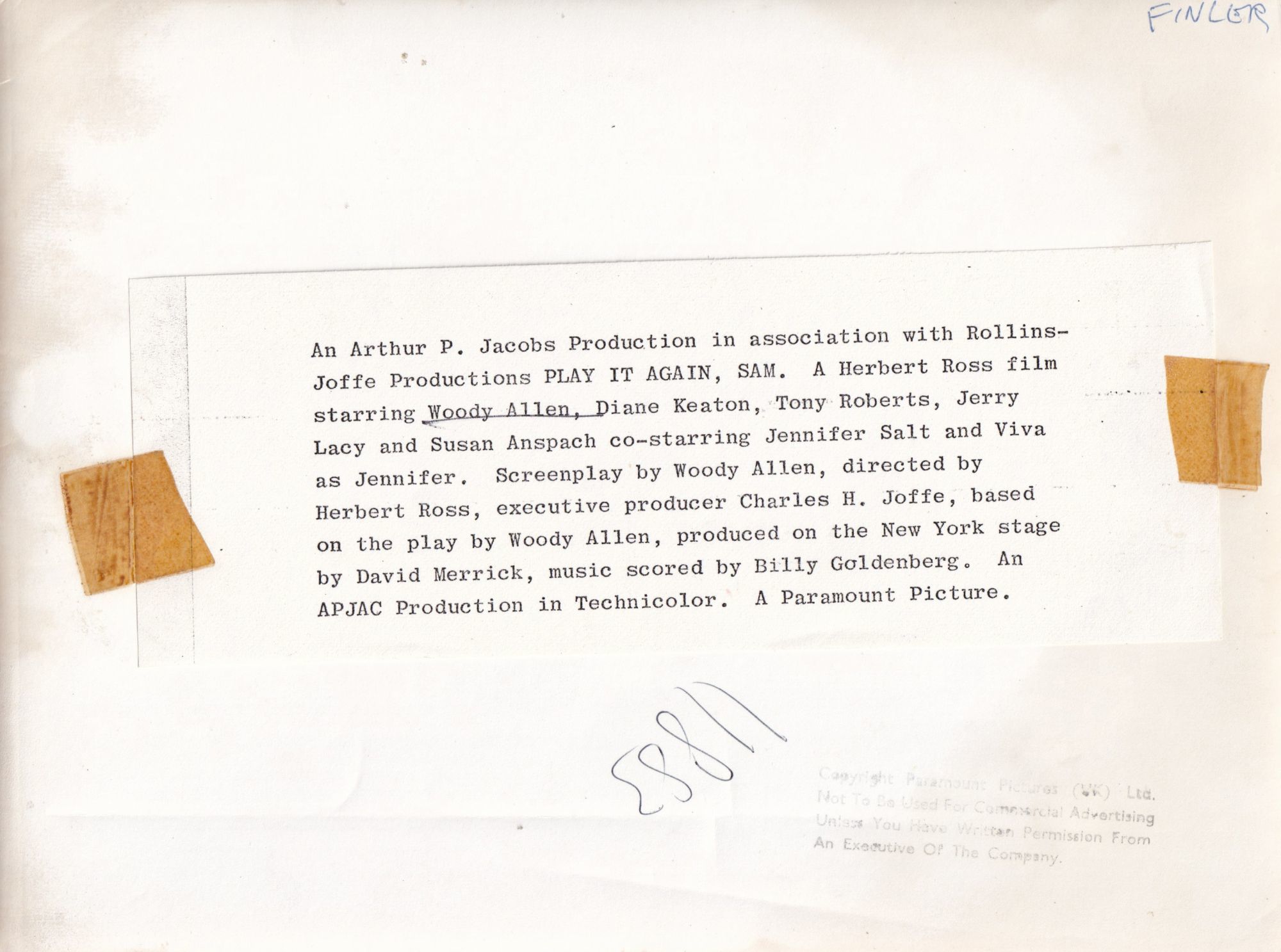 Los Angeles: Paramount Pictures, 1972. Vintage borderless photograph of actor Woody Allen from the 1972 film. With a printed mimeo snipe affixed to the verso.