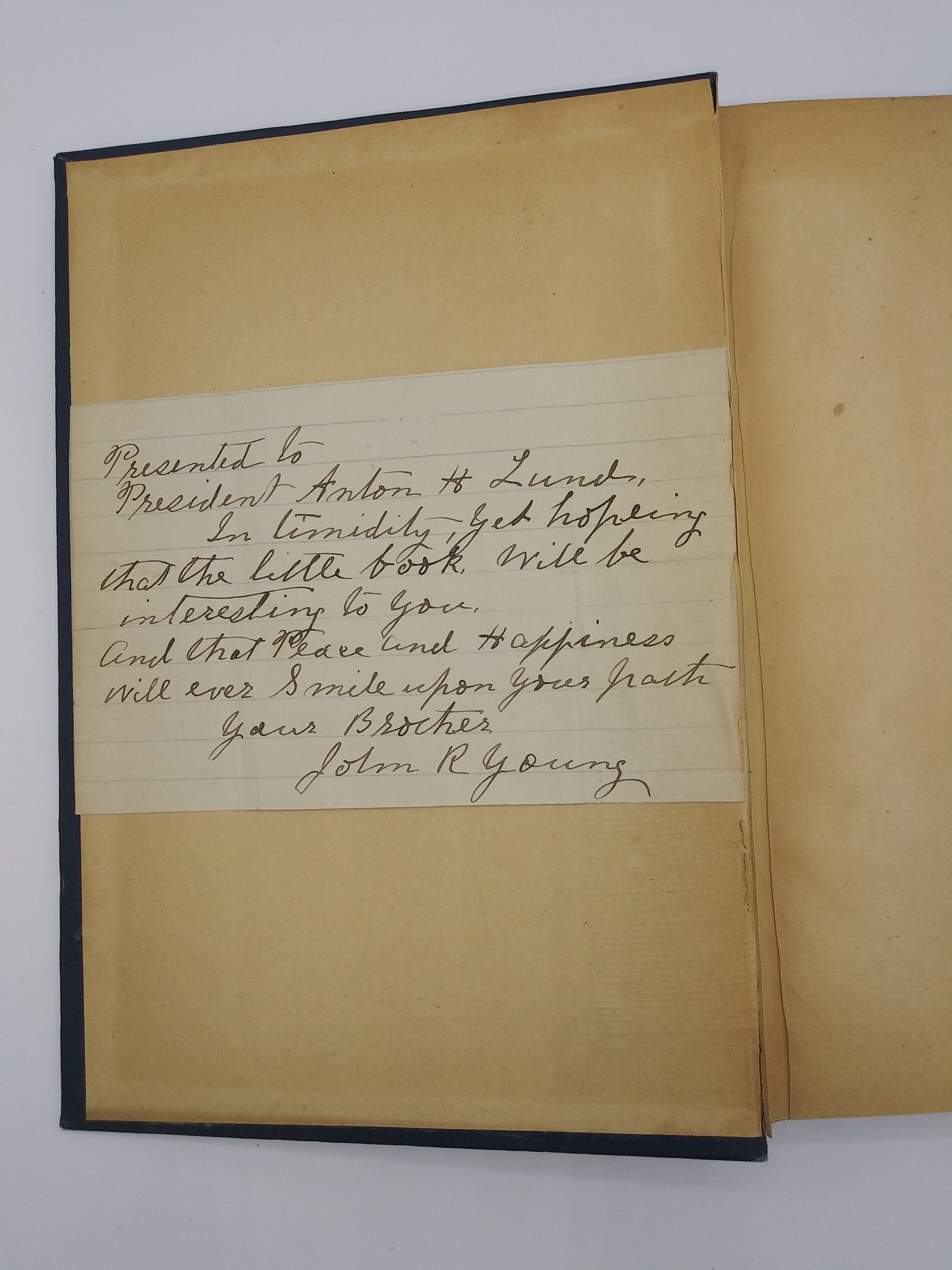 Inscribed by John R. Young to Anton H. Lund, on a piece of paper that has been mounted to the front pastedown. The slip states, "Presented to President Anton H. Lund, in timidity- (?) that the little book will be interesting to you. And that Peace and Happiness will ever smile upon your path. Your brother, John R. Young."