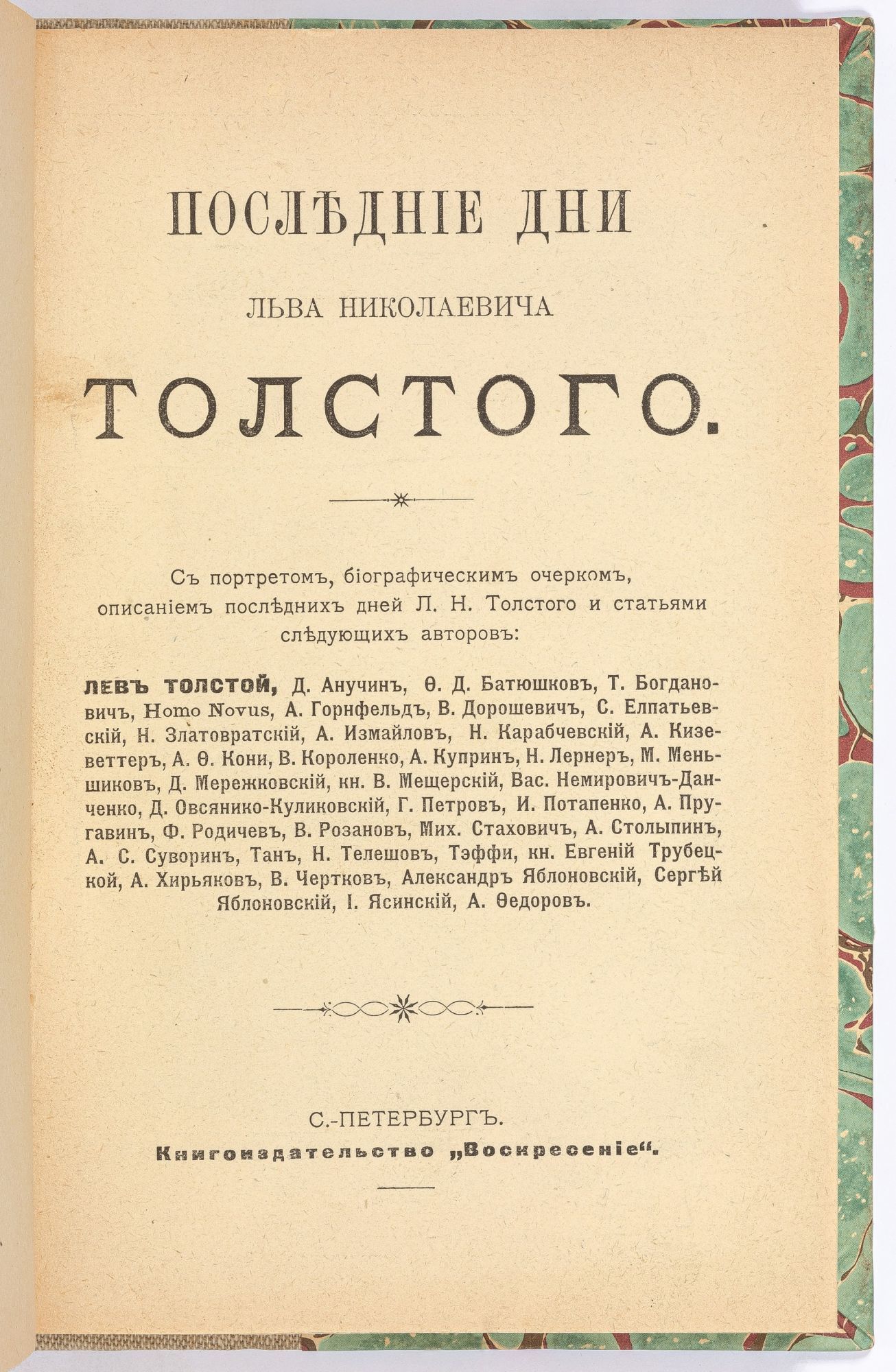 A very uncommon memorial anthology for Tolstoy, likely published in the months immediately following his death in November, 1910. A publisher's introductory note states that the volume's purpose is to bring together material written in periodicals immediately following the great author's passing (fact-checked and sometimes condensed). The book includes a biographical sketch, a description of his last days, and articles by various authors. Printed at the Printing House B. M. Volf.