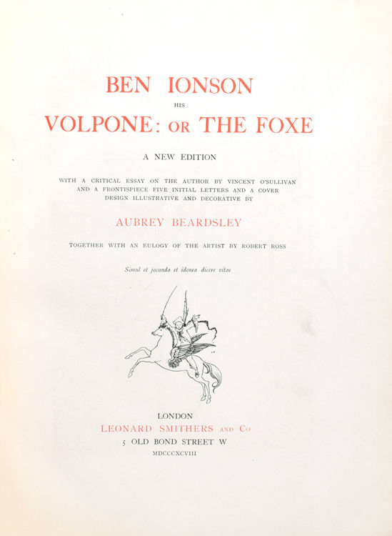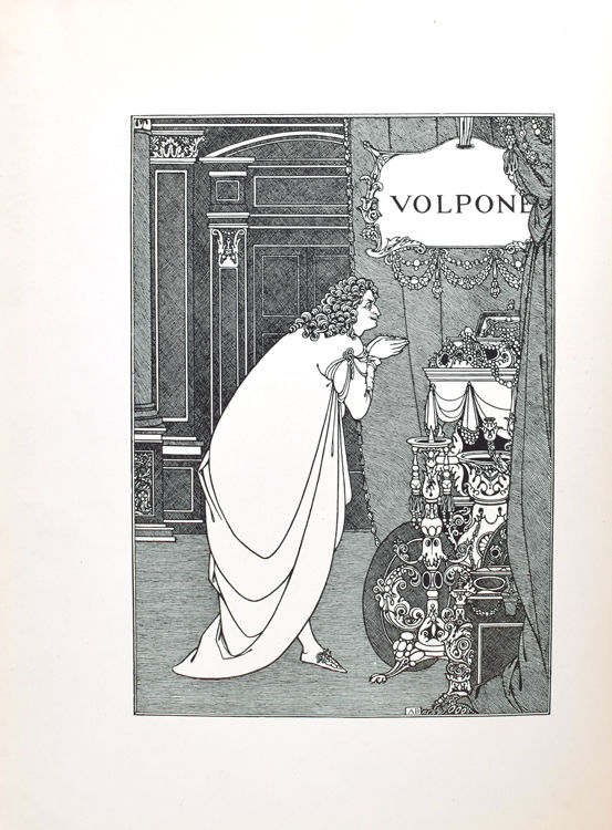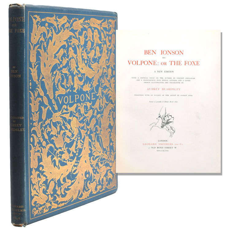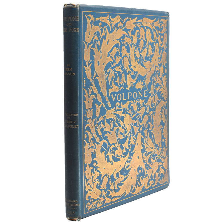 London: Leonard Smithers, 1898. No. 22 of 1000 copies on Art Paper. Frontispiece, five initial letters, and cover designs by Aubrey Beardsley. 1 vols. 4to. Original blue cloth, blocked in gilt with Beardsley's designs on upper and lower covers, slight cover wear, else fine and attractive. No. 22 of 1000 copies on Art Paper. Frontispiece, five initial letters, and cover designs by Aubrey Beardsley. 1 vols. 4to. Beardsley had intended a series of 24 drawings for Jonson's Venetian comedy, but died before completing it, at the age of 26.