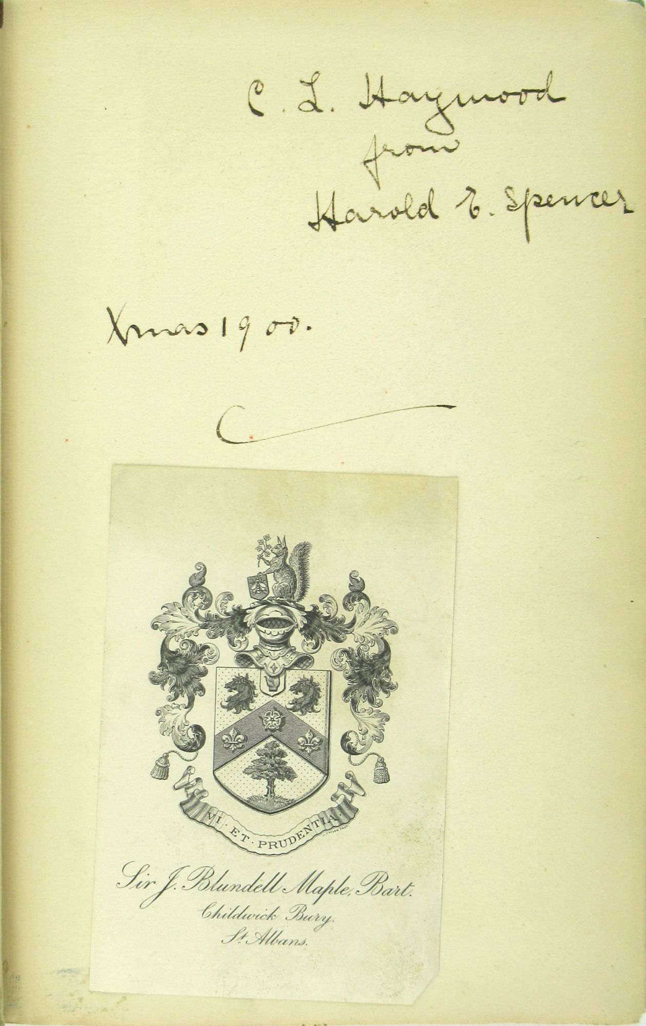 London: Edward Arnold, 1898. Good. London: Edward Arnold, 1898. First Edition. Octavo (23cm.); publisher's green cloth-backed pictorial paper-covered boards; ca. 110pp.; chiefly illus. Boards rather rubbed with exposure at corners and minor fraying at spine ends, dampstain to rear cover not bleeding into textblock, contemporary gift inscription to front free endpaper, else Good or better, internally clean and sound. An example of the armorial bookplate of British businessman Sir J. Blundell Maple (1843-1926) laid in.
