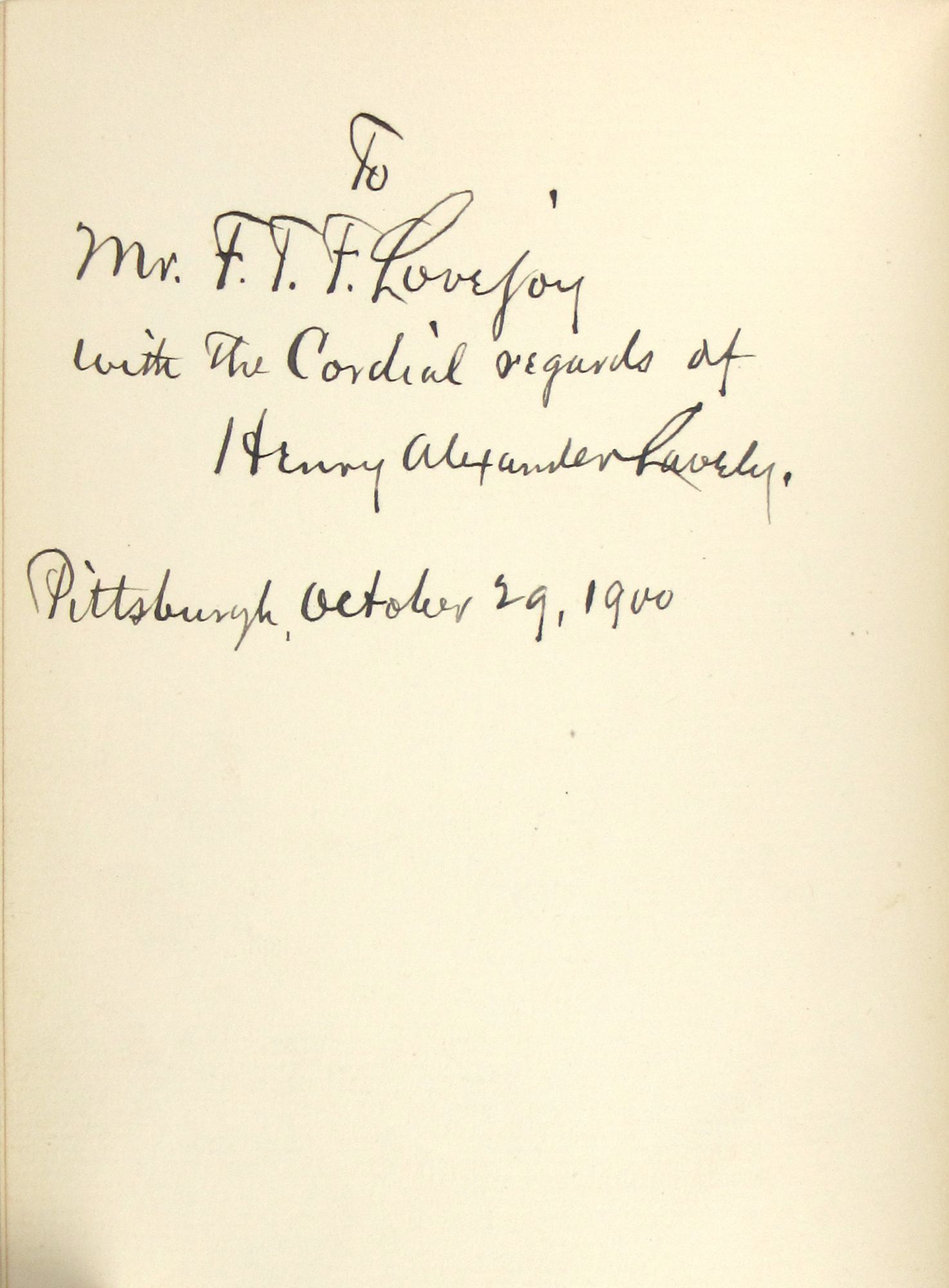 Cambridge: The Riverside Press, 1900. Very Good. Cambridge: The Riverside Press, 1900. Revised Edition. Signed by the author opposite title page with inscription to industrialist F.T.F. Lovejoy with inscription "To Mr. F.T.F. Lovejoy with the cordial regards of Henry Alexander Lavely. Pittsburgh, October 29, 1900."
