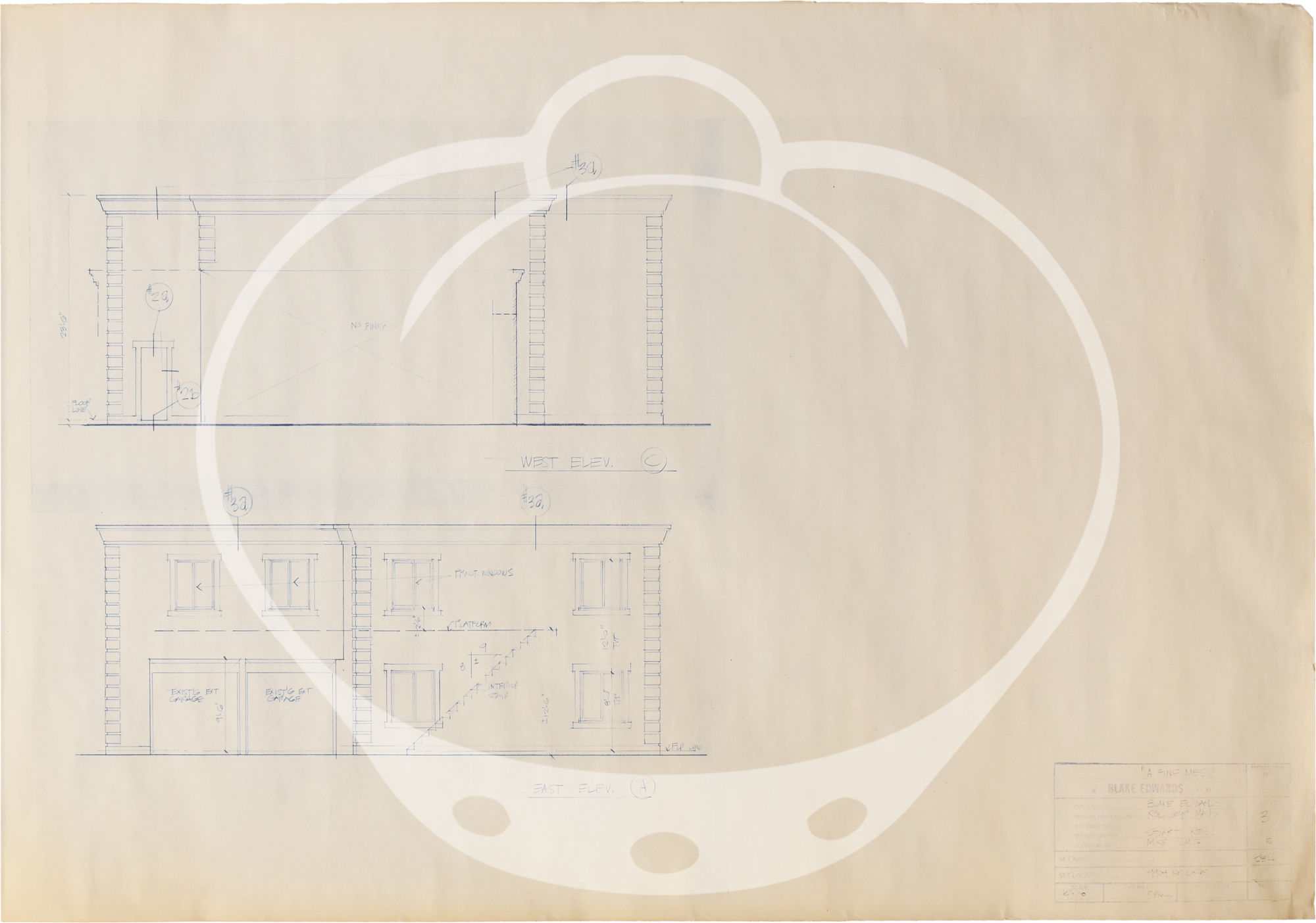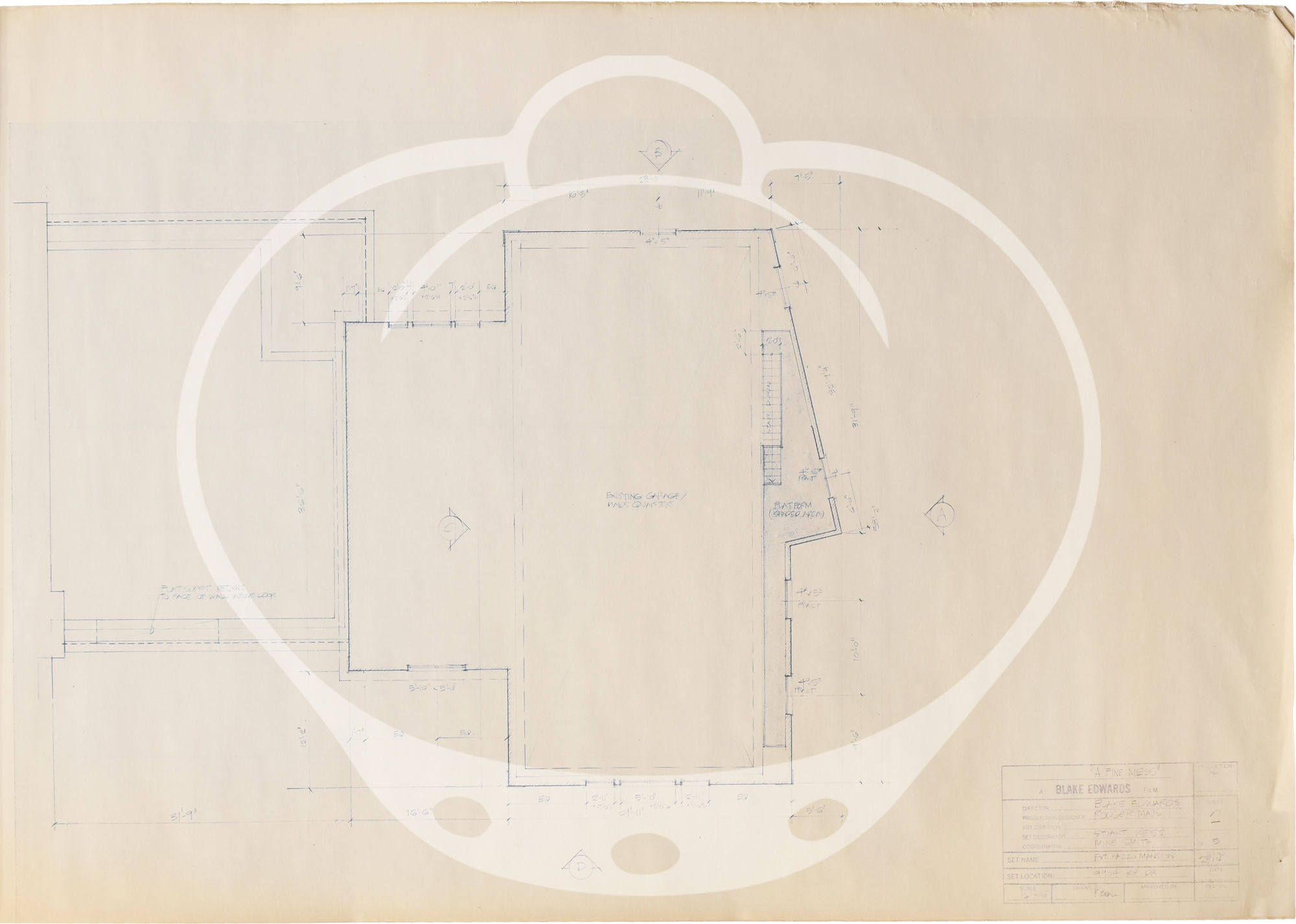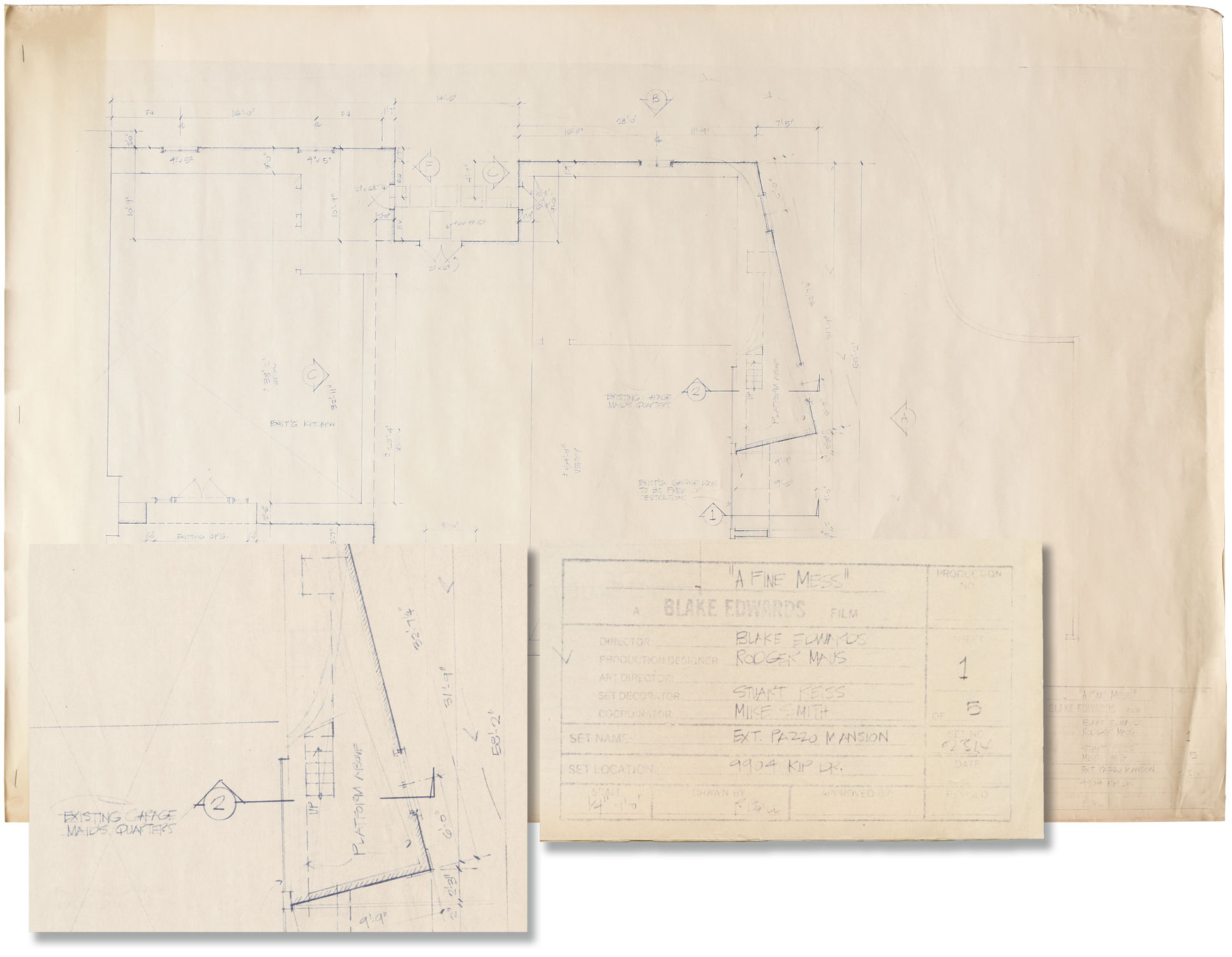 Culver City, CA: Columbia Pictures, 1986. Archive of five original architectural blueprints for location shooting purposes relating to the 1986 comedy film. Each blueprint numbered one through five (out of five), labeled "Ext. Pazzo Mansion," with the Beverly Hills address of the house, and credits for director Blake Edwards, production designer Roger Maus, and others.