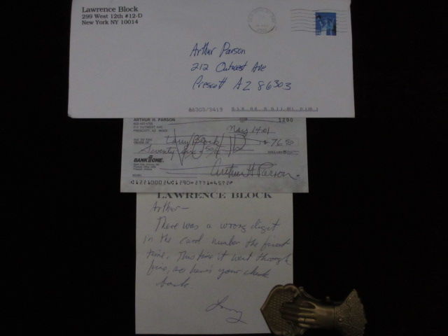 California & Michigan: A.S.A.P./ Subterranean Press, 1999. LIMITED EDITION. Hard Cover. Fine. octavo, 155 pages; red cloth printed in gilt, with pictorial label on front panel; as issued, without dust jacket. Number 56 of 300 copies, by Lawrence Block writing as Jill Emerson, with a new introduction by the author; front cover Illustration by Phil Parks, and signed by both on the limitation page. Together with autograph note (and envelope) signed "Larry" explaining why he is returning a check from the reader.