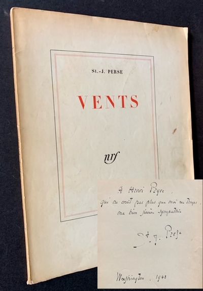 Paris: Librairie Gallimard, 1946. Original wraps. Very Good +. WARMLY INSCRIBED BY ST.-JOHN PERSE TO PRE-EMINENT LITERARY SCHOLAR AND YALE PROFESSOR HENRI PEYRE on the front free endpaper. A solid, very presentable copy to boot of the 1946 1st edition. #2,236 of 2,350 copies "sur papier de chataignier". Bright and VG+ in its off-white wrappers, with very light soiling to the front panel and mild offsetting, creasing and soiling at the rear panel. Very small paper cuts along the fore-edges of the preliminaries, otherwise clean as could be internally, with no writing or markings to speak of. Tall quarto, one of the Nobel Prize winner's long poems written during his American "exile