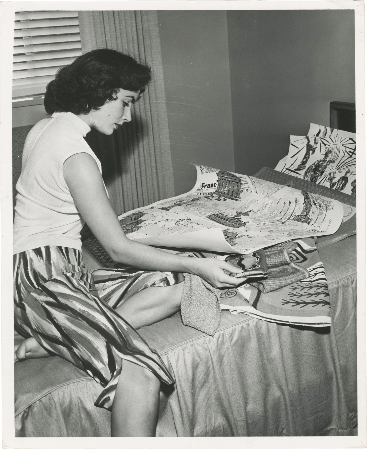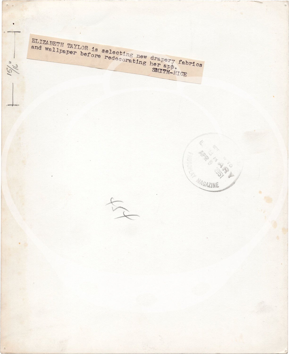 N.p.: N.p., 1951. Vintage double-weight photograph of a 19-year-old Elizabeth Taylor selecting new wallpaper and drapery fabrics for her apartment. With a printed mimeo snipe explaining same affixed to the verso, along with a Photoplay Magazine stamp dated April 9, 1951 and a small manuscript annotation in ink regarding cropping.