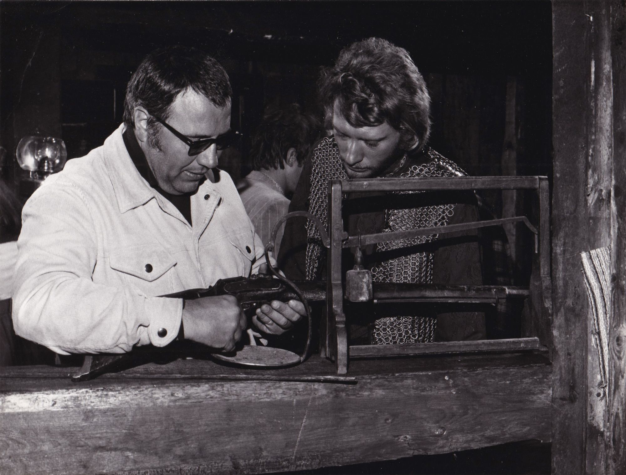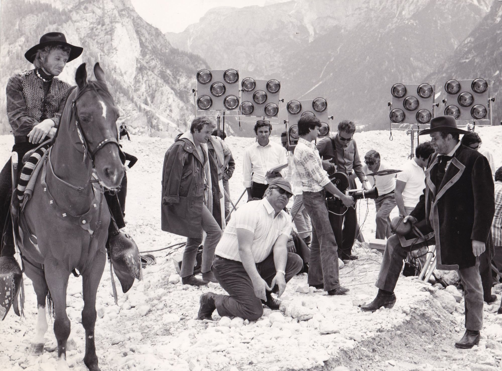 N.p.: N.p., 1969. Two vintage borderless reference photographs taken on the set of the 1969 Western film, one showing director Sergio Corbucci, actors Johnny Hallyday and Gastone Moschin, and various crew members between shots, the other showing Corbucci and Hallyday inspecting a gun.
