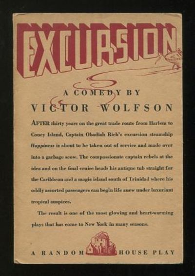 New York: Random House. Very Good+. (c.1937). "Revised Acting Version". Softcover. [light external wear, some toning/light soiling to edges of text block, faint darkening to spine]. (stage diagrams) From the front-cover synopsis, better than anything I could write: "After thirty years on the great trade route from Harlem to Coney Island, Captain Obadiah Rich's excursion steamship Happiness is about to be takien out of service and made over into a garbage scow. The compassionate captain rebels at the idea and on the final cruise heads his antique tub straight for the Caribbean and a magic island south of Trinidad where his oddly assorted passengers can begin life anew under luxuriant tropical auspices." The entire play is set aboard the boat; the original Broadway production, featuring Shirley Booth (who had the wonderful character name "Daisy Loschavio"), ran for 116 performances. The play was later adapted into a musical, "Dreamboat" (music by Alec Templeton, lyrics by Stella Unger, book by Unger and Wolfson), which unfortunately never made it to the Great White Way. .