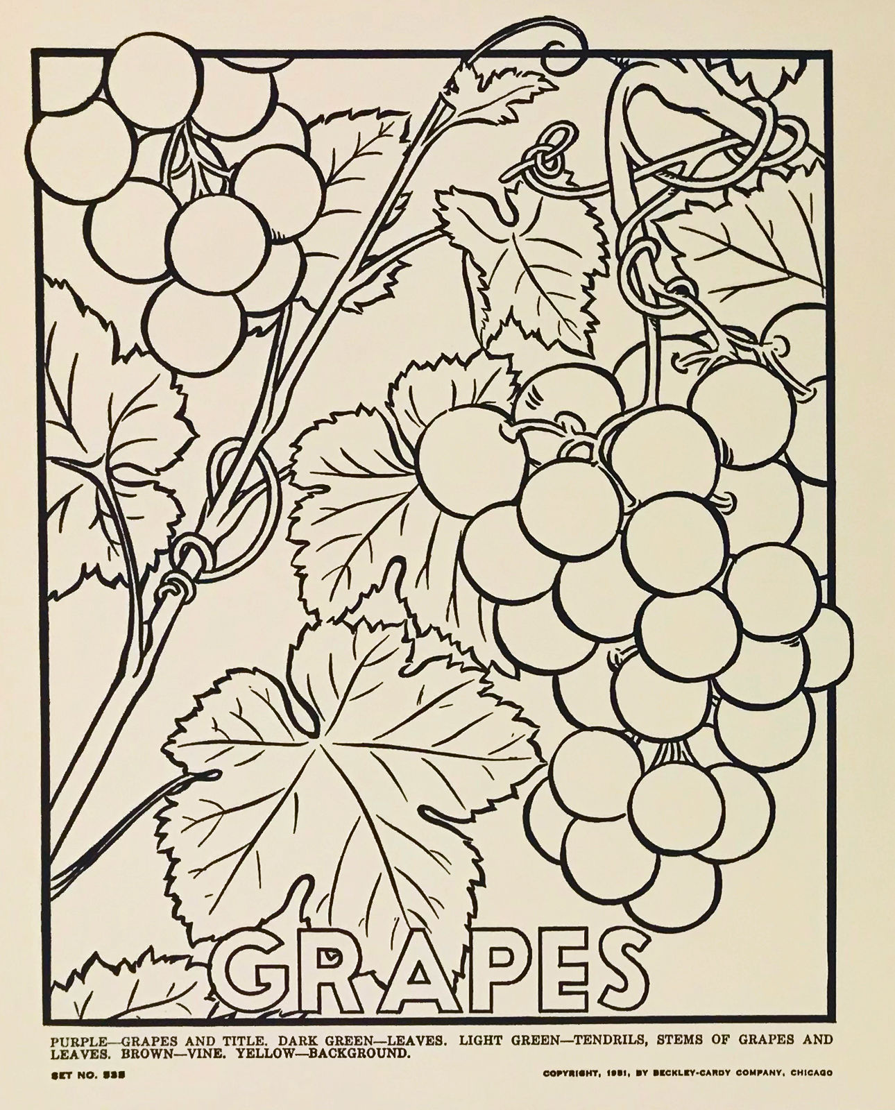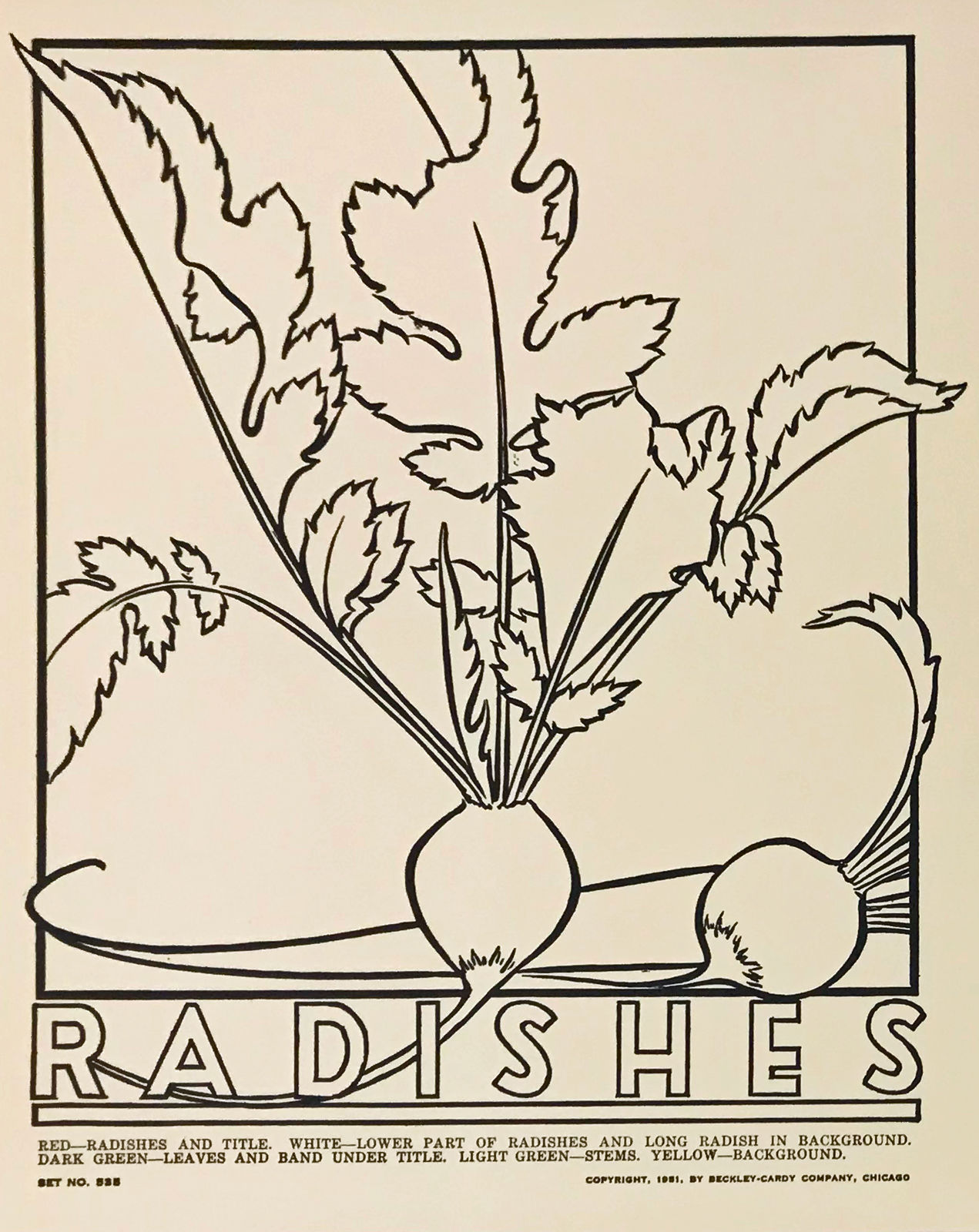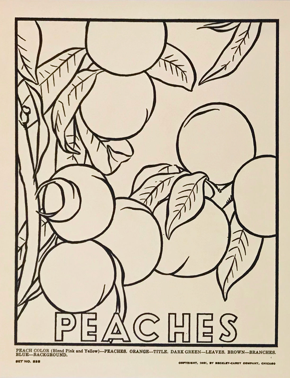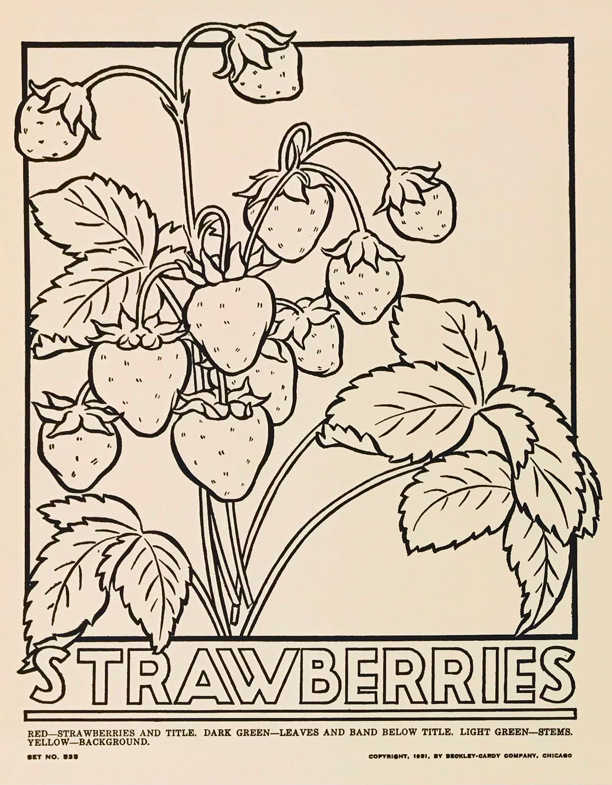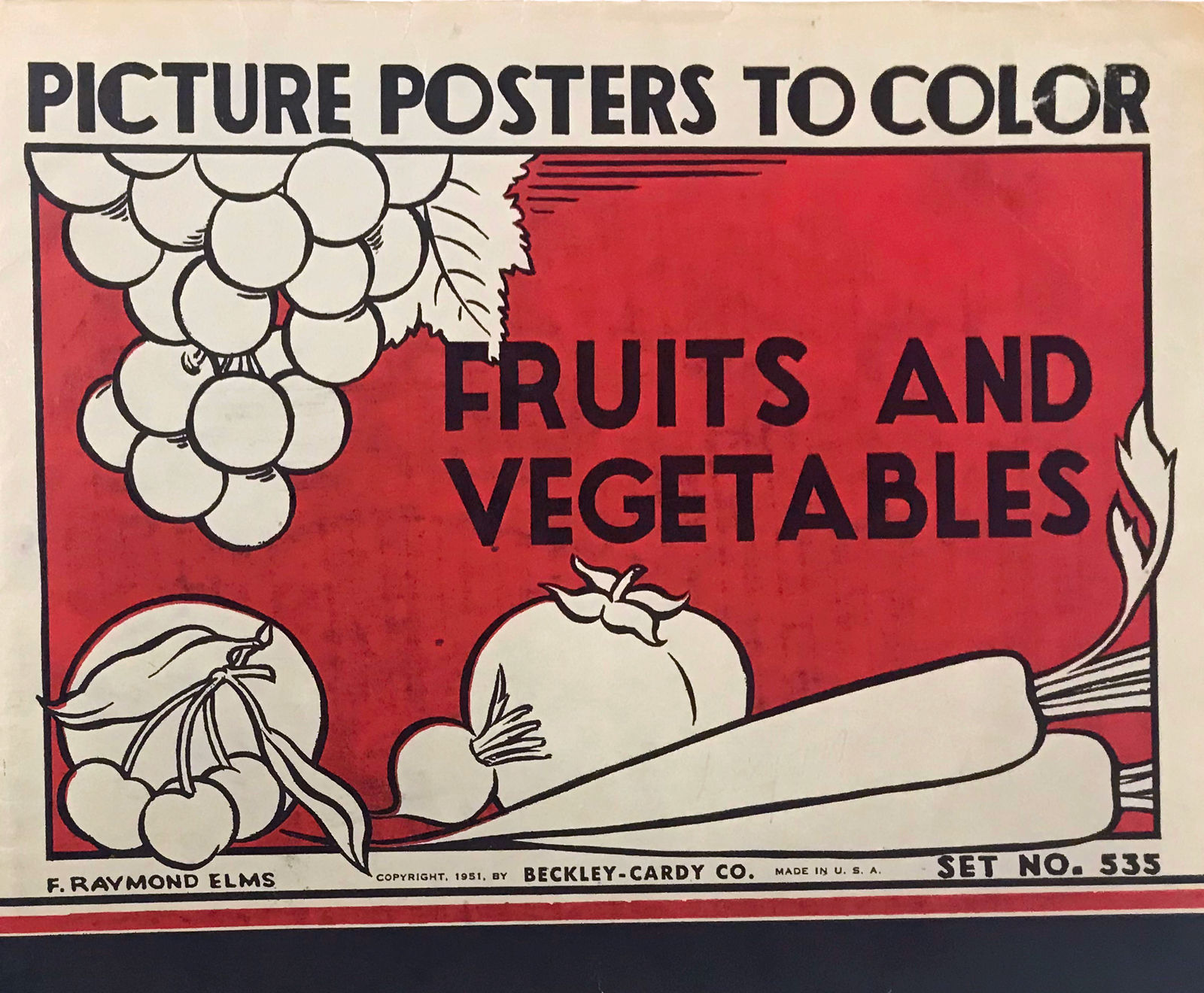 Chicago: Beckley-Cardy Company, 1951. Complete set of midcentury classroom posters, designed to be colored by students. The twelve fruits and vegetables featured here are apples, beets, carrots, cherries, grapes, peaches, pears, radishes, strawberries, sweet corn, tomatoes, and wax beans, each depicted on the tree, vine or stalk. As a footnote, each image offers specific instructions on which colors the children should choose. Beckley-Cardy 535. A fine set of vintage classroom materials, with pomological appeal. Complete set of twelve black and white posters, measuring 10.5 x 8.5 inches. Housed in publisher’s pictorial envelope printed in black and red. Light wear and smudging to envelope, posters fine.