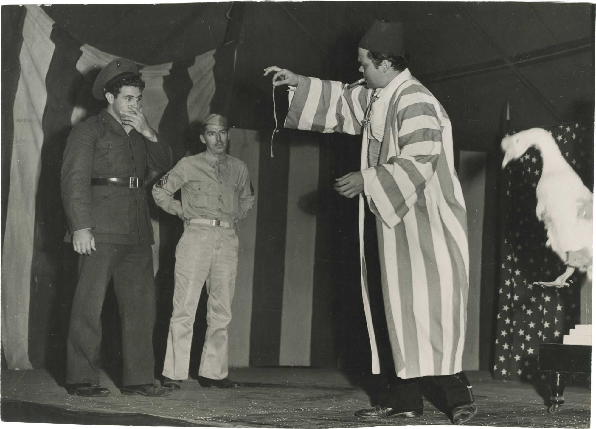 N.p.: N.p., 1943. Vintage oversize borderless double weight photograph of director Orson Welles in a striped dressing gown and fez, performing a magic trick for two US servicemen.