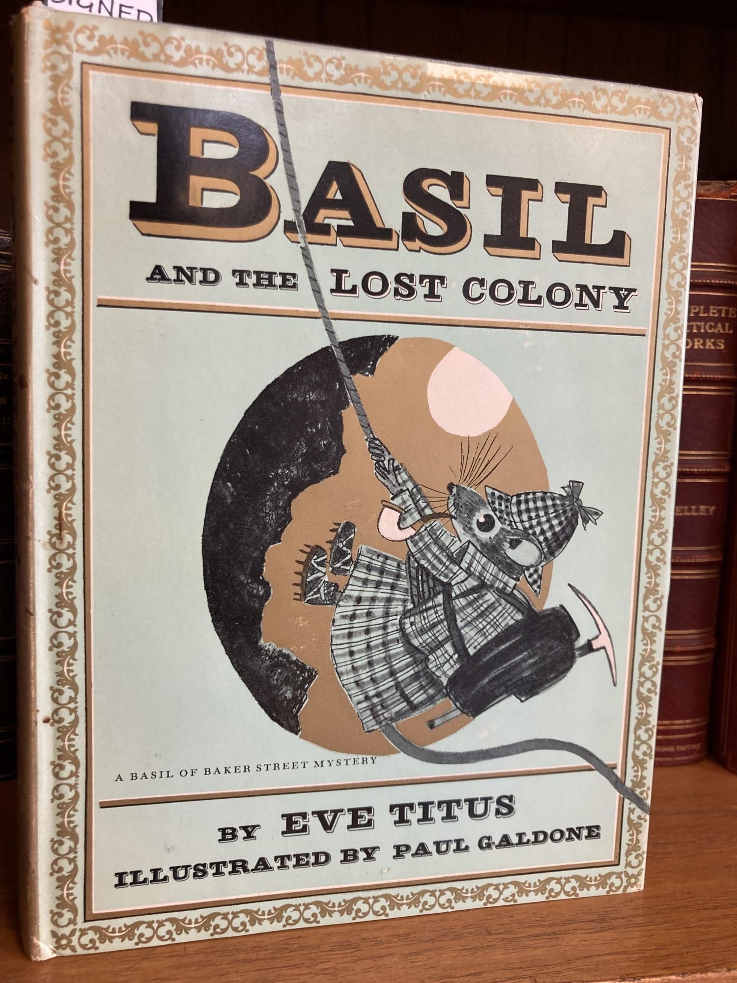 New York: McGraw-Hill Book Company, 1964. First Edition, First Printing. Hardcover. Octavo, 95 pages; VG/VG; spine gold with black titling; dust jacket protected with a mylar covering, price cut, minor rubbing and wear, small staining to spine. small sticker residue to lower spine corner of rear cover; inscribed on the ffep by Eve Titus, dated 1976; shelved case 14. The basis for the 1986 Disney animated feature The Great Mouse Detective. 1342016. Shelved Dupont Bookstore.