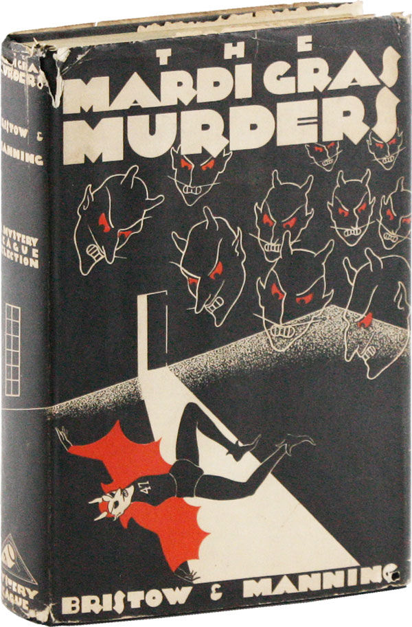 "For years all New Orleans had speculated at the whispered reports of abandoned reverlry held at Mardi Gras time by the secret society dedicated to Dis, Greek god of Inferno...no member of the order had ever been seen without the satanic mask and sinister robe of black and scarlet...Murder struck silently..." (from the dustjacket); HUBIN, p.49.