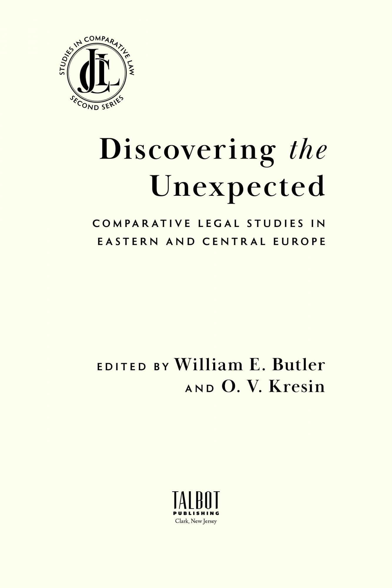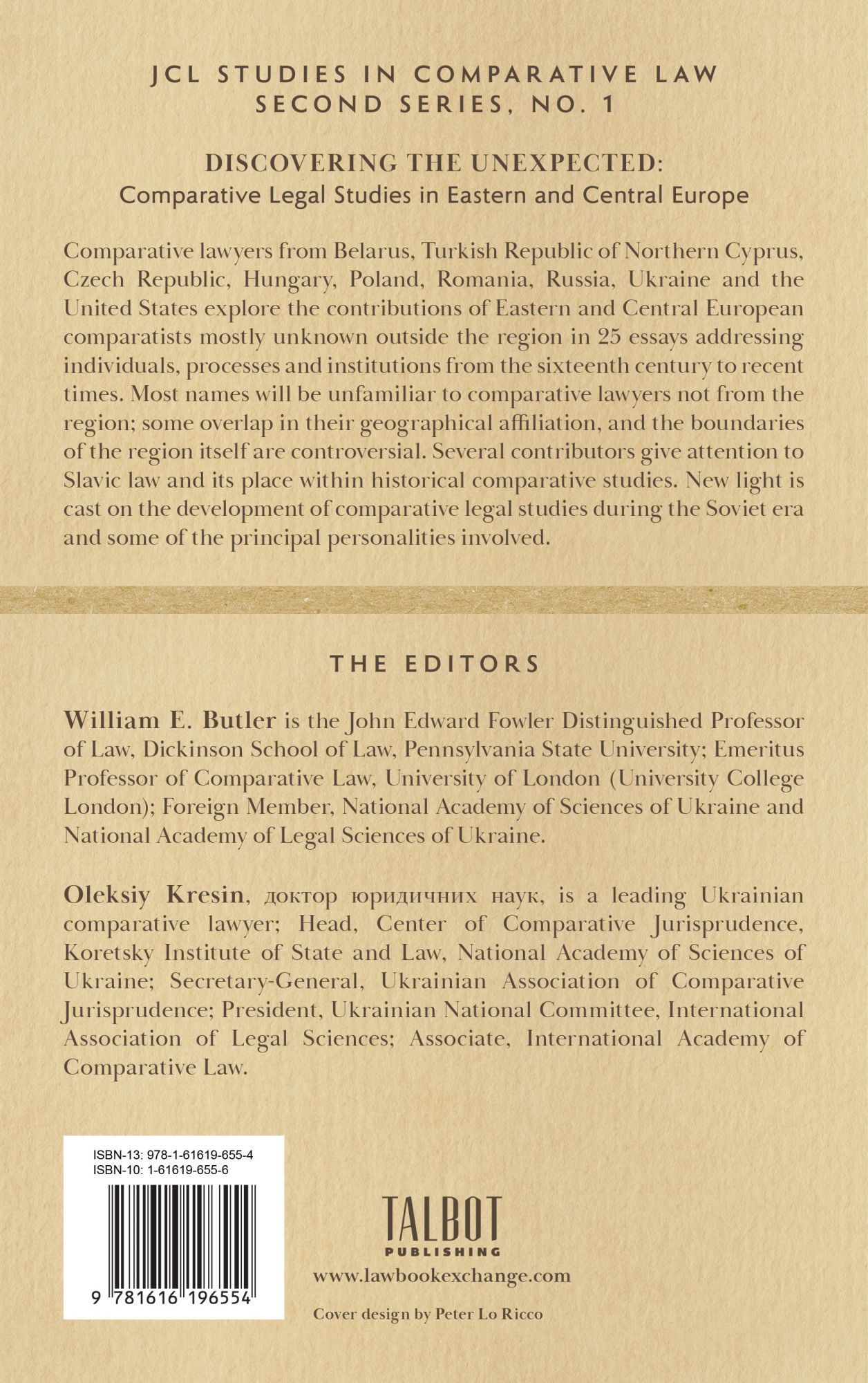 2021. Butler, William E. Editor. Kresin, O.V., Editor. Discovering the Unexpected: Comparative Legal Studies in Eastern and Central Europe. Clark, New Jersey: Talbot Publishing, 2021. xiv, 562 pp. ISBN-13: 9781616196554. ISBN-10: 1616196556. Hardcover. New. $150. * A title in the JCL Studies in Comparative Law, Second Series. Comparative lawyers from Belarus, Turkish Republic of Northern Cyprus, Czech Republic, Hungary, Poland, Romania, Russia, Ukraine and the United States explore the contributions of Eastern and Central European comparatists mostly unknown outside the region in 25 essays addressing individuals, processes and institutions from the sixteenth century to recent times. Most names will be unfamiliar to comparative lawyers not from the region; some overlap in their geographical affiliation, and the boundaries of the region itself are controversial. Several contributors give attention to Slavic law and its place within historical comparative studies. New light is cast on the development of comparative legal studies during the Soviet era and some of the principal personalities involved. William E. Butler is the John Edward Fowler Distinguished Professor of Law, Dickinson School of Law, Pennsylvania State University; Emeritus Professor of Comparative Law, University of London (University College London); Foreign Member, National Academy of Sciences of Ukraine and National Academy of Legal Sciences of Ukraine. Oleksiy Kresin is a leading Ukrainian comparative lawyer; Head, Center of Comparative Jurisprudence, Koretsky Institute of State and Law, National Academy of Sciences of Ukraine; Secretary-General, Ukrainian Association of Comparative Jurisprudence; President, Ukrainian National Committee, International Association of Legal Sciences; Associate, International Academy of Comparative Law.