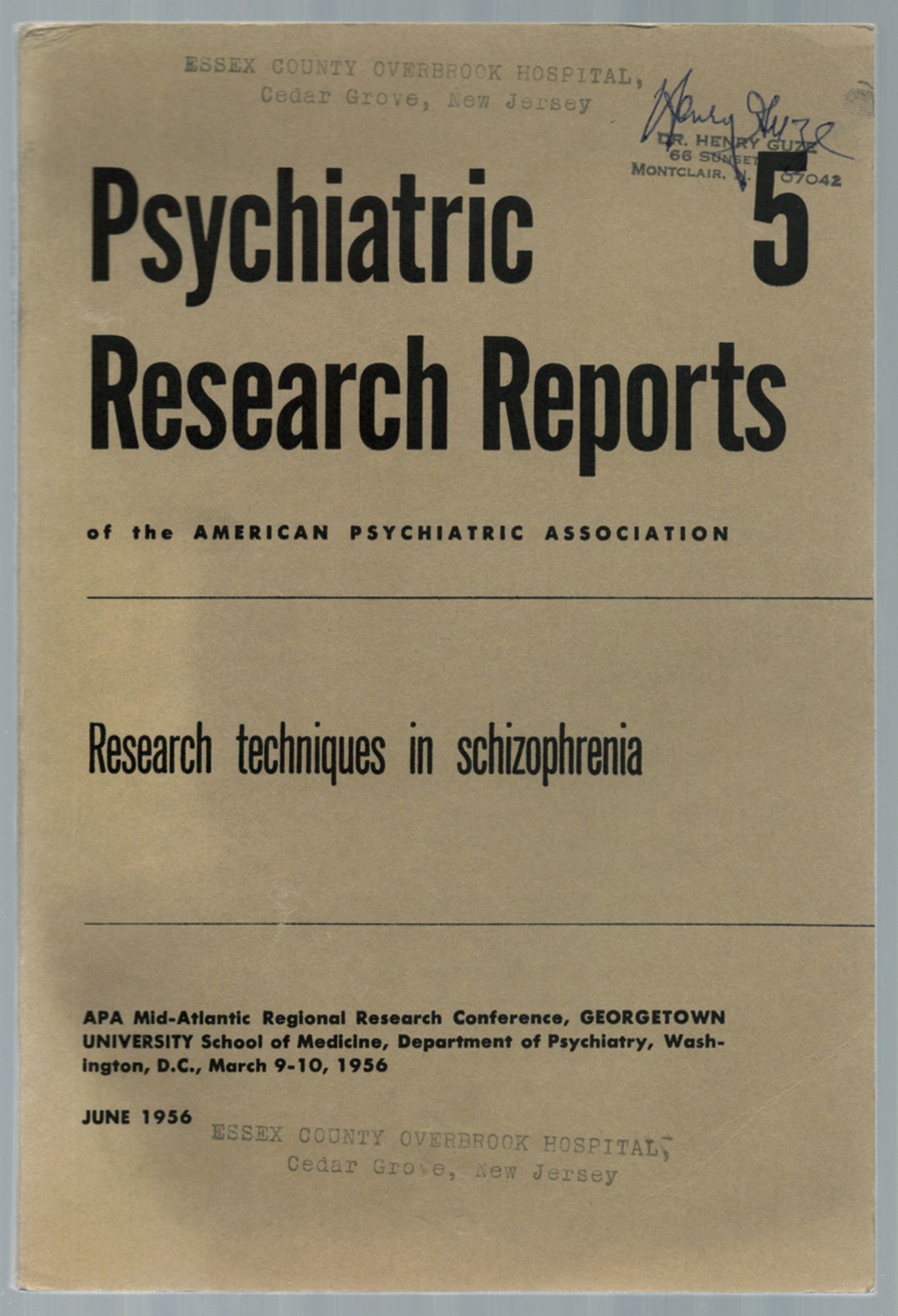 (Washington, D.C.: Psychiatric Research Reports), 1956. Softcover. Very Good. First edition. Octavo. 153pp. Printed wrappers. Ownership stamp and signature of noted American psychologist and anthropologist Henry Guze, (a founder of the American Academy of Psychotherapists, the Society for Clinical and Experimental Hypnosis, and co-founder of the Society for the Scientific Study of Sex) on the front cover, and two hospital stamps on the cover and one on the first leaf. Wrappers with some sunning and light creasing, very good. Papers presented at the 1956 Mid-Atlantic Regional Research Conference, sponsored by the American Psychiatric Association and Georgetown's Department of Psychiatry.