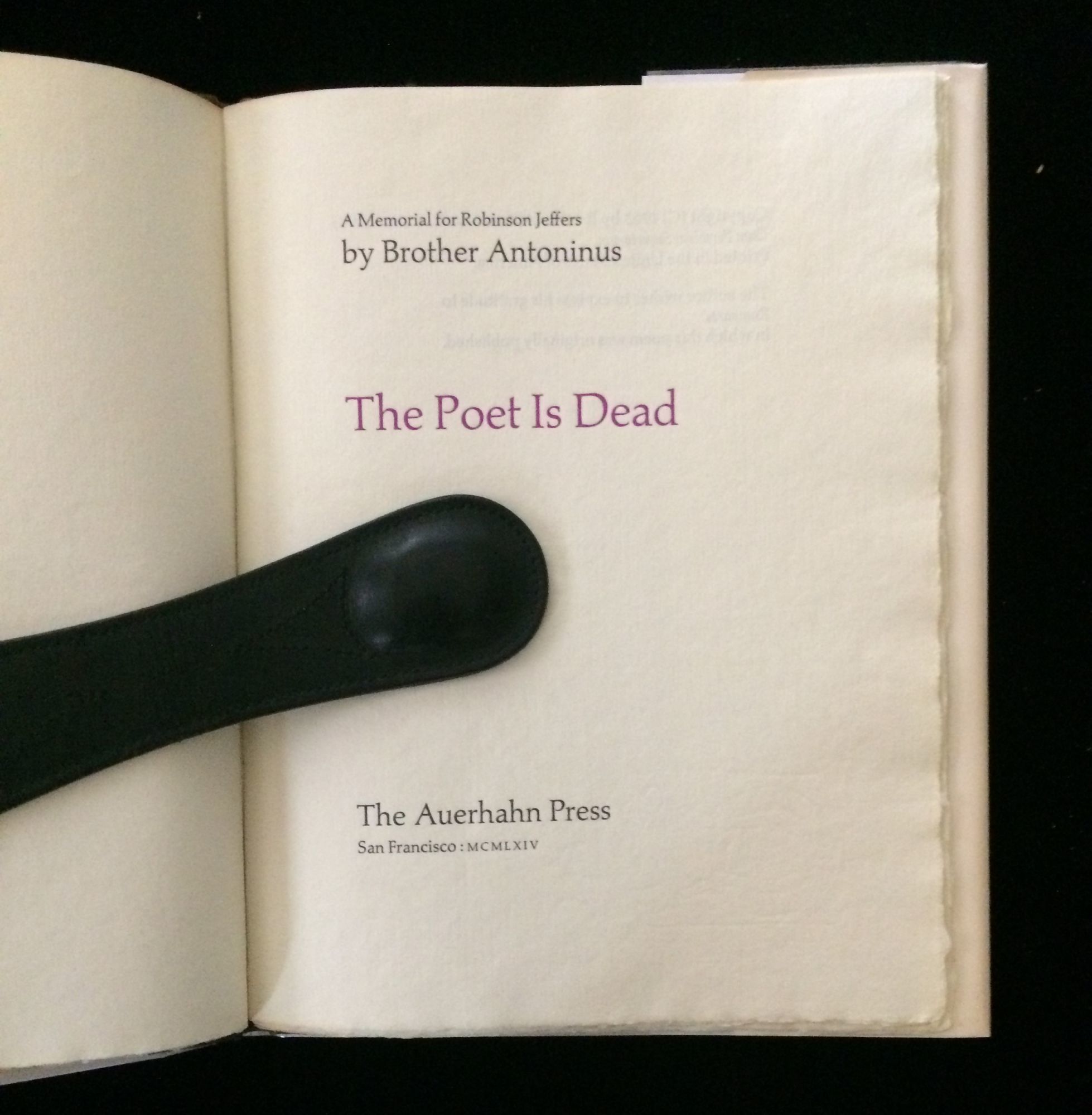 San Francisco: Auerhahn Press, 1964. 1st Edition Limited. Hardcover. Fine/Very Good. One of 200 copies of a total run of 205, this an unsigned copy. Printed in in purple and black on Tovil hand-made paper, handset Palatino type. Quarter crushed purple morocco leather spine with paper label, with trace fading of leather purple spine. Bound by Jane Grabhorn and Sally Hoyem. Plain dustjacket has some loss at spine ends, and its spine is tanned and written on it in plain block letters is title/ author/ publisher. Laid-in is ALS on Auerhahn letterhead to a collector from publisher Andrew Hoyem informing collector the title has sold out but which bookseller might still have mutiple copies.