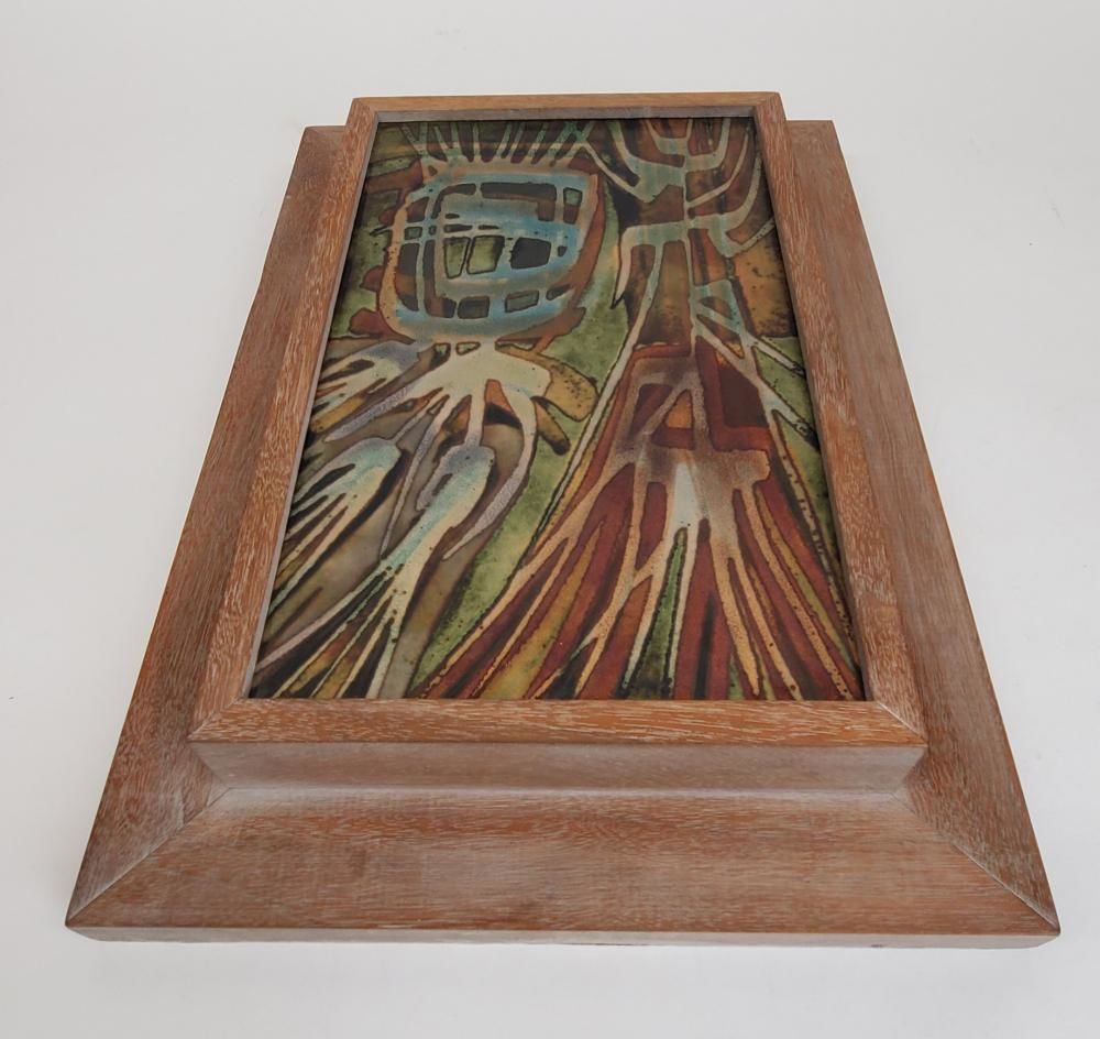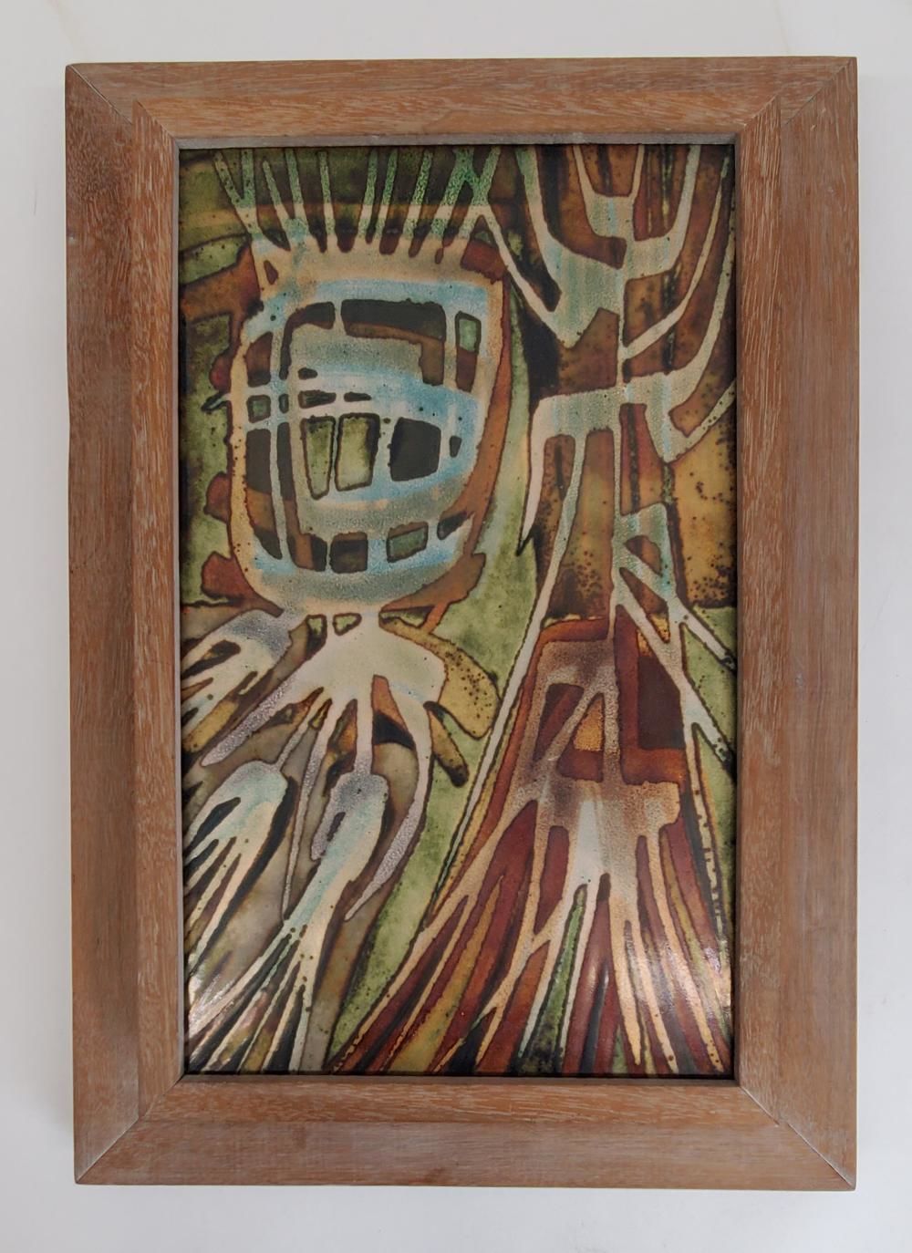 1960s. Framed copper panel with transparent enamels overlaid in an abstract design to create shades of turquoise, brown, silver, gold, and green. Very good condition; not examined out of frame. Dimensions with frame: height 14 5/8 inches x width 10 1/4 inches x depth 2 1/4 inches; panel dimensions: height 11 1/2 inches x width 7 inches. Located at Dupont store. Oppi Untracht (1922-2008) enamelist, educator, writer and photographer. "Tubular" is purported to have been the artist's personal favorite and hung above his desk for years. The consignor is Untracht's great niece, whose mother often visited the artist in Finland, where she saw it over his desk. Untracht gave this piece to the consignor's mother. We have not examined it out of the handsome mid-century frame and what, if anything, is on the verso is unknown. It is not signed or titled on the front. 1342431. Arts & Antiques.