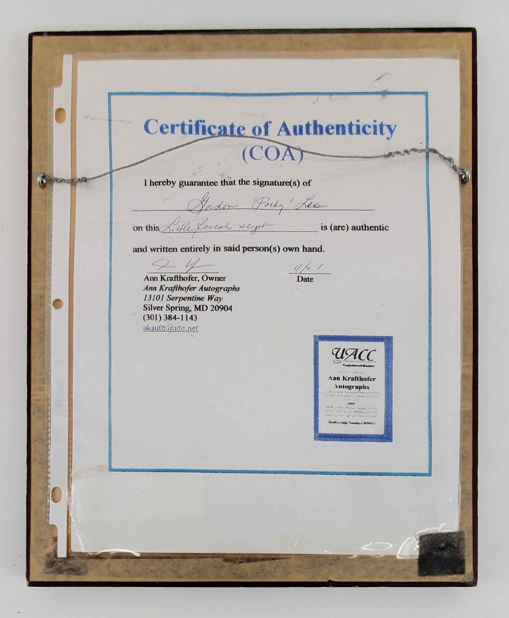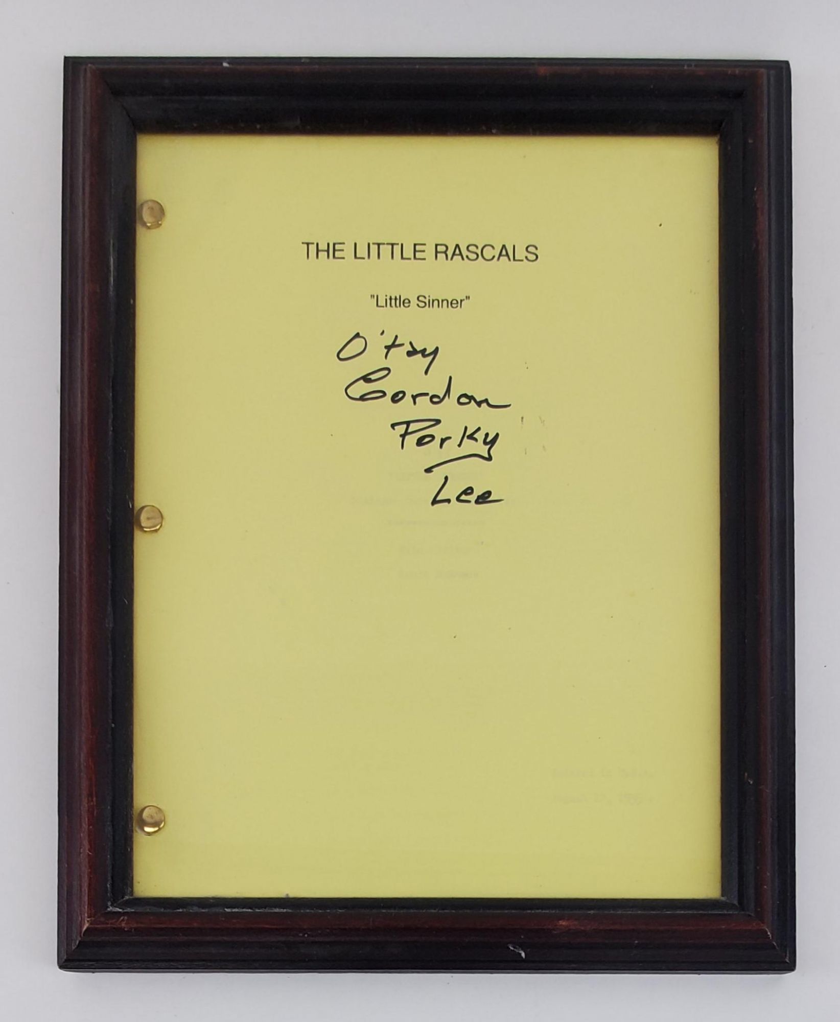A framed script of The Little Rascals Little Sinner signed by the actor Gordon "Porky" Lee with Porky’s famous line “O’Tay” on a pale yellow cover. The script is accompanied with a certificate of authenticity. Very good. Signature is bold and legible. Item is not examined out of frame. EK Consignment. Shelved at Rockville (Room Z). 1342433. Special Collections.