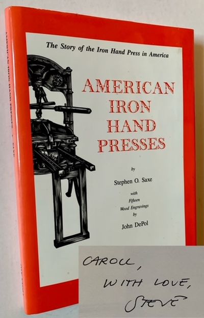 New Castle, DE: Oak Knoll Books, 1991. Cloth. Fine/Near Fine. John DePol. INSCRIBED BY THE AUTHOR STEPHEN O. SAXE on the half-title. A crisp, very sharp copy to boot of the 1991 1st edition. Tight and Fine in a bright, Near Fine dustjacket, with one narrow crease running vertically along the rear flap. Octavo, with 15 wood engravings by John DePol complementing the text.
