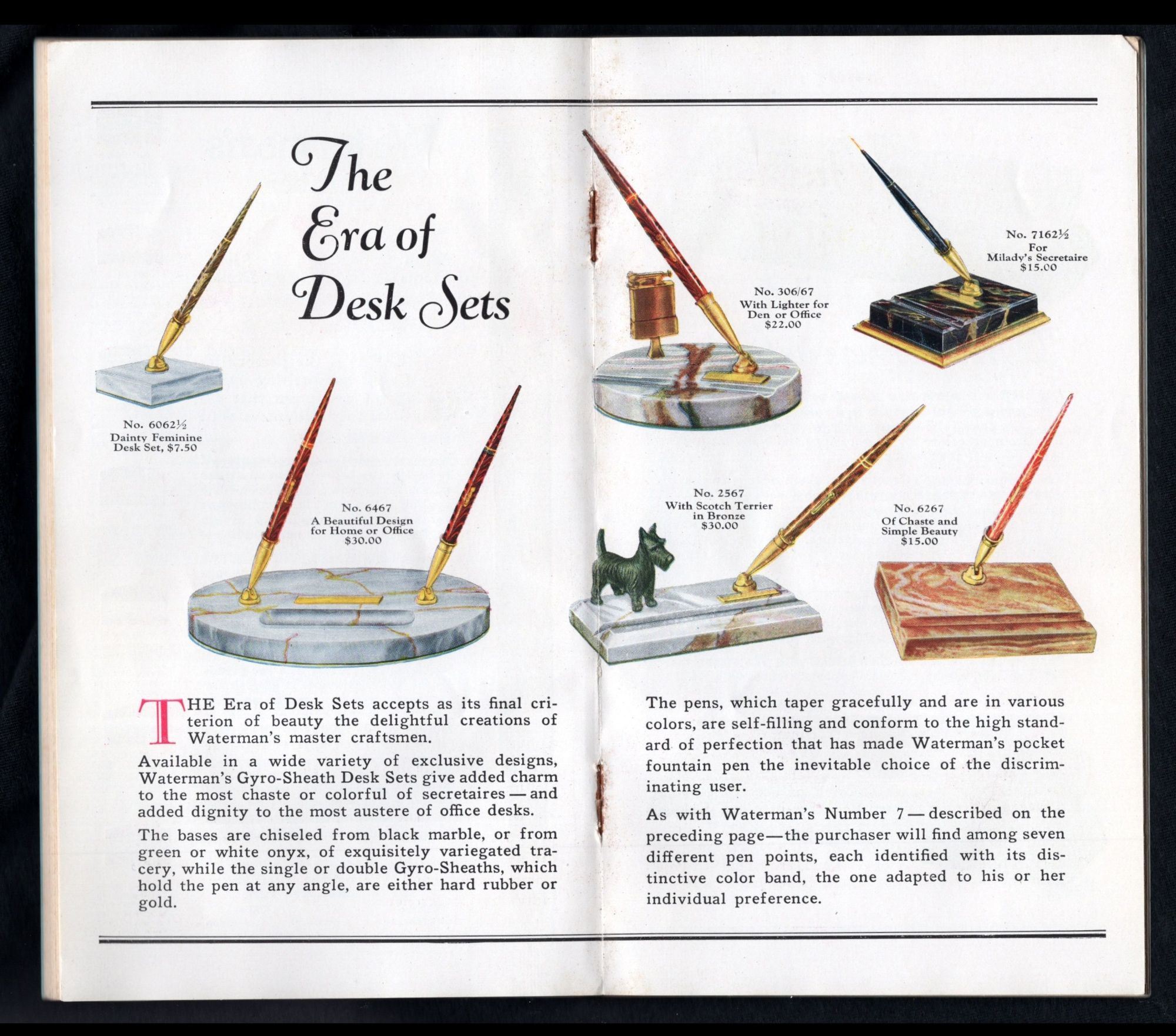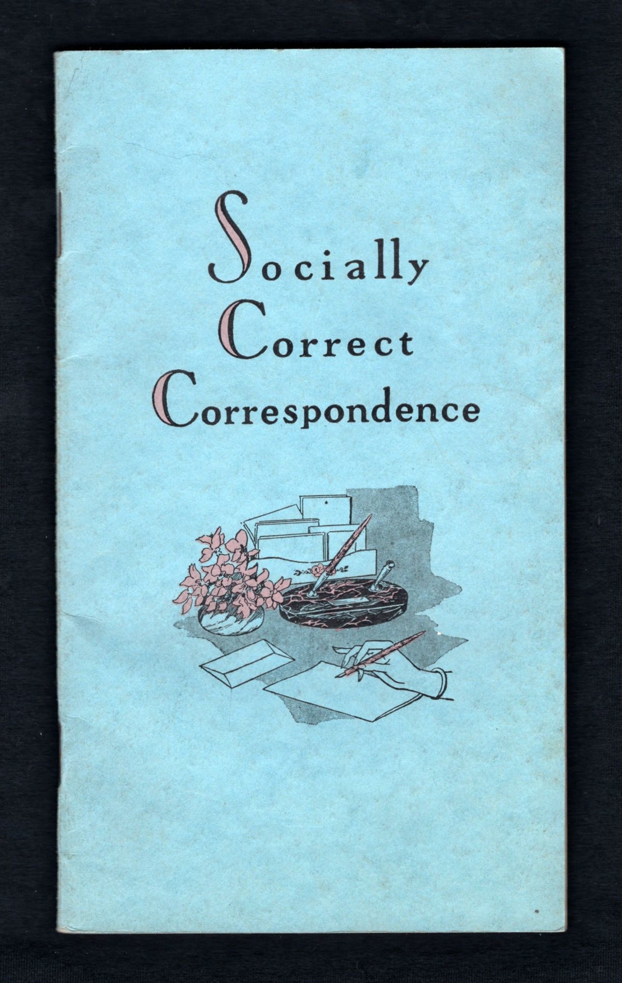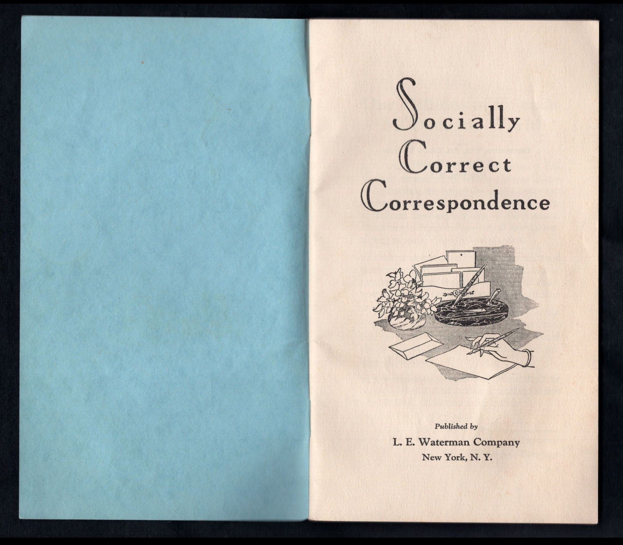 New York, NY: L. E. Waterman Company, 1929. General wear.. The booklet was produced by the L. E. Waterman Company, who sold a variety of stationary goods, but is perhaps most well known for their luxury fountain pens. It essentially functions as a 'How-to' guide for what is to be considered socially correct correspondence. The booklet provides the rules and guidelines for addressing letters, writing salutations or closings, proper uses of titles, and the do's and don'ts of letter writing. Additionally there are numerous examples of different types of letters (condolence, congratulations, thanks, or introductions) as well as invites, both formal and informal, and their replies. At the center of the booklet is an 8 pg. color insert which features picture ads for a variety of Waterman's fountains and inks. 39 pgs., plus an 8 pg. advertising insert. Blue illustrated wrappers. Staple binding. OCLC 0 (March 2021). Measures 8" x 4 1/2" The Waterman Company, also known as the L. E. Waterman Company or the Waterman Pen Company, is a manufacturing company best known for its luxury fountain pens. The firm was established in 1884 in New York City by Lewis Waterman (1837-1901), who in the early 1880s invented the first truly functional fountain pen (since prior to this they were known to leak frequently). After Lewis' death in 1901, the company was lead by his nephew, Frank D. Waterman, and it was at this point when the business truly became a success as he aggressively expanded the company worldwide. However, by the late 1920s, more innovative competitors had started to gain marker share, and after struggling through WWII, the company finally shut down in 1953. It was the company's French subsidiary, Water-JIF (Jules-Isidore Fagard), that picked up the slack, and would eventually absorbed what remained of the British and American arms of the company. Bic Company acquired Waterman in 1958, later selling it to the Gillette Company (now known as Proctor & Gamble) in 1987, who then sold it to Sanford (now a division of Newell Brands) around 2000. The Waterman Company, now known as Waterman Paris, and located in Paris, Franc, still manufactures luxury fountain pens today.