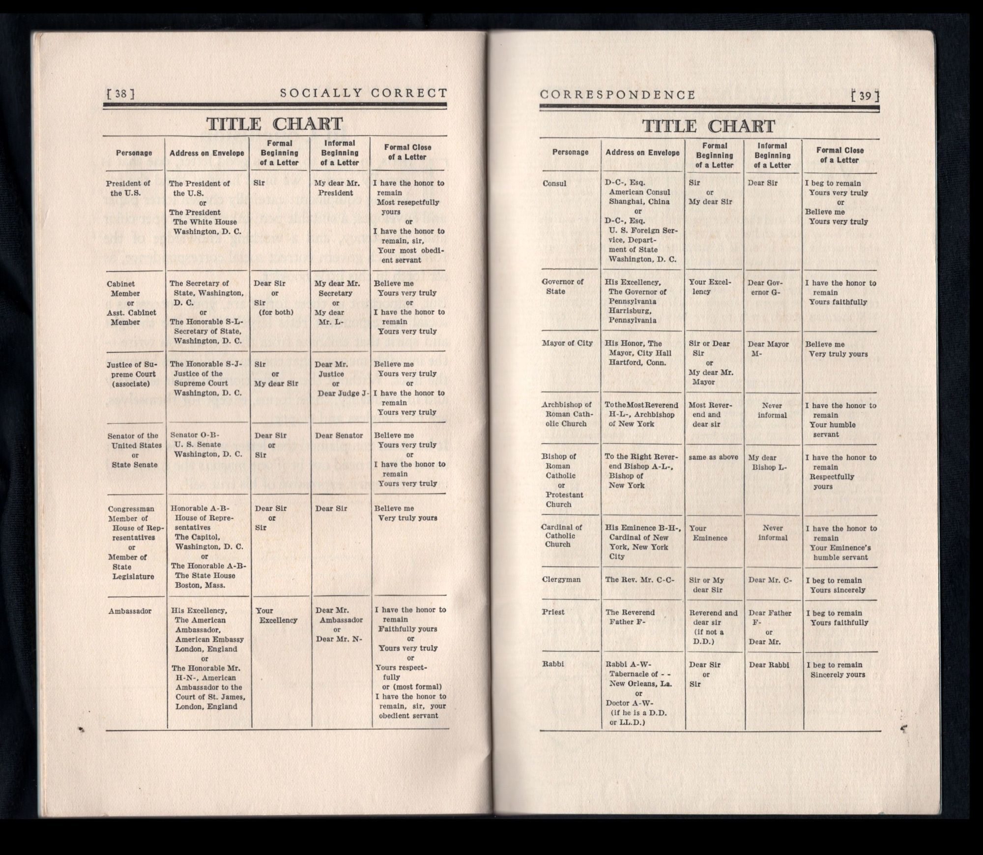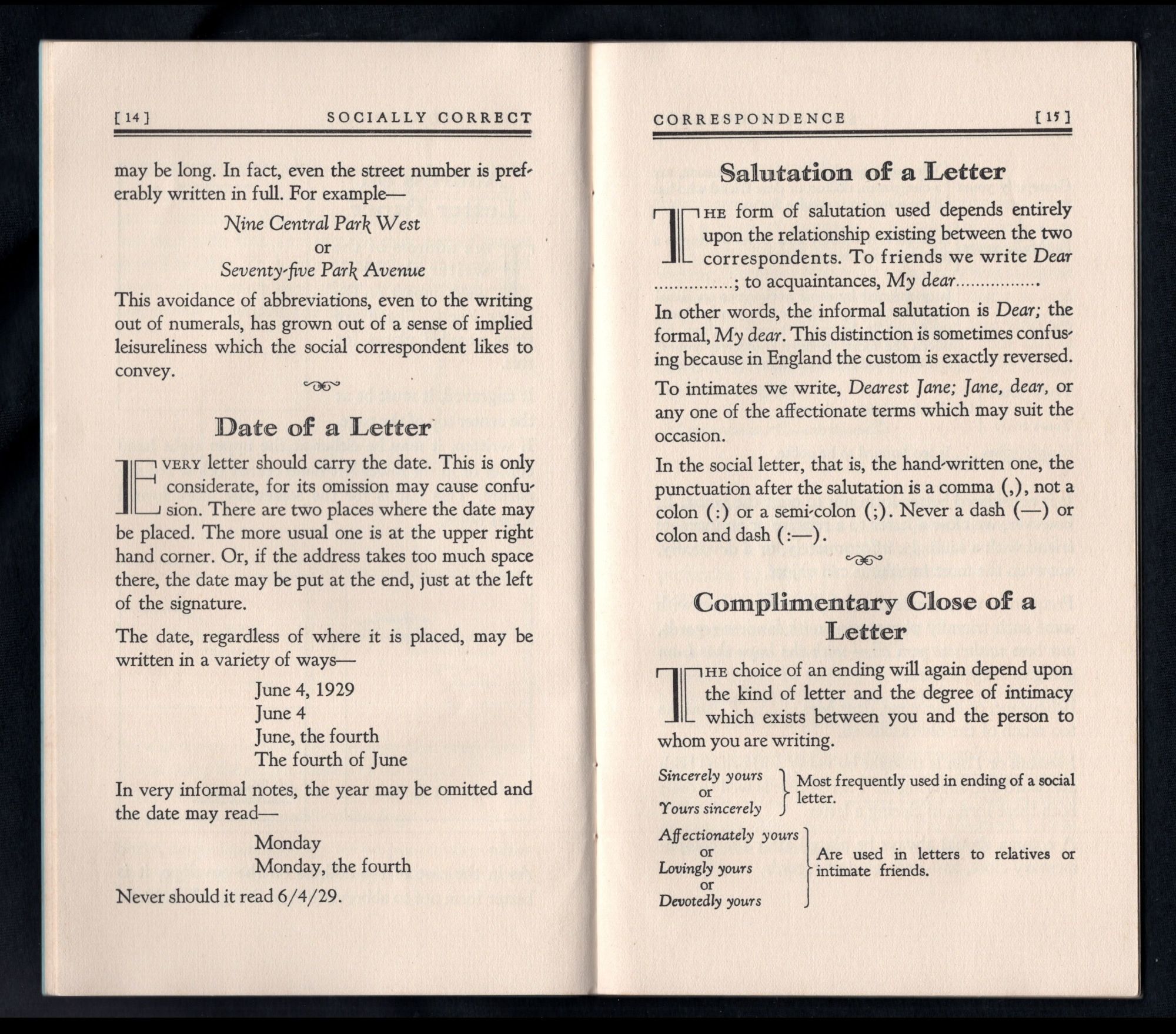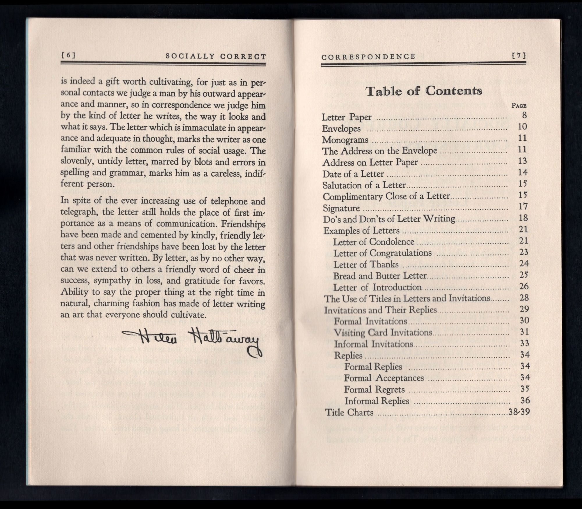 New York, NY: L. E. Waterman Company, 1929. General wear.. The booklet was produced by the L. E. Waterman Company, who sold a variety of stationary goods, but is perhaps most well known for their luxury fountain pens. It essentially functions as a 'How-to' guide for what is to be considered socially correct correspondence. The booklet provides the rules and guidelines for addressing letters, writing salutations or closings, proper uses of titles, and the do's and don'ts of letter writing. Additionally there are numerous examples of different types of letters (condolence, congratulations, thanks, or introductions) as well as invites, both formal and informal, and their replies. At the center of the booklet is an 8 pg. color insert which features picture ads for a variety of Waterman's fountains and inks. 39 pgs., plus an 8 pg. advertising insert. Blue illustrated wrappers. Staple binding. OCLC 0 (March 2021). Measures 8" x 4 1/2" The Waterman Company, also known as the L. E. Waterman Company or the Waterman Pen Company, is a manufacturing company best known for its luxury fountain pens. The firm was established in 1884 in New York City by Lewis Waterman (1837-1901), who in the early 1880s invented the first truly functional fountain pen (since prior to this they were known to leak frequently). After Lewis' death in 1901, the company was lead by his nephew, Frank D. Waterman, and it was at this point when the business truly became a success as he aggressively expanded the company worldwide. However, by the late 1920s, more innovative competitors had started to gain marker share, and after struggling through WWII, the company finally shut down in 1953. It was the company's French subsidiary, Water-JIF (Jules-Isidore Fagard), that picked up the slack, and would eventually absorbed what remained of the British and American arms of the company. Bic Company acquired Waterman in 1958, later selling it to the Gillette Company (now known as Proctor & Gamble) in 1987, who then sold it to Sanford (now a division of Newell Brands) around 2000. The Waterman Company, now known as Waterman Paris, and located in Paris, Franc, still manufactures luxury fountain pens today.