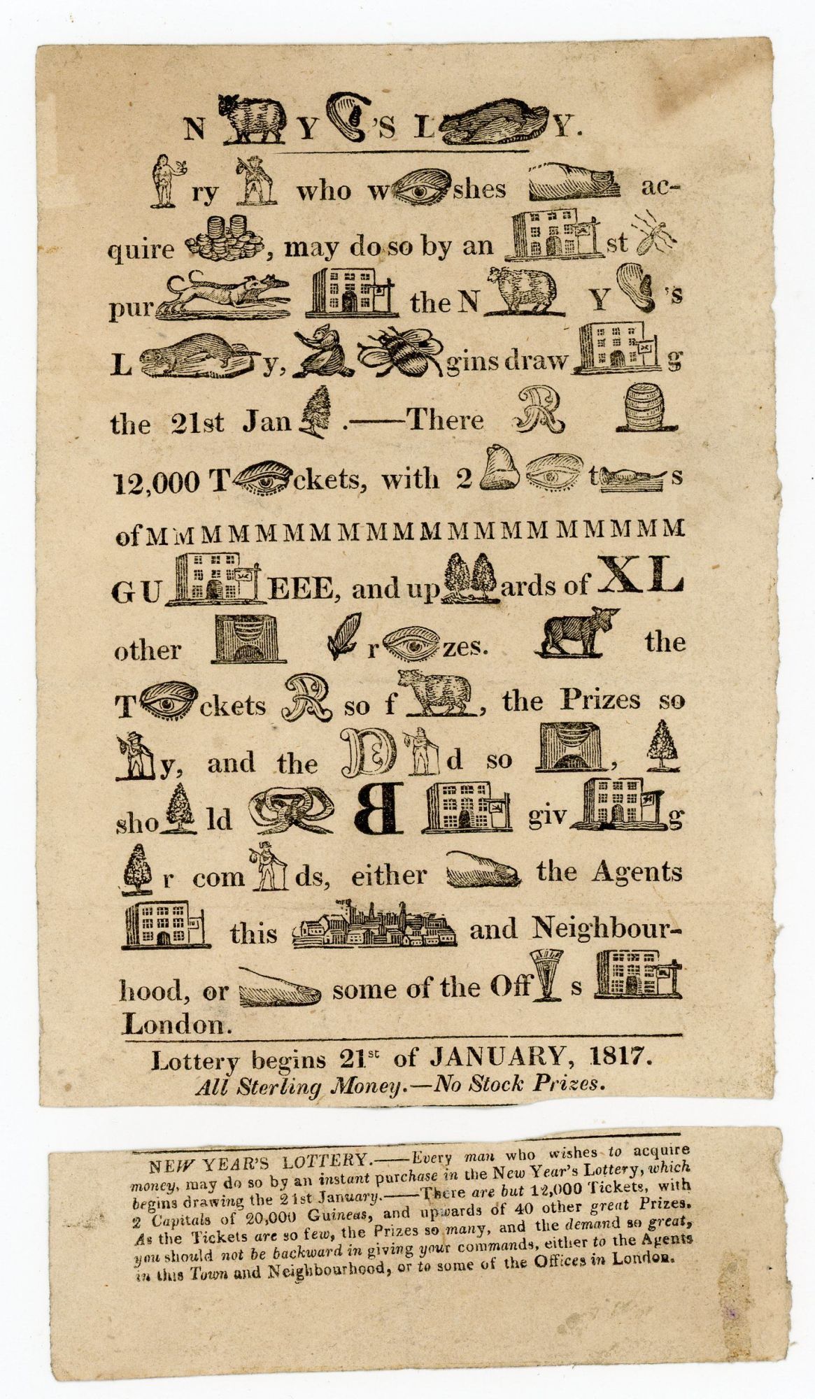Lottery ticket - 1817 - A 7 3/4" x 4 1/2" UK New Year's lottery announcement with a comprehensive rebus and a printed translation at base. - All Sterling Money - No Stock Prizes