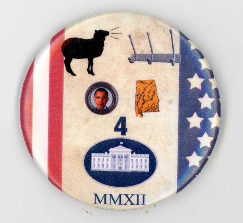 Political Campaign Button - A 2 1/2" campaign button reading "Baa" Rake "O" Alabama 4 Whitehouse 2012. In linguistics, the rebus principle is the use of existing symbols, such as pictograms, purely for their sounds regardless of their meaning, to represent new words. Many ancient writing systems used the rebus principle to represent abstract words, which otherwise would be hard to represent with pictograms. An example that illustrates the Rebus principle is the representation of the sentence "I can see you" by using the pictographs of "eye—can—sea—ewe