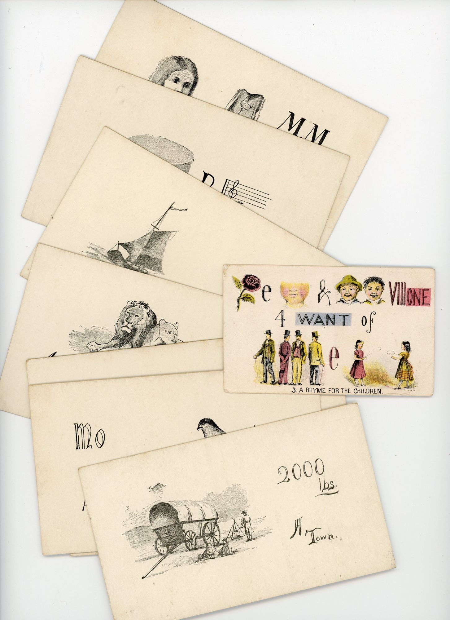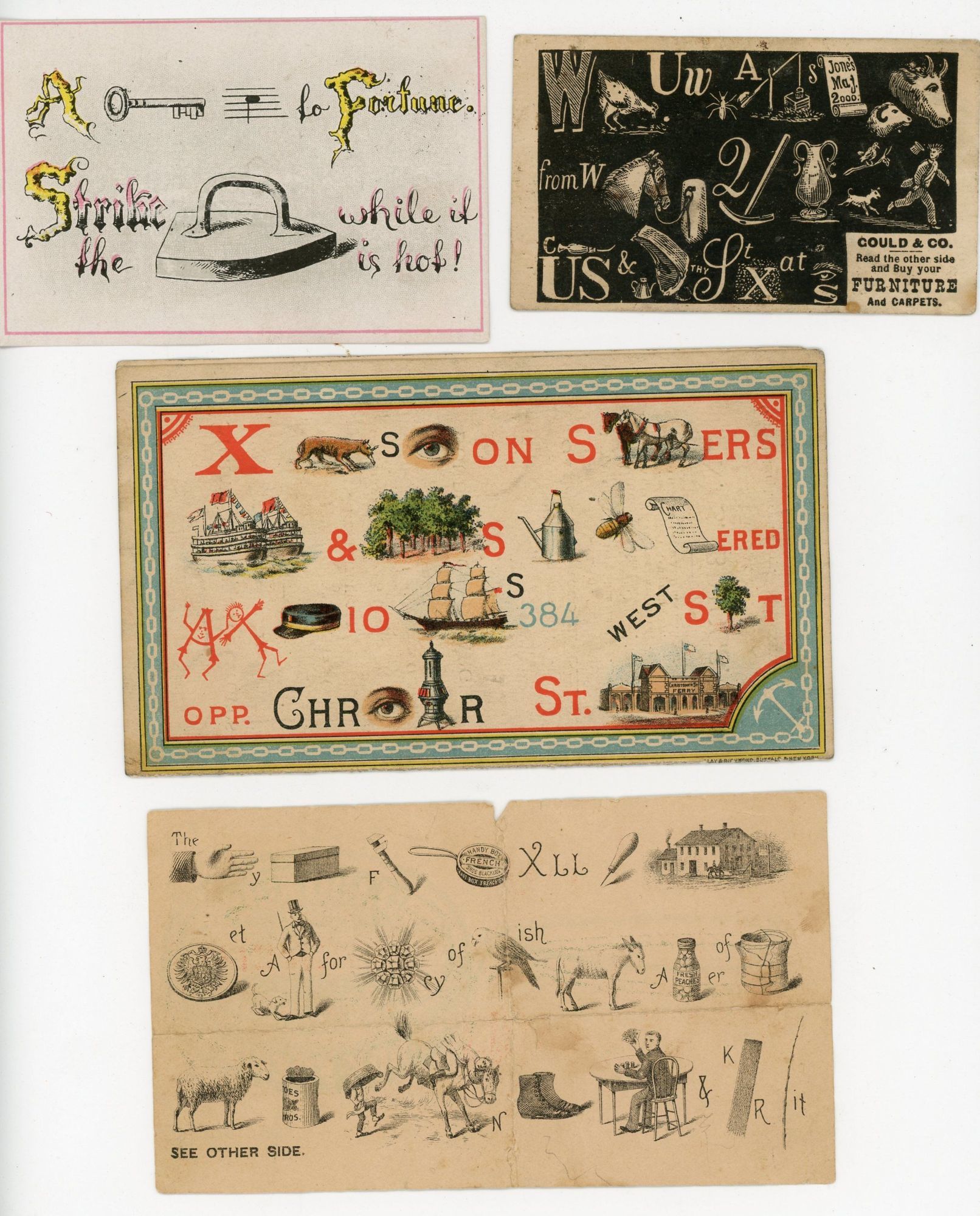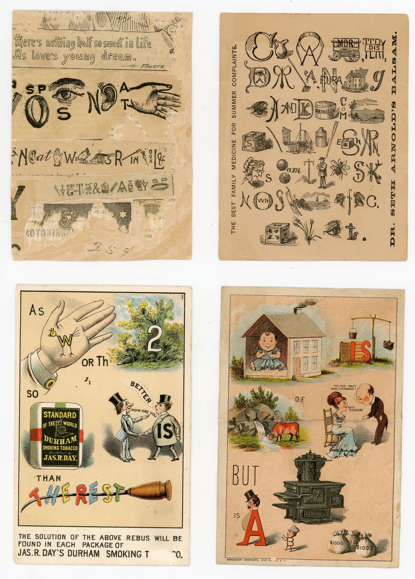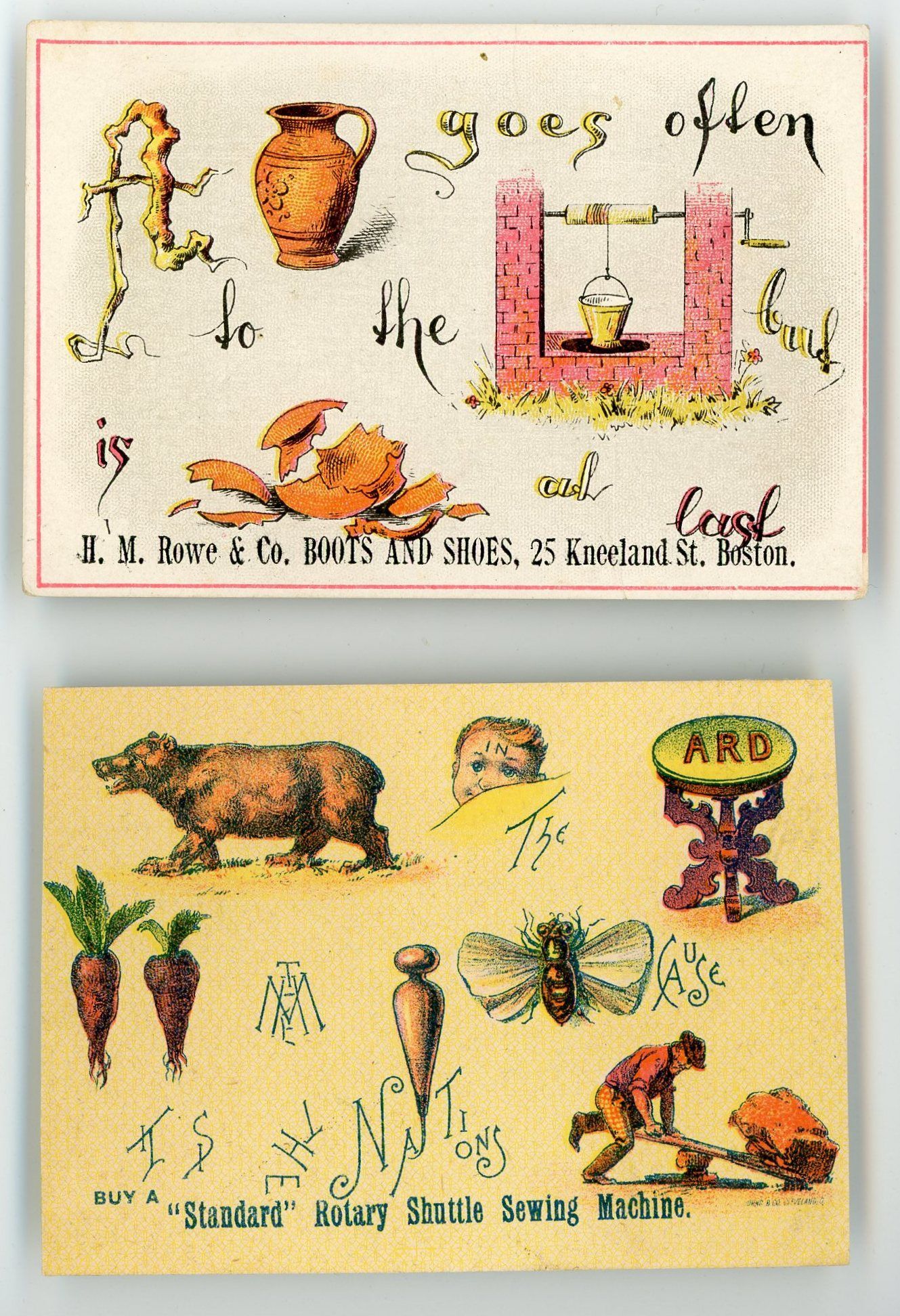 Advertising trade cards - 1860s-1880s An array of 9 trade cards including an 1860s white on black rebus of almost exclusively pictograms, cards that incorporate the product into the rebus such as the 1880s Durham Smoking Tobacco card, French Shoe black or Chart Oak Stove