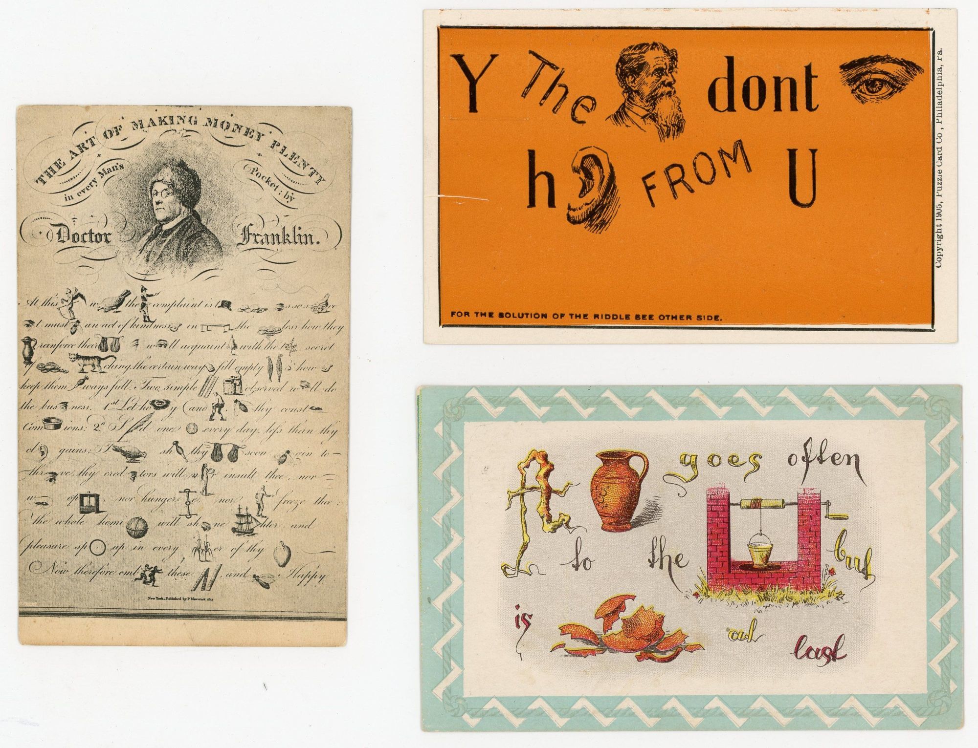 Postcards - 3 cards with various levels of complexity - the first being a c1905 reprint of The Art of Making Money Plenty in every Man's Pocket by Doctor Franklin originally produced in 1854 a card with the solution to the rebus to be found beneath the postage stamp and a proverb card.