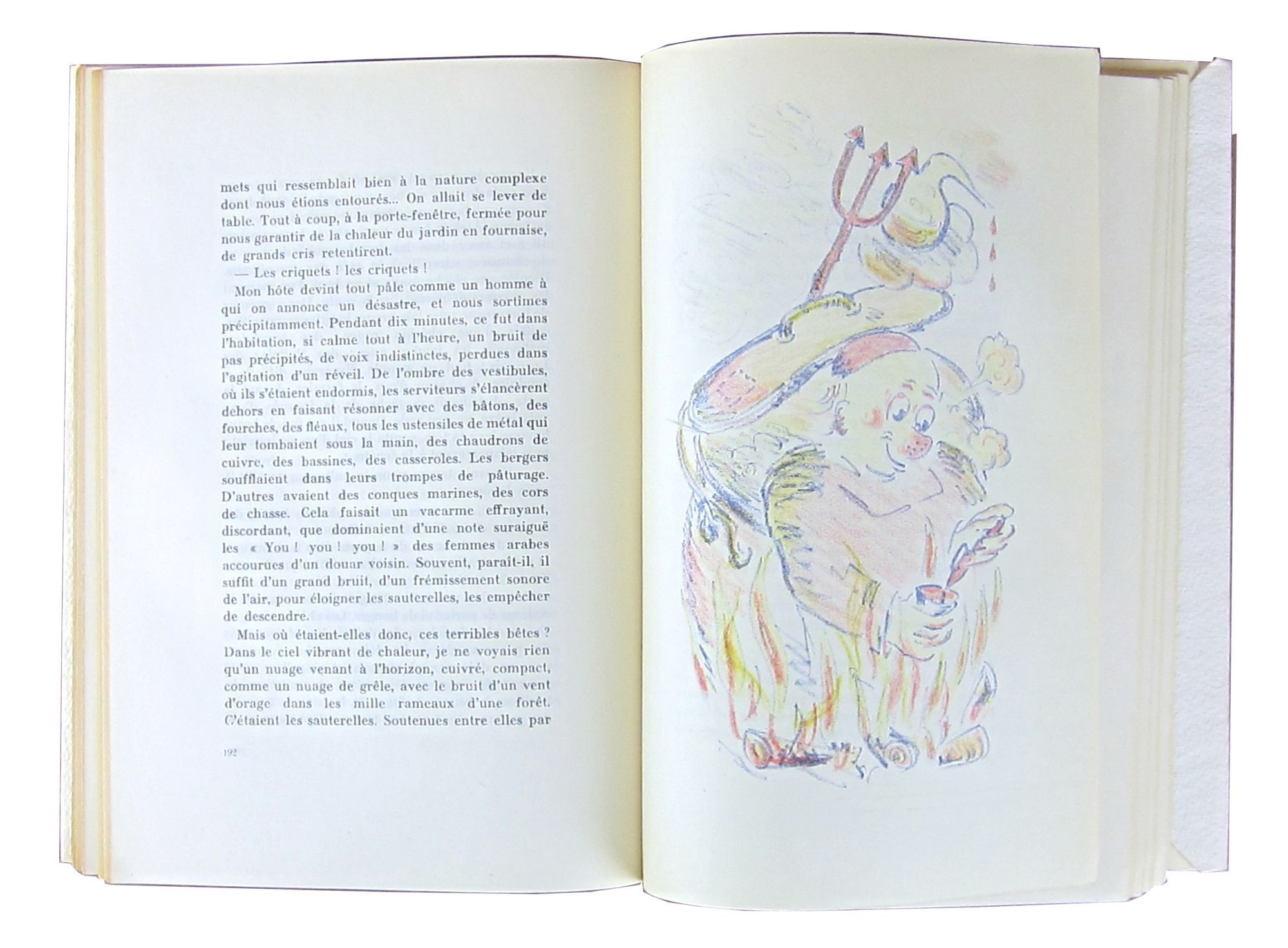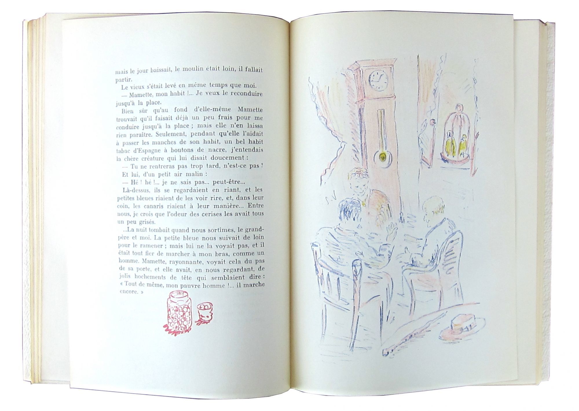 Daudet's classic 1869 collection of short stories of provincial French life is here illustrated with pastel lithographs, and ornamented with chapter titles, framed initials, and decorative vignettes in carmine red. About P.-J. Emery, the illustrator with a truly charming talent, we have discovered nothing. Our keen French detective sense suggests a connection to the publisher, Jean Emery.