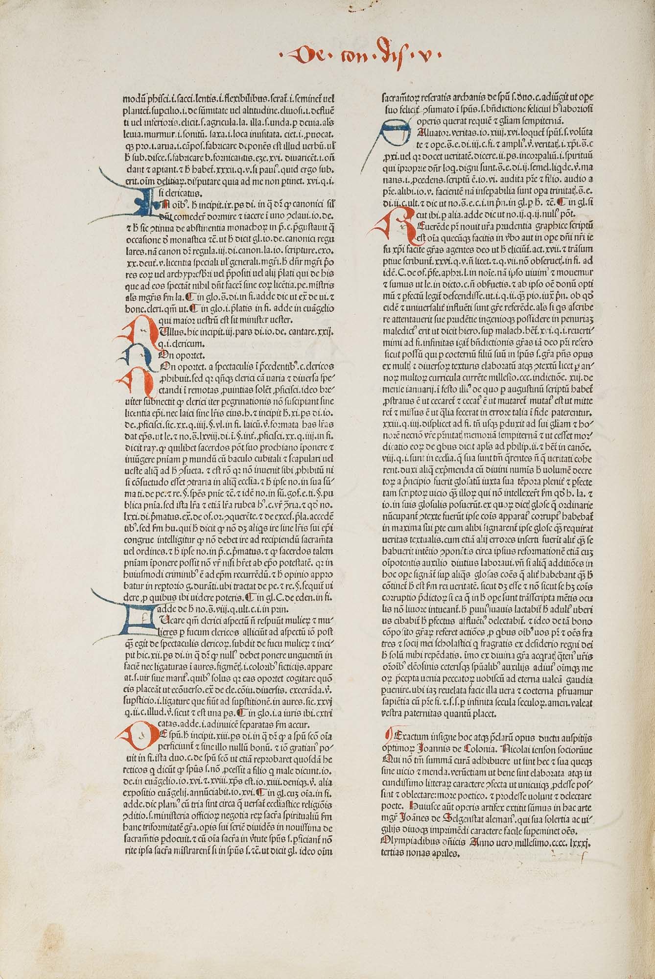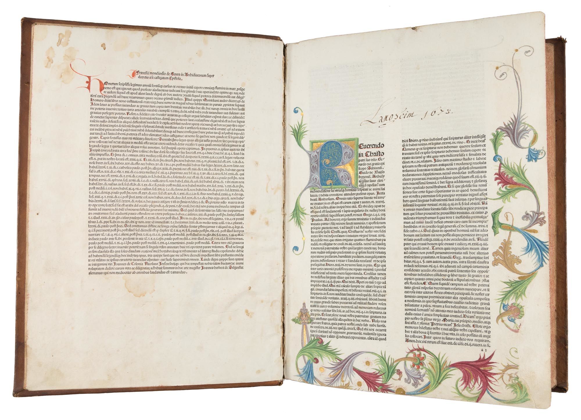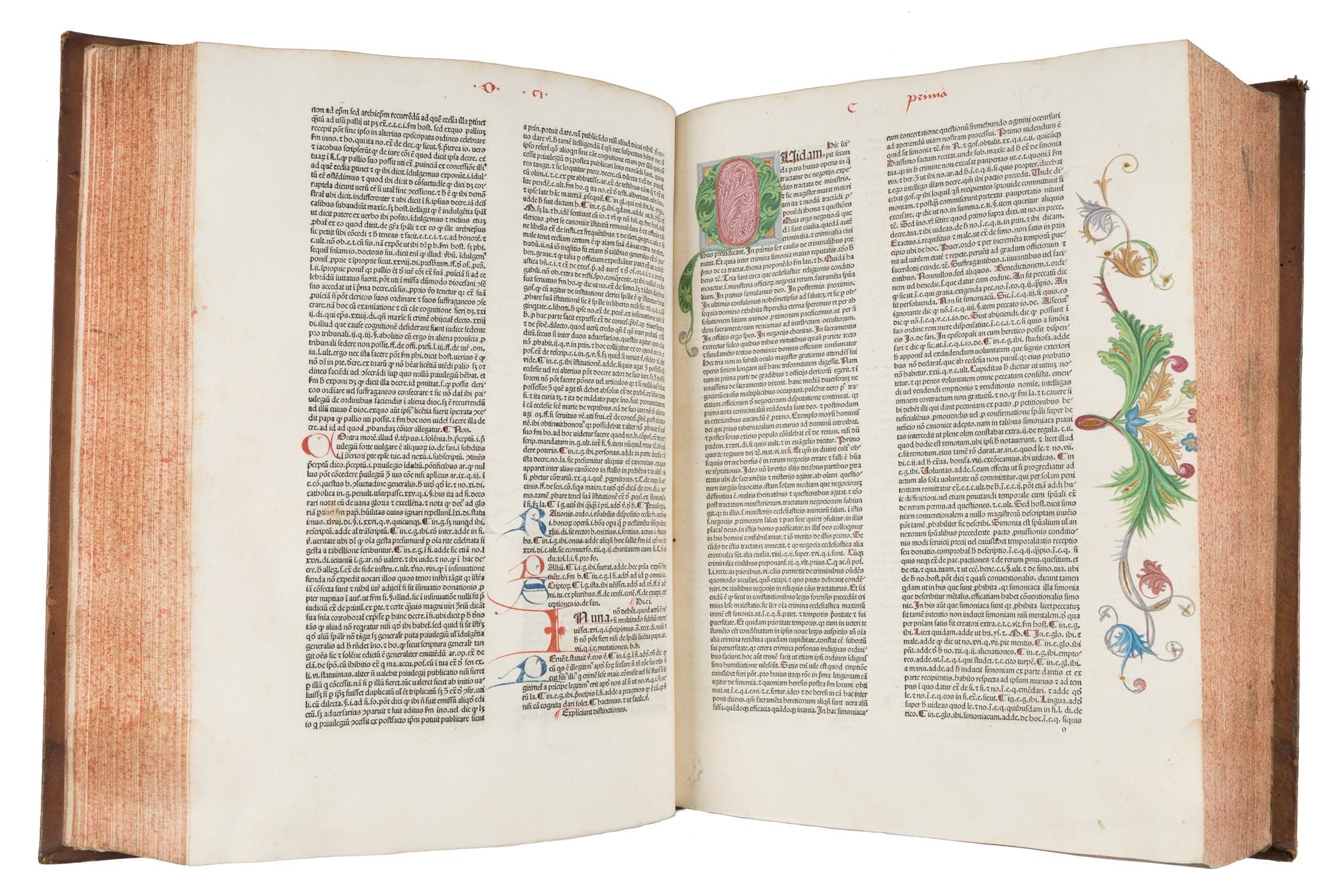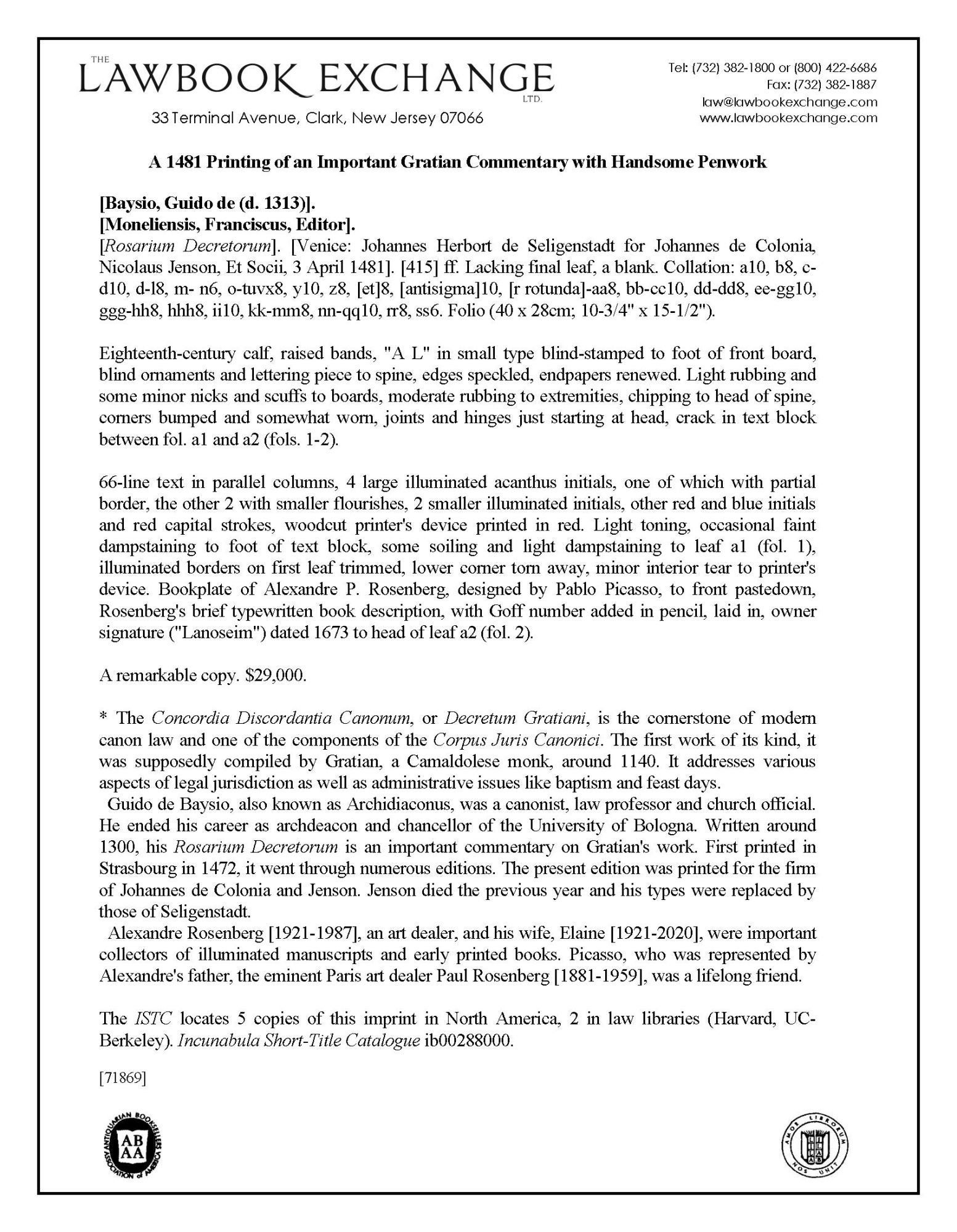 1481. Venice: Nicolaus Jenson, 1481.. Venice: Nicolaus Jenson, 1481. Copy of a 1481 Printing of an Important Gratian Commentary with Handsome Penwork, A Distinguished Provenance and a Bookplate Designed by Picasso [Baysio, Guido de (d. 1313)]. [Moneliensis, Franciscus, Editor]. [Rosarium Decretorum]. [Venice: Johannes Herbort de Seligenstadt for Johannes de Colonia, Nicolaus Jenson, Et Socii, 3 April 1481]. [415] ff. Lacking final leaf, a blank. Collation: a10, b8, c-d10, d-l8, m-n6, o-tuvx8, y10, z8, [et]8, [antisigma]10, [r rotunda]-aa8, bb-cc10, dd-dd8, ee-gg10, ggg-hh8, hhh8, ii10, kk-mm8, nn-qq10, rr8, ss6. Folio (40 x 28cm; 10-3/4" x 15-1/2"). Incunabula Short-Title Catalogue ib00288000 (5 copies in North America, 2 in law libraries: Harvard, UC-Berkeley). Eighteenth-century calf, raised bands, "A L" in small type blind-stamped to foot of front board, blind ornaments and lettering piece to spine, edges speckled, endpapers renewed. Light rubbing and some minor nicks and scuffs to boards, moderate rubbing to extremities, chipping to head of spine, corners bumped and somewhat worn, joints and hinges just starting at head, crack in text block between fol. a1 and a2 (fols. 1-2). 66-line text in parallel columns, 4 large illuminated acanthus initials, one of which with partial border, the other 2 with smaller flourishes, 2 smaller illuminated initials, other red and blue initials and red capital strokes, woodcut printer's device printed in red. Light toning, occasional faint dampstaining to foot of text block, some soiling and light dampstaining to leaf a1 (fol. 1), illuminated borders on first leaf trimmed, lower corner torn away, minor interior tear to printer's device. Bookplate of Alexandre P. Rosenberg, designed by Pablo Picasso, to front pastedown, Rosenberg's brief typewritten book description, with Goff number added in pencil, laid in, owner signature ("Lanoseim") dated 1673 to head of leaf a2 (fol. 2). A remarkable copy. $29,000. **THIS DESCRIPTION IS TRUNCATED DUE TO CHARACTER LIMITS. PLEASE CONTACT US FOR A COMPLETE VERSION.** * The Concordia Discordantia Canonum, or Decretum Gratiani, is the cornerstone of modern canon law and one of the components of the Corpus Juris Canonici. The first work of its kind, it was supposedly compiled by Gratian, a Camaldolese monk, around 1140. It addresses various aspects of legal jurisdiction as well as administrative issues li.