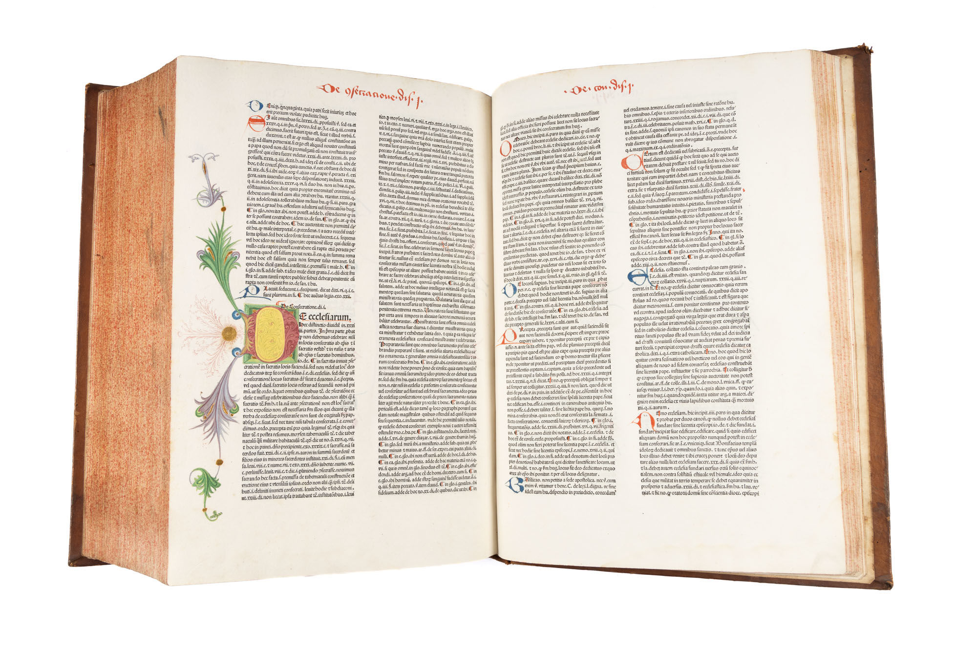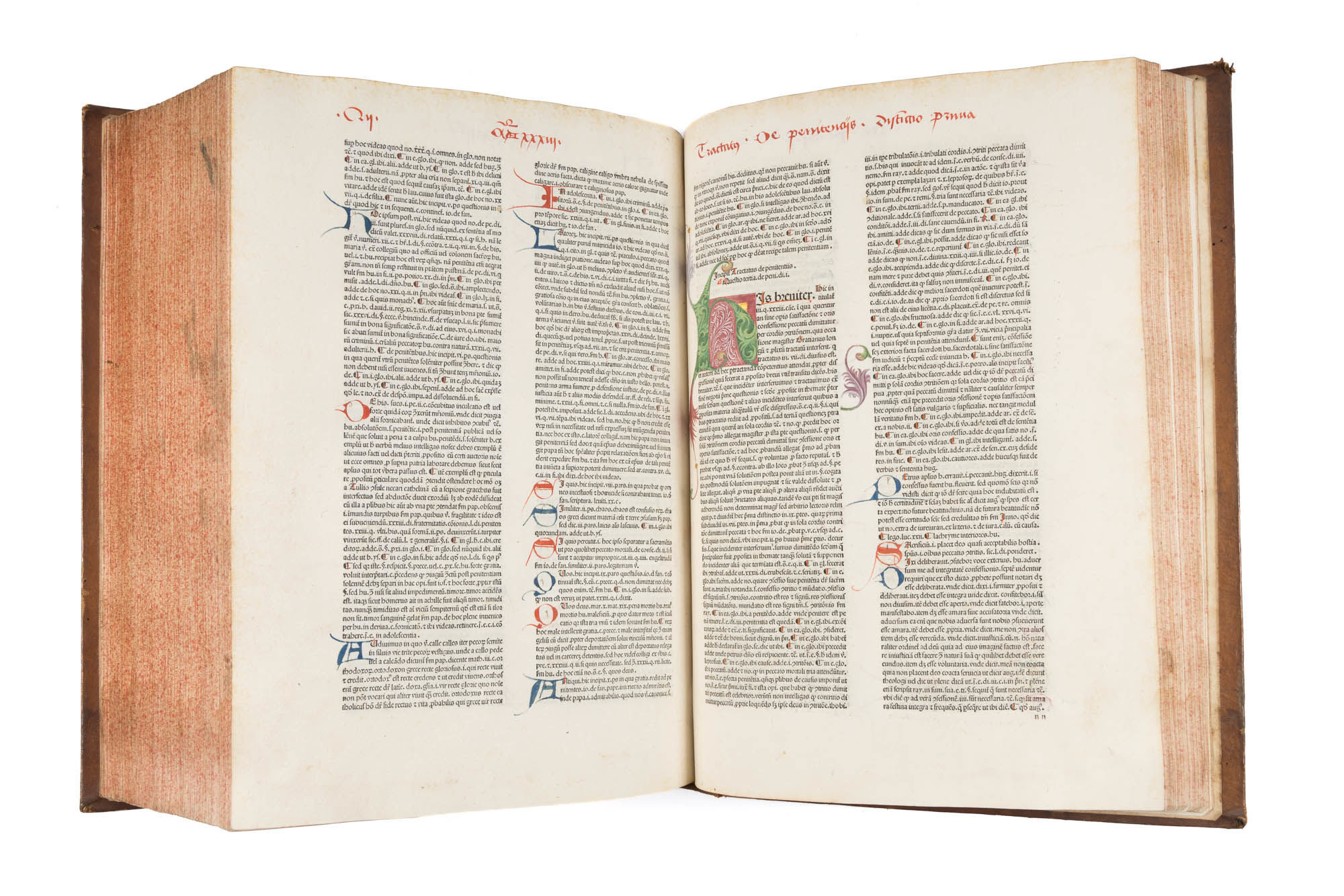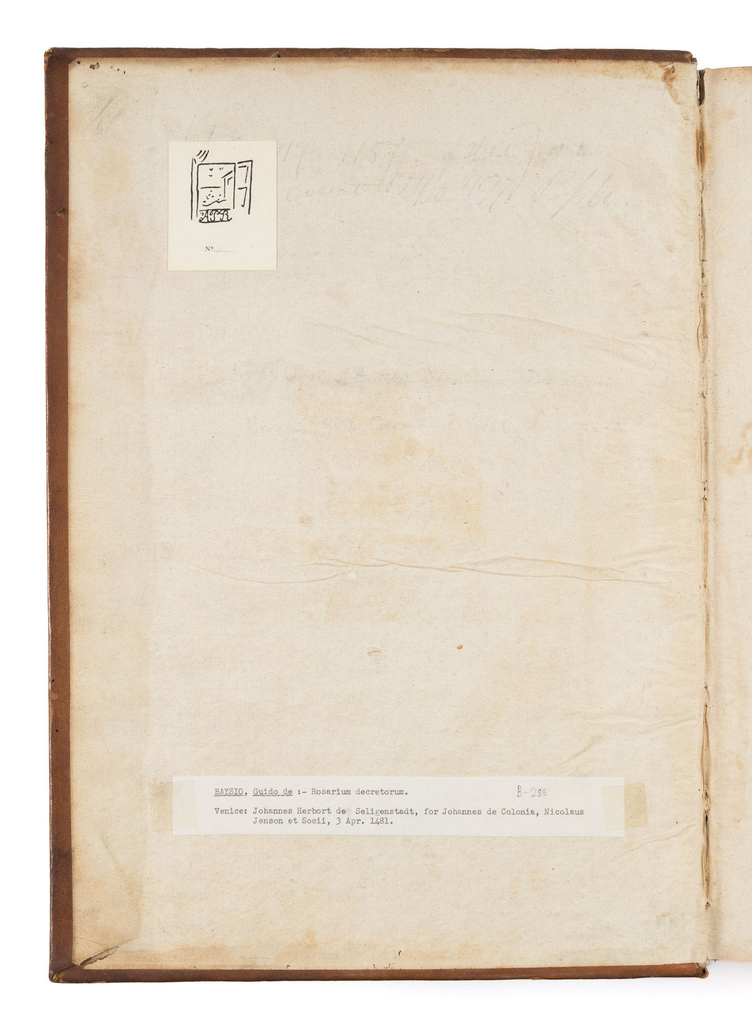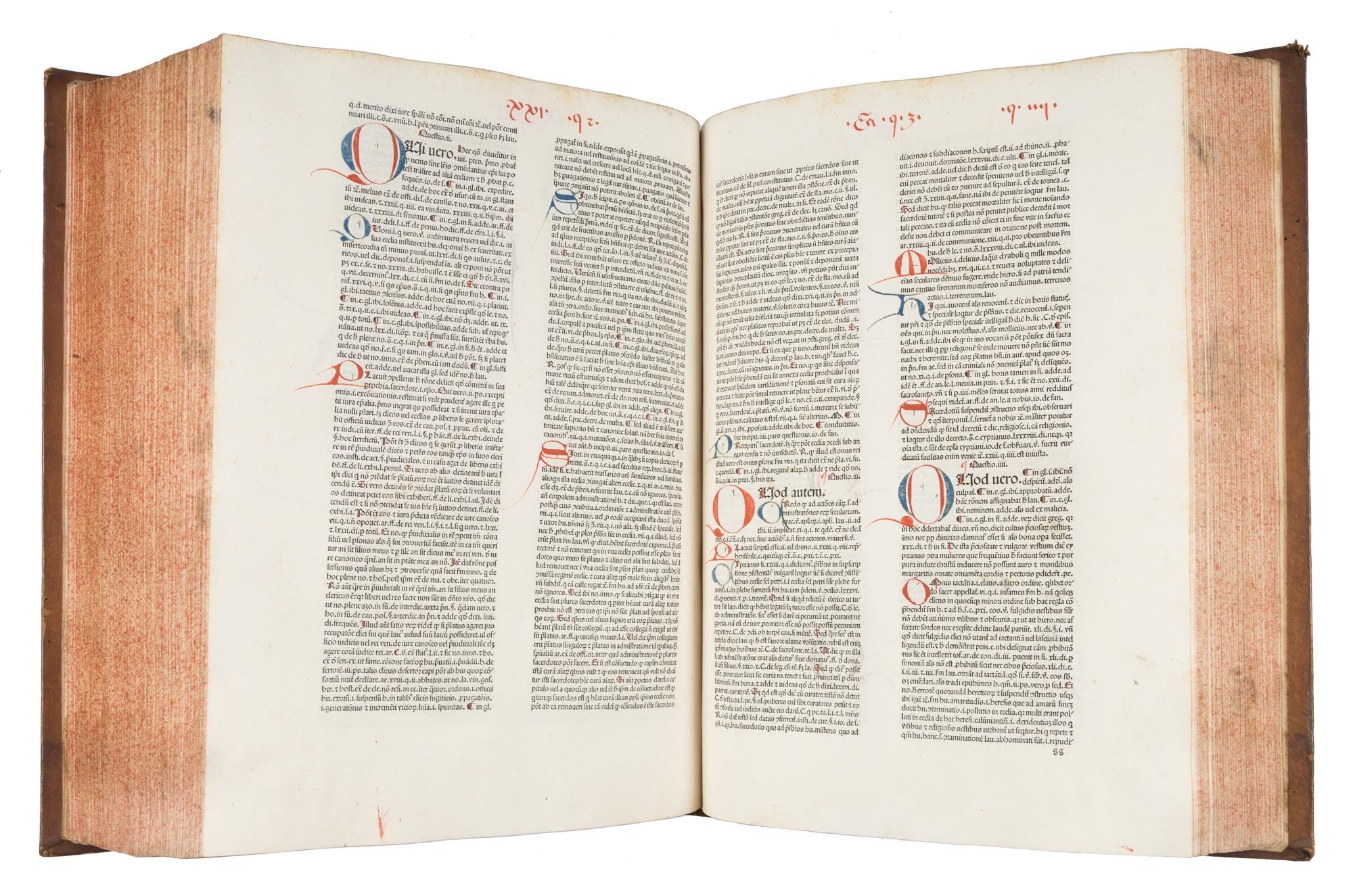 1481. Venice: Nicolaus Jenson, 1481.. Venice: Nicolaus Jenson, 1481. Copy of a 1481 Printing of an Important Gratian Commentary with Handsome Penwork, A Distinguished Provenance and a Bookplate Designed by Picasso [Baysio, Guido de (d. 1313)]. [Moneliensis, Franciscus, Editor]. [Rosarium Decretorum]. [Venice: Johannes Herbort de Seligenstadt for Johannes de Colonia, Nicolaus Jenson, Et Socii, 3 April 1481]. [415] ff. Lacking final leaf, a blank. Collation: a10, b8, c-d10, d-l8, m-n6, o-tuvx8, y10, z8, [et]8, [antisigma]10, [r rotunda]-aa8, bb-cc10, dd-dd8, ee-gg10, ggg-hh8, hhh8, ii10, kk-mm8, nn-qq10, rr8, ss6. Folio (40 x 28cm; 10-3/4" x 15-1/2"). Incunabula Short-Title Catalogue ib00288000 (5 copies in North America, 2 in law libraries: Harvard, UC-Berkeley). Eighteenth-century calf, raised bands, "A L" in small type blind-stamped to foot of front board, blind ornaments and lettering piece to spine, edges speckled, endpapers renewed. Light rubbing and some minor nicks and scuffs to boards, moderate rubbing to extremities, chipping to head of spine, corners bumped and somewhat worn, joints and hinges just starting at head, crack in text block between fol. a1 and a2 (fols. 1-2). 66-line text in parallel columns, 4 large illuminated acanthus initials, one of which with partial border, the other 2 with smaller flourishes, 2 smaller illuminated initials, other red and blue initials and red capital strokes, woodcut printer's device printed in red. Light toning, occasional faint dampstaining to foot of text block, some soiling and light dampstaining to leaf a1 (fol. 1), illuminated borders on first leaf trimmed, lower corner torn away, minor interior tear to printer's device. Bookplate of Alexandre P. Rosenberg, designed by Pablo Picasso, to front pastedown, Rosenberg's brief typewritten book description, with Goff number added in pencil, laid in, owner signature ("Lanoseim") dated 1673 to head of leaf a2 (fol. 2). A remarkable copy. $29,000. **THIS DESCRIPTION IS TRUNCATED DUE TO CHARACTER LIMITS. PLEASE CONTACT US FOR A COMPLETE VERSION.** * The Concordia Discordantia Canonum, or Decretum Gratiani, is the cornerstone of modern canon law and one of the components of the Corpus Juris Canonici. The first work of its kind, it was supposedly compiled by Gratian, a Camaldolese monk, around 1140. It addresses various aspects of legal jurisdiction as well as administrative issues li.