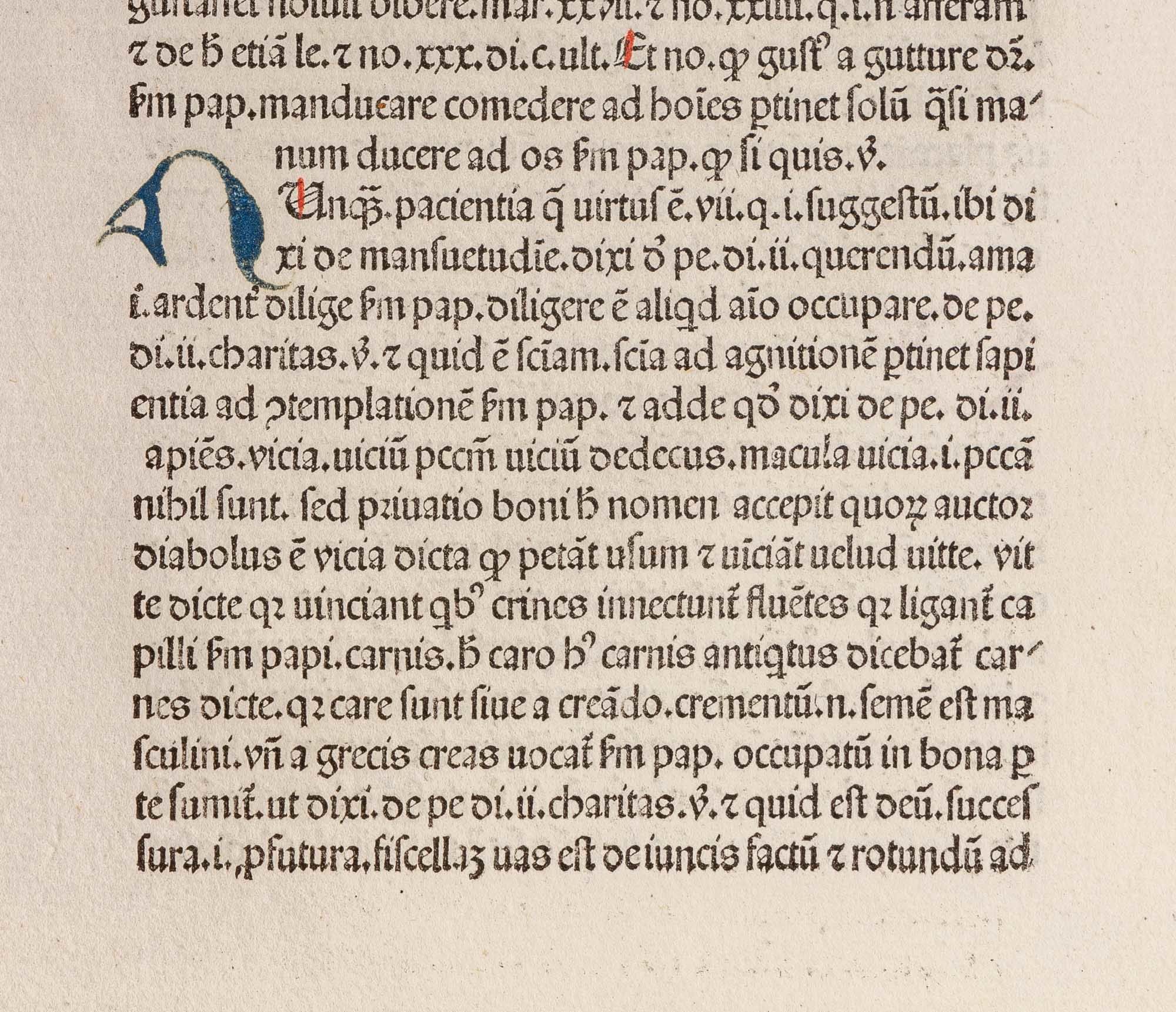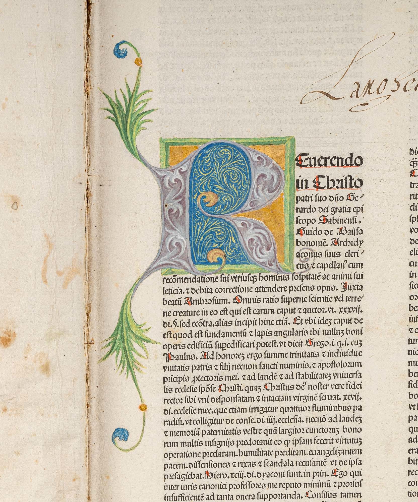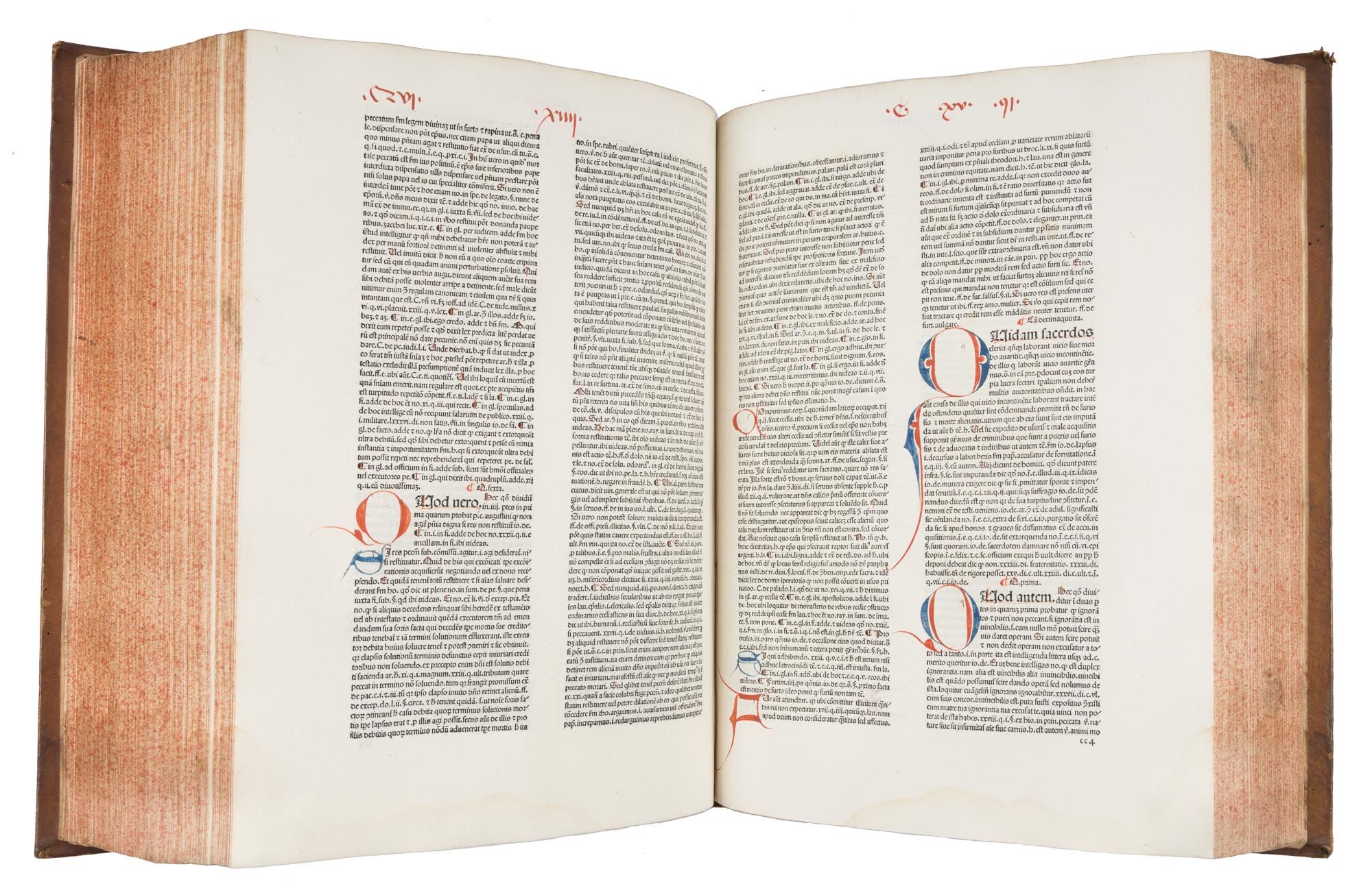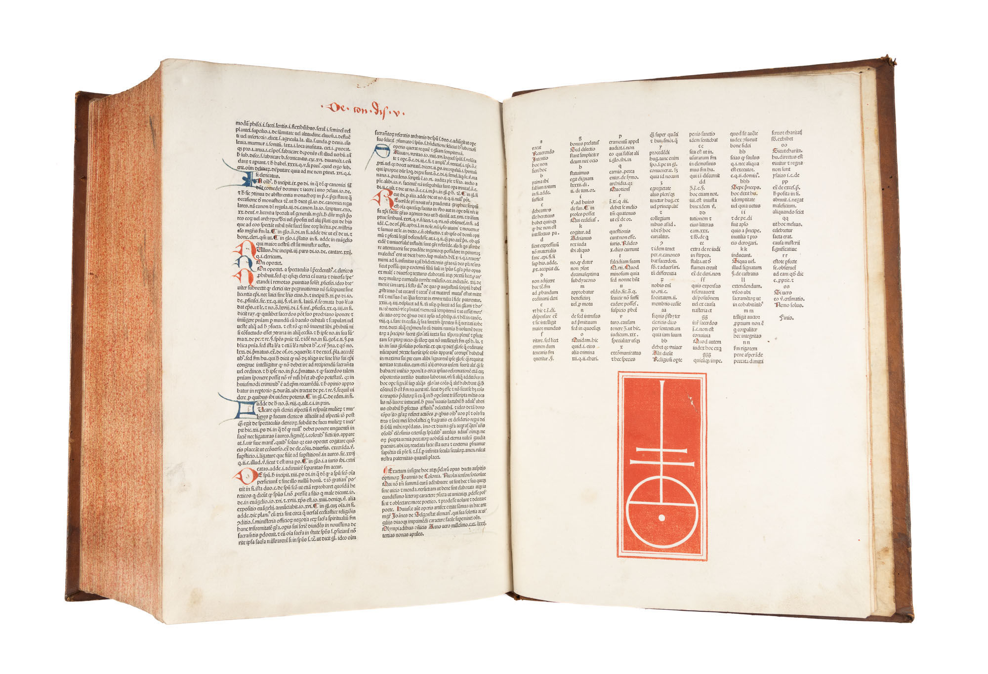 1481. Venice: Nicolaus Jenson, 1481.. Venice: Nicolaus Jenson, 1481. Copy of a 1481 Printing of an Important Gratian Commentary with Handsome Penwork, A Distinguished Provenance and a Bookplate Designed by Picasso [Baysio, Guido de (d. 1313)]. [Moneliensis, Franciscus, Editor]. [Rosarium Decretorum]. [Venice: Johannes Herbort de Seligenstadt for Johannes de Colonia, Nicolaus Jenson, Et Socii, 3 April 1481]. [415] ff. Lacking final leaf, a blank. Collation: a10, b8, c-d10, d-l8, m-n6, o-tuvx8, y10, z8, [et]8, [antisigma]10, [r rotunda]-aa8, bb-cc10, dd-dd8, ee-gg10, ggg-hh8, hhh8, ii10, kk-mm8, nn-qq10, rr8, ss6. Folio (40 x 28cm; 10-3/4" x 15-1/2"). Incunabula Short-Title Catalogue ib00288000 (5 copies in North America, 2 in law libraries: Harvard, UC-Berkeley). Eighteenth-century calf, raised bands, "A L" in small type blind-stamped to foot of front board, blind ornaments and lettering piece to spine, edges speckled, endpapers renewed. Light rubbing and some minor nicks and scuffs to boards, moderate rubbing to extremities, chipping to head of spine, corners bumped and somewhat worn, joints and hinges just starting at head, crack in text block between fol. a1 and a2 (fols. 1-2). 66-line text in parallel columns, 4 large illuminated acanthus initials, one of which with partial border, the other 2 with smaller flourishes, 2 smaller illuminated initials, other red and blue initials and red capital strokes, woodcut printer's device printed in red. Light toning, occasional faint dampstaining to foot of text block, some soiling and light dampstaining to leaf a1 (fol. 1), illuminated borders on first leaf trimmed, lower corner torn away, minor interior tear to printer's device. Bookplate of Alexandre P. Rosenberg, designed by Pablo Picasso, to front pastedown, Rosenberg's brief typewritten book description, with Goff number added in pencil, laid in, owner signature ("Lanoseim") dated 1673 to head of leaf a2 (fol. 2). A remarkable copy. $29,000. **THIS DESCRIPTION IS TRUNCATED DUE TO CHARACTER LIMITS. PLEASE CONTACT US FOR A COMPLETE VERSION.** * The Concordia Discordantia Canonum, or Decretum Gratiani, is the cornerstone of modern canon law and one of the components of the Corpus Juris Canonici. The first work of its kind, it was supposedly compiled by Gratian, a Camaldolese monk, around 1140. It addresses various aspects of legal jurisdiction as well as administrative issues li.